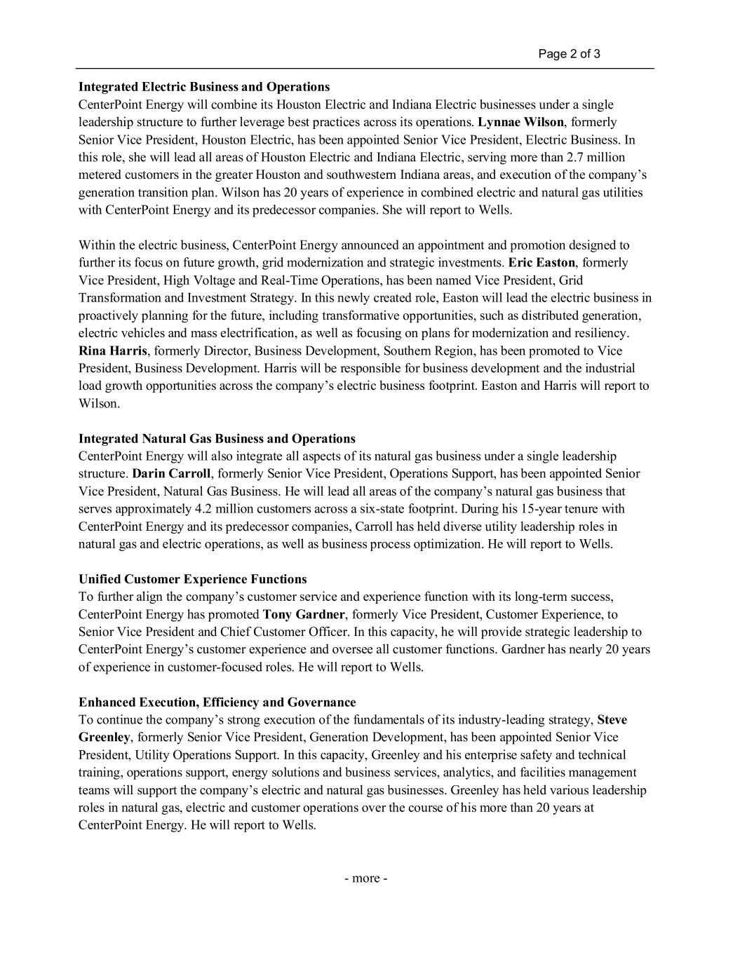 Page 2 of 3 Integrated Electric Business and Operations CenterPoint Energy will combine its Houston Electric and Indiana Electric businesses under a single leadership structure to further leverage best practices across its operations. Lynnae Wilson, formerly Senior Vice President, Houston Electric, has been appointed Senior Vice President, Electric Business. In this role, she will lead all areas of Houston Electric and Indiana Electric, serving more than 2.7 million metered customers in the greater Houston and southwestern Indiana areas, and execution of the company’s generation transition plan. Wilson has 20 years of experience in combined electric and natural gas utilities with CenterPoint Energy and its predecessor companies. She will report to Wells. Within the electric business, CenterPoint Energy announced an appointment and promotion designed to further its focus on future growth, grid modernization and strategic investments. Eric Easton, formerly Vice President, High Voltage and Real-Time Operations, has been named Vice President, Grid Transformation and Investment Strategy. In this newly created role, Easton will lead the electric business in proactively planning for the future, including transformative opportunities, such as distributed generation, electric vehicles and mass electrification, as well as focusing on plans for modernization and resiliency. Rina Harris, formerly Director, Business Development, Southern Region, has been promoted to Vice President, Business Development. Harris will be responsible for business development and the industrial load growth opportunities across the company’s electric business footprint. Easton and Harris will report to Wilson. Integrated Natural Gas Business and Operations CenterPoint Energy will also integrate all aspects of its natural gas business under a single leadership structure. Darin Carroll, formerly Senior Vice President, Operations Support, has been appointed Senior Vice President, Natural Gas Business. He will lead all areas of the company’s natural gas business that serves approximately 4.2 million customers across a six-state footprint. During his 15-year tenure with CenterPoint Energy and its predecessor companies, Carroll has held diverse utility leadership roles in natural gas and electric operations, as well as business process optimization. He will report to Wells. Unified Customer Experience Functions To further align the company’s customer service and experience function with its long-term success, CenterPoint Energy has promoted Tony Gardner, formerly Vice President, Customer Experience, to Senior Vice President and Chief Customer Officer. In this capacity, he will provide strategic leadership to CenterPoint Energy’s customer experience and oversee all customer functions. Gardner has nearly 20 years of experience in customer-focused roles. He will report to Wells. Enhanced Execution, Efficiency and Governance To continue the company’s strong execution of the fundamentals of its industry-leading strategy, Steve Greenley, formerly Senior Vice President, Generation Development, has been appointed Senior Vice President, Utility Operations Support. In this capacity, Greenley and his enterprise safety and technical training, operations support, energy solutions and business services, analytics, and facilities management teams will support the company’s electric and natural gas businesses. Greenley has held various leadership roles in natural gas, electric and customer operations over the course of his more than 20 years at CenterPoint Energy. He will report to Wells. - more -