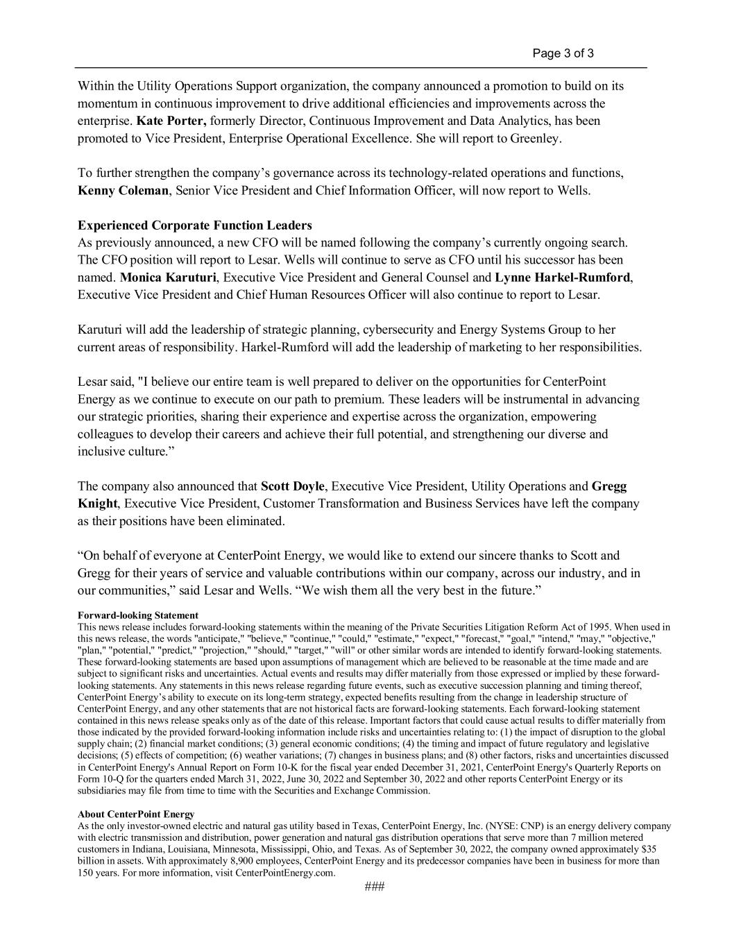 Page 3 of 3 Within the Utility Operations Support organization, the company announced a promotion to build on its momentum in continuous improvement to drive additional efficiencies and improvements across the enterprise. Kate Porter, formerly Director, Continuous Improvement and Data Analytics, has been promoted to Vice President, Enterprise Operational Excellence. She will report to Greenley. To further strengthen the company’s governance across its technology-related operations and functions, Kenny Coleman, Senior Vice President and Chief Information Officer, will now report to Wells. Experienced Corporate Function Leaders As previously announced, a new CFO will be named following the company’s currently ongoing search. The CFO position will report to Lesar. Wells will continue to serve as CFO until his successor has been named. Monica Karuturi, Executive Vice President and General Counsel and Lynne Harkel-Rumford, Executive Vice President and Chief Human Resources Officer will also continue to report to Lesar. Karuturi will add the leadership of strategic planning, cybersecurity and Energy Systems Group to her current areas of responsibility. Harkel-Rumford will add the leadership of marketing to her responsibilities. Lesar said, "I believe our entire team is well prepared to deliver on the opportunities for CenterPoint Energy as we continue to execute on our path to premium. These leaders will be instrumental in advancing our strategic priorities, sharing their experience and expertise across the organization, empowering colleagues to develop their careers and achieve their full potential, and strengthening our diverse and inclusive culture.” The company also announced that Scott Doyle, Executive Vice President, Utility Operations and Gregg Knight, Executive Vice President, Customer Transformation and Business Services have left the company as their positions have been eliminated. “On behalf of everyone at CenterPoint Energy, we would like to extend our sincere thanks to Scott and Gregg for their years of service and valuable contributions within our company, across our industry, and in our communities,” said Lesar and Wells. “We wish them all the very best in the future.” Forward-looking Statement This news release includes forward-looking statements within the meaning of the Private Securities Litigation Reform Act of 1995. When used in this news release, the words "anticipate," "believe," "continue," "could," "estimate," "expect," "forecast," "goal," "intend," "may," "objective," "plan," "potential," "predict," "projection," "should," "target," "will" or other similar words are intended to identify forward-looking statements. These forward-looking statements are based upon assumptions of management which are believed to be reasonable at the time made and are subject to significant risks and uncertainties. Actual events and results may differ materially from those expressed or implied by these forward- looking statements. Any statements in this news release regarding future events, such as executive succession planning and timing thereof, CenterPoint Energy’s ability to execute on its long-term strategy, expected benefits resulting from the change in leadership structure of CenterPoint Energy, and any other statements that are not historical facts are forward-looking statements. Each forward-looking statement contained in this news release speaks only as of the date of this release. Important factors that could cause actual results to differ materially from those indicated by the provided forward-looking information include risks and uncertainties relating to: (1) the impact of disruption to the global supply chain; (2) financial market conditions; (3) general economic conditions; (4) the timing and impact of future regulatory and legislative decisions; (5) effects of competition; (6) weather variations; (7) changes in business plans; and (8) other factors, risks and uncertainties discussed in CenterPoint Energy's Annual Report on Form 10-K for the fiscal year ended December 31, 2021, CenterPoint Energy's Quarterly Reports on Form 10-Q for the quarters ended March 31, 2022, June 30, 2022 and September 30, 2022 and other reports CenterPoint Energy or its subsidiaries may file from time to time with the Securities and Exchange Commission. About CenterPoint Energy As the only investor-owned electric and natural gas utility based in Texas, CenterPoint Energy, Inc. (NYSE: CNP) is an energy delivery company with electric transmission and distribution, power generation and natural gas distribution operations that serve more than 7 million metered customers in Indiana, Louisiana, Minnesota, Mississippi, Ohio, and Texas. As of September 30, 2022, the company owned approximately $35 billion in assets. With approximately 8,900 employees, CenterPoint Energy and its predecessor companies have been in business for more than 150 years. For more information, visit CenterPointEnergy.com. ###