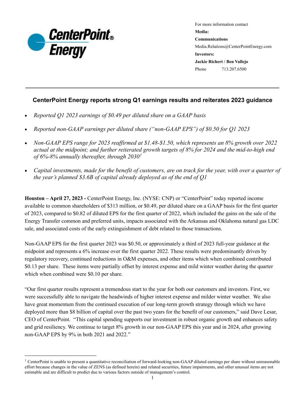 1 CenterPoint Energy reports strong Q1 earnings results and reiterates 2023 guidance • Reported Q1 2023 earnings of $0.49 per diluted share on a GAAP basis • Reported non-GAAP earnings per diluted share (“non-GAAP EPS”) of $0.50 for Q1 2023 • Non-GAAP EPS range for 2023 reaffirmed at $1.48-$1.50, which represents an 8% growth over 2022 actual at the midpoint; and further reiterated growth targets of 8% for 2024 and the mid-to-high end of 6%-8% annually thereafter, through 20301 • Capital investments, made for the benefit of customers, are on track for the year, with over a quarter of the year’s planned $3.6B of capital already deployed as of the end of Q1 Houston – April 27, 2023 - CenterPoint Energy, Inc. (NYSE: CNP) or “CenterPoint” today reported income available to common shareholders of $313 million, or $0.49, per diluted share on a GAAP basis for the first quarter of 2023, compared to $0.82 of diluted EPS for the first quarter of 2022, which included the gains on the sale of the Energy Transfer common and preferred units, impacts associated with the Arkansas and Oklahoma natural gas LDC sale, and associated costs of the early extinguishment of debt related to those transactions. Non-GAAP EPS for the first quarter 2023 was $0.50, or approximately a third of 2023 full-year guidance at the midpoint and represents a 6% increase over the first quarter 2022. These results were predominantly driven by regulatory recovery, continued reductions in O&M expenses, and other items which when combined contributed $0.13 per share. These items were partially offset by interest expense and mild winter weather during the quarter which when combined were $0.10 per share. “Our first quarter results represent a tremendous start to the year for both our customers and investors. First, we were successfully able to navigate the headwinds of higher interest expense and milder winter weather. We also have great momentum from the continued execution of our long-term growth strategy through which we have deployed more than $8 billion of capital over the past two years for the benefit of our customers,” said Dave Lesar, CEO of CenterPoint. “This capital spending supports our investment in robust organic growth and enhances safety and grid resiliency. We continue to target 8% growth in our non-GAAP EPS this year and in 2024, after growing non-GAAP EPS by 9% in both 2021 and 2022.” 1 CenterPoint is unable to present a quantitative reconciliation of forward-looking non-GAAP diluted earnings per share without unreasonable effort because changes in the value of ZENS (as defined herein) and related securities, future impairments, and other unusual items are not estimable and are difficult to predict due to various factors outside of management’s control. For more information contact Media: Communications Media.Relations@CenterPointEnergy.com Investors: Jackie Richert / Ben Vallejo Phone 713.207.6500