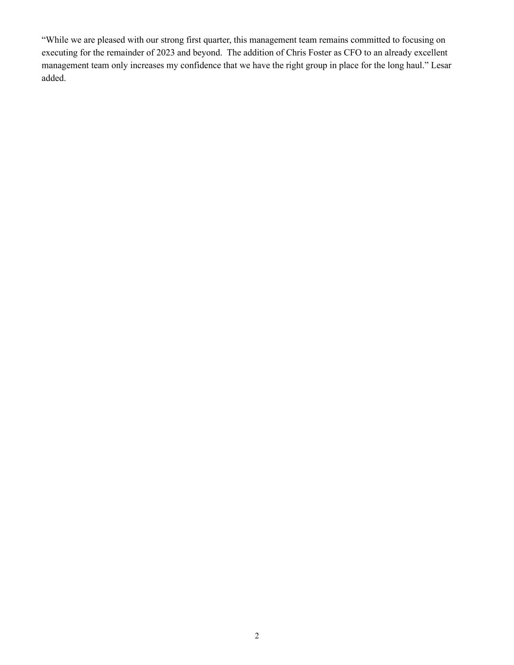 2 “While we are pleased with our strong first quarter, this management team remains committed to focusing on executing for the remainder of 2023 and beyond. The addition of Chris Foster as CFO to an already excellent management team only increases my confidence that we have the right group in place for the long haul.” Lesar added.