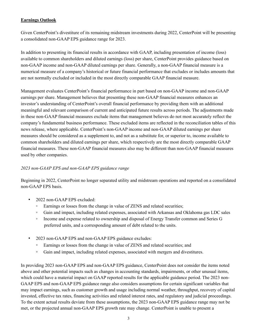 3 Earnings Outlook Given CenterPoint’s divestiture of its remaining midstream investments during 2022, CenterPoint will be presenting a consolidated non-GAAP EPS guidance range for 2023. In addition to presenting its financial results in accordance with GAAP, including presentation of income (loss) available to common shareholders and diluted earnings (loss) per share, CenterPoint provides guidance based on non-GAAP income and non-GAAP diluted earnings per share. Generally, a non-GAAP financial measure is a numerical measure of a company’s historical or future financial performance that excludes or includes amounts that are not normally excluded or included in the most directly comparable GAAP financial measure. Management evaluates CenterPoint’s financial performance in part based on non-GAAP income and non-GAAP earnings per share. Management believes that presenting these non-GAAP financial measures enhances an investor’s understanding of CenterPoint’s overall financial performance by providing them with an additional meaningful and relevant comparison of current and anticipated future results across periods. The adjustments made in these non-GAAP financial measures exclude items that management believes do not most accurately reflect the company’s fundamental business performance. These excluded items are reflected in the reconciliation tables of this news release, where applicable. CenterPoint’s non-GAAP income and non-GAAP diluted earnings per share measures should be considered as a supplement to, and not as a substitute for, or superior to, income available to common shareholders and diluted earnings per share, which respectively are the most directly comparable GAAP financial measures. These non-GAAP financial measures also may be different than non-GAAP financial measures used by other companies. 2023 non-GAAP EPS and non-GAAP EPS guidance range Beginning in 2022, CenterPoint no longer separated utility and midstream operations and reported on a consolidated non-GAAP EPS basis. • 2022 non-GAAP EPS excluded: ◦ Earnings or losses from the change in value of ZENS and related securities; ◦ Gain and impact, including related expenses, associated with Arkansas and Oklahoma gas LDC sales ◦ Income and expense related to ownership and disposal of Energy Transfer common and Series G preferred units, and a corresponding amount of debt related to the units. • 2023 non-GAAP EPS and non-GAAP EPS guidance excludes: ◦ Earnings or losses from the change in value of ZENS and related securities; and ◦ Gain and impact, including related expenses, associated with mergers and divestitures. In providing 2023 non-GAAP EPS and non-GAAP EPS guidance, CenterPoint does not consider the items noted above and other potential impacts such as changes in accounting standards, impairments, or other unusual items, which could have a material impact on GAAP reported results for the applicable guidance period. The 2023 non- GAAP EPS and non-GAAP EPS guidance range also considers assumptions for certain significant variables that may impact earnings, such as customer growth and usage including normal weather, throughput, recovery of capital invested, effective tax rates, financing activities and related interest rates, and regulatory and judicial proceedings. To the extent actual results deviate from these assumptions, the 2023 non-GAAP EPS guidance range may not be met, or the projected annual non-GAAP EPS growth rate may change. CenterPoint is unable to present a