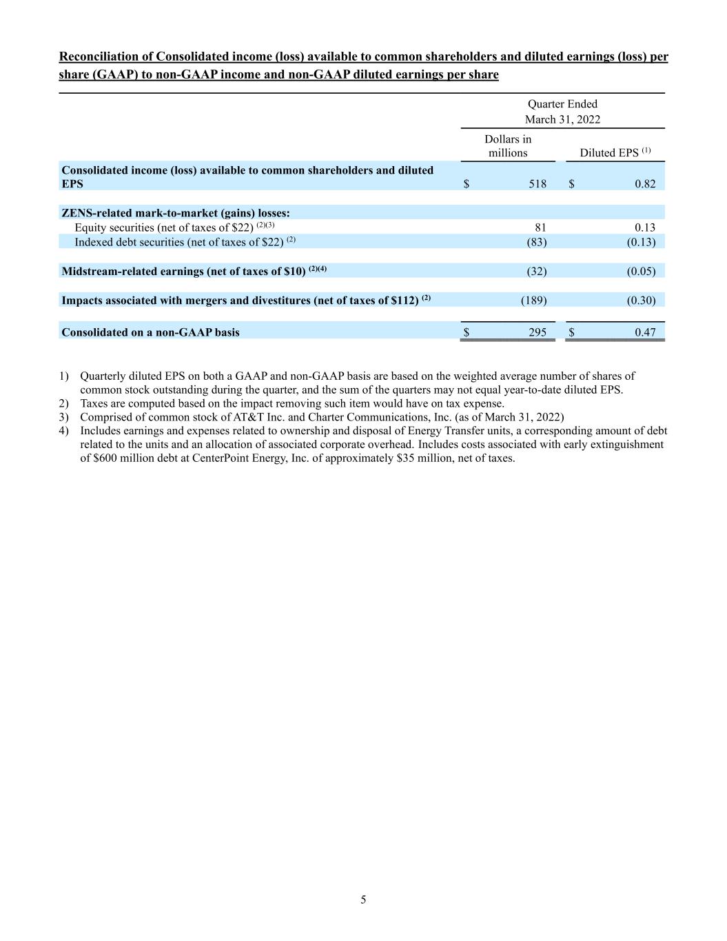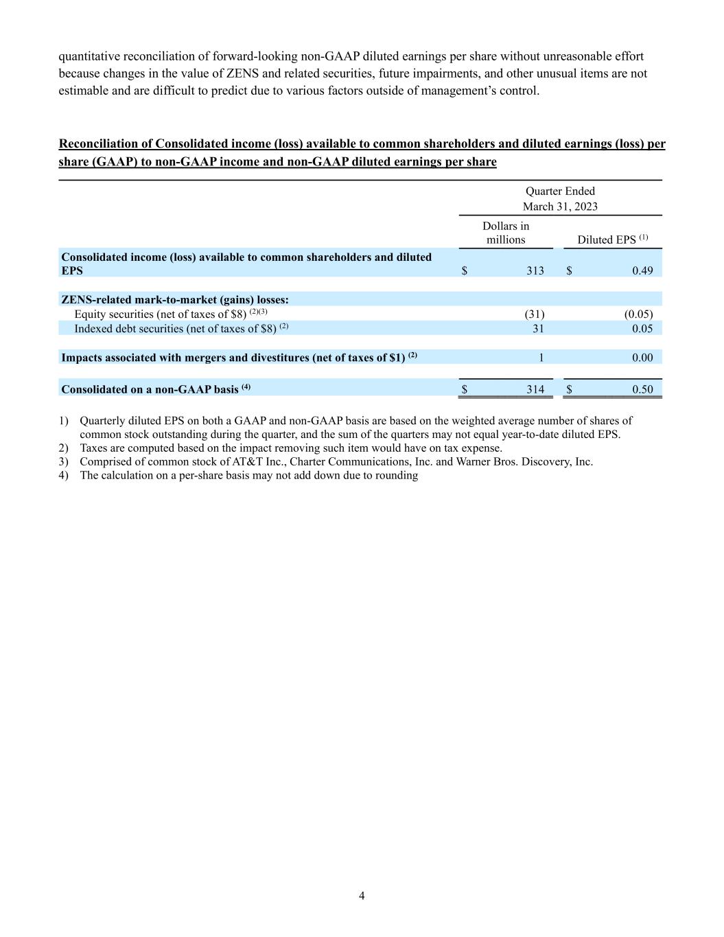 4 quantitative reconciliation of forward-looking non-GAAP diluted earnings per share without unreasonable effort because changes in the value of ZENS and related securities, future impairments, and other unusual items are not estimable and are difficult to predict due to various factors outside of management’s control. Reconciliation of Consolidated income (loss) available to common shareholders and diluted earnings (loss) per share (GAAP) to non-GAAP income and non-GAAP diluted earnings per share Quarter Ended March 31, 2023 Dollars in millions Diluted EPS (1) Consolidated income (loss) available to common shareholders and diluted EPS $ 313 $ 0.49 ZENS-related mark-to-market (gains) losses: Equity securities (net of taxes of $8) (2)(3) (31) (0.05) Indexed debt securities (net of taxes of $8) (2) 31 0.05 Impacts associated with mergers and divestitures (net of taxes of $1) (2) 1 0.00 Consolidated on a non-GAAP basis (4) $ 314 $ 0.50 1) Quarterly diluted EPS on both a GAAP and non-GAAP basis are based on the weighted average number of shares of common stock outstanding during the quarter, and the sum of the quarters may not equal year-to-date diluted EPS. 2) Taxes are computed based on the impact removing such item would have on tax expense. 3) Comprised of common stock of AT&T Inc., Charter Communications, Inc. and Warner Bros. Discovery, Inc. 4) The calculation on a per-share basis may not add down due to rounding