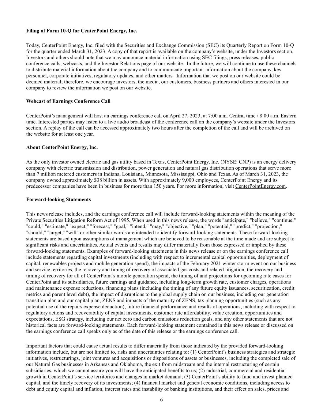6 Filing of Form 10-Q for CenterPoint Energy, Inc. Today, CenterPoint Energy, Inc. filed with the Securities and Exchange Commission (SEC) its Quarterly Report on Form 10-Q for the quarter ended March 31, 2023. A copy of that report is available on the company’s website, under the Investors section. Investors and others should note that we may announce material information using SEC filings, press releases, public conference calls, webcasts, and the Investor Relations page of our website. In the future, we will continue to use these channels to distribute material information about the company and to communicate important information about the company, key personnel, corporate initiatives, regulatory updates, and other matters. Information that we post on our website could be deemed material; therefore, we encourage investors, the media, our customers, business partners and others interested in our company to review the information we post on our website. Webcast of Earnings Conference Call CenterPoint’s management will host an earnings conference call on April 27, 2023, at 7:00 a.m. Central time / 8:00 a.m. Eastern time. Interested parties may listen to a live audio broadcast of the conference call on the company’s website under the Investors section. A replay of the call can be accessed approximately two hours after the completion of the call and will be archived on the website for at least one year. About CenterPoint Energy, Inc. As the only investor owned electric and gas utility based in Texas, CenterPoint Energy, Inc. (NYSE: CNP) is an energy delivery company with electric transmission and distribution, power generation and natural gas distribution operations that serve more than 7 million metered customers in Indiana, Louisiana, Minnesota, Mississippi, Ohio and Texas. As of March 31, 2023, the company owned approximately $38 billion in assets. With approximately 9,000 employees, CenterPoint Energy and its predecessor companies have been in business for more than 150 years. For more information, visit CenterPointEnergy.com. Forward-looking Statements This news release includes, and the earnings conference call will include forward-looking statements within the meaning of the Private Securities Litigation Reform Act of 1995. When used in this news release, the words "anticipate," "believe," "continue," "could," "estimate," "expect," "forecast," "goal," "intend," "may," "objective," "plan," "potential," "predict," "projection," "should," "target," "will" or other similar words are intended to identify forward-looking statements. These forward-looking statements are based upon assumptions of management which are believed to be reasonable at the time made and are subject to significant risks and uncertainties. Actual events and results may differ materially from those expressed or implied by these forward-looking statements. Examples of forward-looking statements in this news release or on the earnings conference call include statements regarding capital investments (including with respect to incremental capital opportunities, deployment of capital, renewables projects and mobile generation spend), the impacts of the February 2021 winter storm event on our business and service territories, the recovery and timing of recovery of associated gas costs and related litigation, the recovery and timing of recovery for all of CenterPoint’s mobile generation spend, the timing of and projections for upcoming rate cases for CenterPoint and its subsidiaries, future earnings and guidance, including long-term growth rate, customer charges, operations and maintenance expense reductions, financing plans (including the timing of any future equity issuances, securitization, credit metrics and parent level debt), the impact of disruptions to the global supply chain on our business, including our generation transition plan and our capital plan, ZENS and impacts of the maturity of ZENS, tax planning opportunities (such as any potential use of the repairs expense deduction), future financial performance and results of operations, including with respect to regulatory actions and recoverability of capital investments, customer rate affordability, value creation, opportunities and expectations, ESG strategy, including our net zero and carbon emissions reduction goals, and any other statements that are not historical facts are forward-looking statements. Each forward-looking statement contained in this news release or discussed on the earnings conference call speaks only as of the date of this release or the earnings conference call. Important factors that could cause actual results to differ materially from those indicated by the provided forward-looking information include, but are not limited to, risks and uncertainties relating to: (1) CenterPoint’s business strategies and strategic initiatives, restructurings, joint ventures and acquisitions or dispositions of assets or businesses, including the completed sale of our Natural Gas businesses in Arkansas and Oklahoma, the exit from midstream and the internal restructuring of certain subsidiaries, which we cannot assure you will have the anticipated benefits to us; (2) industrial, commercial and residential growth in CenterPoint’s service territories and changes in market demand; (3) CenterPoint’s ability to fund and invest planned capital, and the timely recovery of its investments; (4) financial market and general economic conditions, including access to debt and equity capital and inflation, interest rates and instability of banking institutions, and their effect on sales, prices and