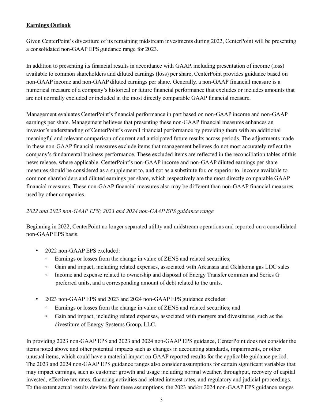 3 Earnings Outlook Given CenterPoint’s divestiture of its remaining midstream investments during 2022, CenterPoint will be presenting a consolidated non-GAAP EPS guidance range for 2023. In addition to presenting its financial results in accordance with GAAP, including presentation of income (loss) available to common shareholders and diluted earnings (loss) per share, CenterPoint provides guidance based on non-GAAP income and non-GAAP diluted earnings per share. Generally, a non-GAAP financial measure is a numerical measure of a company’s historical or future financial performance that excludes or includes amounts that are not normally excluded or included in the most directly comparable GAAP financial measure. Management evaluates CenterPoint’s financial performance in part based on non-GAAP income and non-GAAP earnings per share. Management believes that presenting these non-GAAP financial measures enhances an investor’s understanding of CenterPoint’s overall financial performance by providing them with an additional meaningful and relevant comparison of current and anticipated future results across periods. The adjustments made in these non-GAAP financial measures exclude items that management believes do not most accurately reflect the company’s fundamental business performance. These excluded items are reflected in the reconciliation tables of this news release, where applicable. CenterPoint’s non-GAAP income and non-GAAP diluted earnings per share measures should be considered as a supplement to, and not as a substitute for, or superior to, income available to common shareholders and diluted earnings per share, which respectively are the most directly comparable GAAP financial measures. These non-GAAP financial measures also may be different than non-GAAP financial measures used by other companies. 2022 and 2023 non-GAAP EPS; 2023 and 2024 non-GAAP EPS guidance range Beginning in 2022, CenterPoint no longer separated utility and midstream operations and reported on a consolidated non-GAAP EPS basis. • 2022 non-GAAP EPS excluded: ◦ Earnings or losses from the change in value of ZENS and related securities; ◦ Gain and impact, including related expenses, associated with Arkansas and Oklahoma gas LDC sales ◦ Income and expense related to ownership and disposal of Energy Transfer common and Series G preferred units, and a corresponding amount of debt related to the units. • 2023 non-GAAP EPS and 2023 and 2024 non-GAAP EPS guidance excludes: ◦ Earnings or losses from the change in value of ZENS and related securities; and ◦ Gain and impact, including related expenses, associated with mergers and divestitures, such as the divestiture of Energy Systems Group, LLC. In providing 2023 non-GAAP EPS and 2023 and 2024 non-GAAP EPS guidance, CenterPoint does not consider the items noted above and other potential impacts such as changes in accounting standards, impairments, or other unusual items, which could have a material impact on GAAP reported results for the applicable guidance period. The 2023 and 2024 non-GAAP EPS guidance ranges also consider assumptions for certain significant variables that may impact earnings, such as customer growth and usage including normal weather, throughput, recovery of capital invested, effective tax rates, financing activities and related interest rates, and regulatory and judicial proceedings. To the extent actual results deviate from these assumptions, the 2023 and/or 2024 non-GAAP EPS guidance ranges