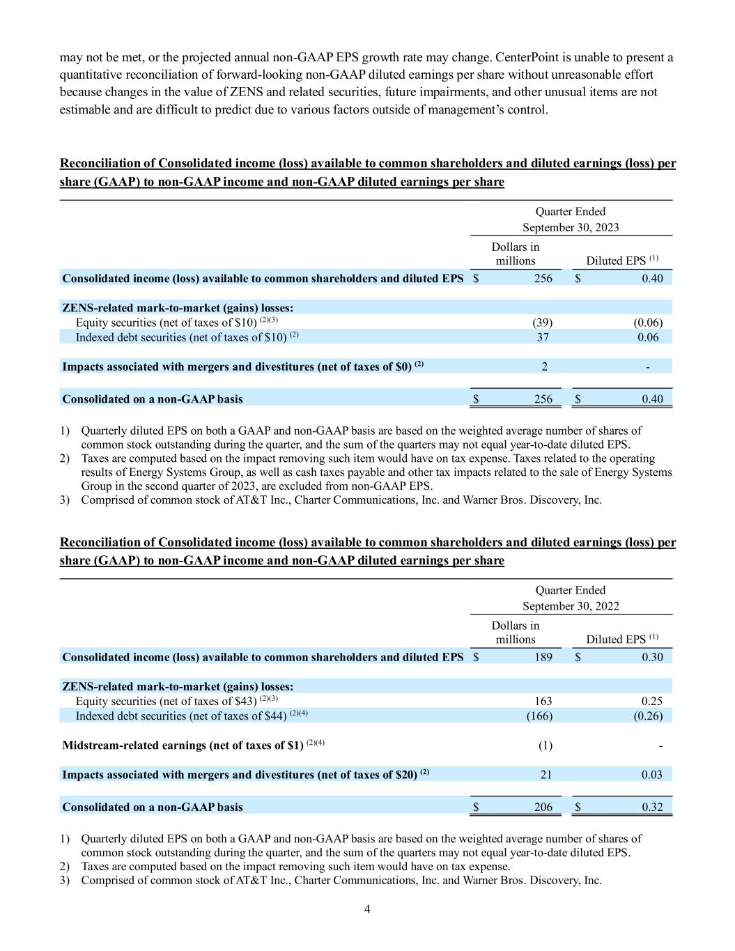 4 may not be met, or the projected annual non-GAAP EPS growth rate may change. CenterPoint is unable to present a quantitative reconciliation of forward-looking non-GAAP diluted earnings per share without unreasonable effort because changes in the value of ZENS and related securities, future impairments, and other unusual items are not estimable and are difficult to predict due to various factors outside of management’s control. Reconciliation of Consolidated income (loss) available to common shareholders and diluted earnings (loss) per share (GAAP) to non-GAAP income and non-GAAP diluted earnings per share Quarter Ended September 30, 2023 Dollars in millions Diluted EPS (1) Consolidated income (loss) available to common shareholders and diluted EPS $ 256 $ 0.40 ZENS-related mark-to-market (gains) losses: Equity securities (net of taxes of $10) (2)(3) (39) (0.06) Indexed debt securities (net of taxes of $10) (2) 37 0.06 Impacts associated with mergers and divestitures (net of taxes of $0) (2) 2 - Consolidated on a non-GAAP basis $ 256 $ 0.40 1) Quarterly diluted EPS on both a GAAP and non-GAAP basis are based on the weighted average number of shares of common stock outstanding during the quarter, and the sum of the quarters may not equal year-to-date diluted EPS. 2) Taxes are computed based on the impact removing such item would have on tax expense. Taxes related to the operating results of Energy Systems Group, as well as cash taxes payable and other tax impacts related to the sale of Energy Systems Group in the second quarter of 2023, are excluded from non-GAAP EPS. 3) Comprised of common stock of AT&T Inc., Charter Communications, Inc. and Warner Bros. Discovery, Inc. Reconciliation of Consolidated income (loss) available to common shareholders and diluted earnings (loss) per share (GAAP) to non-GAAP income and non-GAAP diluted earnings per share Quarter Ended September 30, 2022 Dollars in millions Diluted EPS (1) Consolidated income (loss) available to common shareholders and diluted EPS $ 189 $ 0.30 ZENS-related mark-to-market (gains) losses: Equity securities (net of taxes of $43) (2)(3) 163 0.25 Indexed debt securities (net of taxes of $44) (2)(4) (166) (0.26) Midstream-related earnings (net of taxes of $1) (2)(4) (1) - Impacts associated with mergers and divestitures (net of taxes of $20) (2) 21 0.03 Consolidated on a non-GAAP basis $ 206 $ 0.32 1) Quarterly diluted EPS on both a GAAP and non-GAAP basis are based on the weighted average number of shares of common stock outstanding during the quarter, and the sum of the quarters may not equal year-to-date diluted EPS. 2) Taxes are computed based on the impact removing such item would have on tax expense. 3) Comprised of common stock of AT&T Inc., Charter Communications, Inc. and Warner Bros. Discovery, Inc.