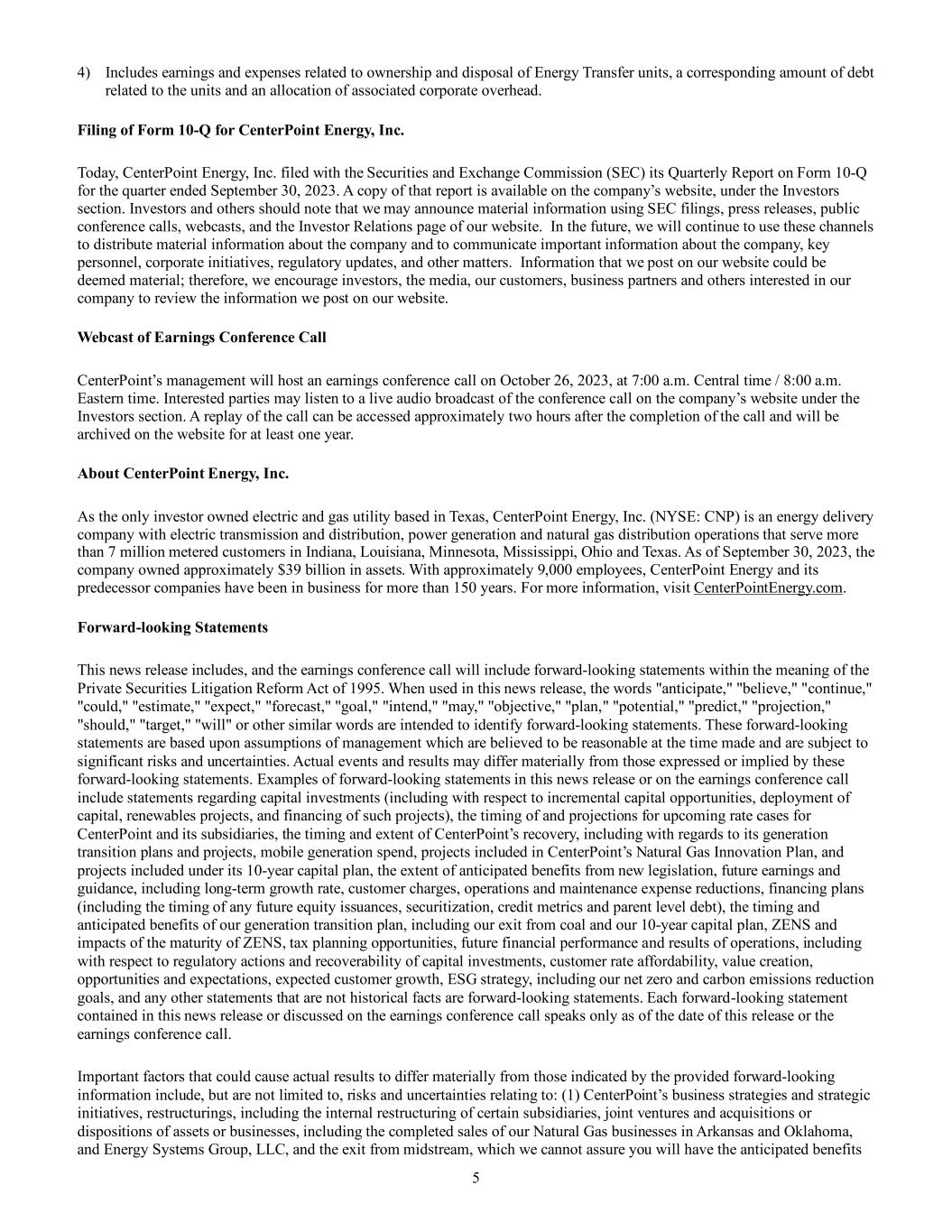 5 4) Includes earnings and expenses related to ownership and disposal of Energy Transfer units, a corresponding amount of debt related to the units and an allocation of associated corporate overhead. Filing of Form 10-Q for CenterPoint Energy, Inc. Today, CenterPoint Energy, Inc. filed with the Securities and Exchange Commission (SEC) its Quarterly Report on Form 10-Q for the quarter ended September 30, 2023. A copy of that report is available on the company’s website, under the Investors section. Investors and others should note that we may announce material information using SEC filings, press releases, public conference calls, webcasts, and the Investor Relations page of our website. In the future, we will continue to use these channels to distribute material information about the company and to communicate important information about the company, key personnel, corporate initiatives, regulatory updates, and other matters. Information that we post on our website could be deemed material; therefore, we encourage investors, the media, our customers, business partners and others interested in our company to review the information we post on our website. Webcast of Earnings Conference Call CenterPoint’s management will host an earnings conference call on October 26, 2023, at 7:00 a.m. Central time / 8:00 a.m. Eastern time. Interested parties may listen to a live audio broadcast of the conference call on the company’s website under the Investors section. A replay of the call can be accessed approximately two hours after the completion of the call and will be archived on the website for at least one year. About CenterPoint Energy, Inc. As the only investor owned electric and gas utility based in Texas, CenterPoint Energy, Inc. (NYSE: CNP) is an energy delivery company with electric transmission and distribution, power generation and natural gas distribution operations that serve more than 7 million metered customers in Indiana, Louisiana, Minnesota, Mississippi, Ohio and Texas. As of September 30, 2023, the company owned approximately $39 billion in assets. With approximately 9,000 employees, CenterPoint Energy and its predecessor companies have been in business for more than 150 years. For more information, visit CenterPointEnergy.com. Forward-looking Statements This news release includes, and the earnings conference call will include forward-looking statements within the meaning of the Private Securities Litigation Reform Act of 1995. When used in this news release, the words "anticipate," "believe," "continue," "could," "estimate," "expect," "forecast," "goal," "intend," "may," "objective," "plan," "potential," "predict," "projection," "should," "target," "will" or other similar words are intended to identify forward-looking statements. These forward-looking statements are based upon assumptions of management which are believed to be reasonable at the time made and are subject to significant risks and uncertainties. Actual events and results may differ materially from those expressed or implied by these forward-looking statements. Examples of forward-looking statements in this news release or on the earnings conference call include statements regarding capital investments (including with respect to incremental capital opportunities, deployment of capital, renewables projects, and financing of such projects), the timing of and projections for upcoming rate cases for CenterPoint and its subsidiaries, the timing and extent of CenterPoint’s recovery, including with regards to its generation transition plans and projects, mobile generation spend, projects included in CenterPoint’s Natural Gas Innovation Plan, and projects included under its 10-year capital plan, the extent of anticipated benefits from new legislation, future earnings and guidance, including long-term growth rate, customer charges, operations and maintenance expense reductions, financing plans (including the timing of any future equity issuances, securitization, credit metrics and parent level debt), the timing and anticipated benefits of our generation transition plan, including our exit from coal and our 10-year capital plan, ZENS and impacts of the maturity of ZENS, tax planning opportunities, future financial performance and results of operations, including with respect to regulatory actions and recoverability of capital investments, customer rate affordability, value creation, opportunities and expectations, expected customer growth, ESG strategy, including our net zero and carbon emissions reduction goals, and any other statements that are not historical facts are forward-looking statements. Each forward-looking statement contained in this news release or discussed on the earnings conference call speaks only as of the date of this release or the earnings conference call. Important factors that could cause actual results to differ materially from those indicated by the provided forward-looking information include, but are not limited to, risks and uncertainties relating to: (1) CenterPoint’s business strategies and strategic initiatives, restructurings, including the internal restructuring of certain subsidiaries, joint ventures and acquisitions or dispositions of assets or businesses, including the completed sales of our Natural Gas businesses in Arkansas and Oklahoma, and Energy Systems Group, LLC, and the exit from midstream, which we cannot assure you will have the anticipated benefits