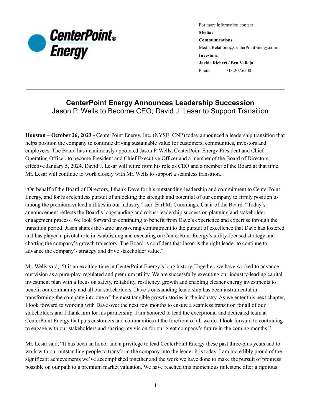 1 CenterPoint Energy Announces Leadership Succession Jason P. Wells to Become CEO; David J. Lesar to Support Transition Houston – October 26, 2023 - CenterPoint Energy, Inc. (NYSE: CNP) today announced a leadership transition that helps position the company to continue driving sustainable value for customers, communities, investors and employees. The Board has unanimously appointed Jason P. Wells, CenterPoint Energy President and Chief Operating Officer, to become President and Chief Executive Officer and a member of the Board of Directors, effective January 5, 2024. David J. Lesar will retire from his role as CEO and a member of the Board at that time. Mr. Lesar will continue to work closely with Mr. Wells to support a seamless transition. “On behalf of the Board of Directors, I thank Dave for his outstanding leadership and commitment to CenterPoint Energy, and for his relentless pursuit of unlocking the strength and potential of our company to firmly position us among the premium-valued utilities in our industry,” said Earl M. Cummings, Chair of the Board. “Today’s announcement reflects the Board’s longstanding and robust leadership succession planning and stakeholder engagement process. We look forward to continuing to benefit from Dave’s experience and expertise through the transition period. Jason shares the same unwavering commitment to the pursuit of excellence that Dave has fostered and has played a pivotal role in establishing and executing on CenterPoint Energy’s utility-focused strategy and charting the company’s growth trajectory. The Board is confident that Jason is the right leader to continue to advance the company’s strategy and drive stakeholder value.” Mr. Wells said, “It is an exciting time in CenterPoint Energy’s long history. Together, we have worked to advance our vision as a pure-play, regulated and premium utility. We are successfully executing our industry-leading capital investment plan with a focus on safety, reliability, resiliency, growth and enabling cleaner energy investments to benefit our community and all our stakeholders. Dave’s outstanding leadership has been instrumental in transforming the company into one of the most tangible growth stories in the industry. As we enter this next chapter, I look forward to working with Dave over the next few months to ensure a seamless transition for all of our stakeholders and I thank him for his partnership. I am honored to lead the exceptional and dedicated team at CenterPoint Energy that puts customers and communities at the forefront of all we do. I look forward to continuing to engage with our stakeholders and sharing my vision for our great company’s future in the coming months.” Mr. Lesar said, “It has been an honor and a privilege to lead CenterPoint Energy these past three-plus years and to work with our outstanding people to transform the company into the leader it is today. I am incredibly proud of the significant achievements we’ve accomplished together and the work we have done to make the pursuit of progress possible on our path to a premium market valuation. We have reached this momentous milestone after a rigorous For more information contact Media: Communications Media.Relations@CenterPointEnergy.com Investors: Jackie Richert / Ben Vallejo Phone 713.207.6500