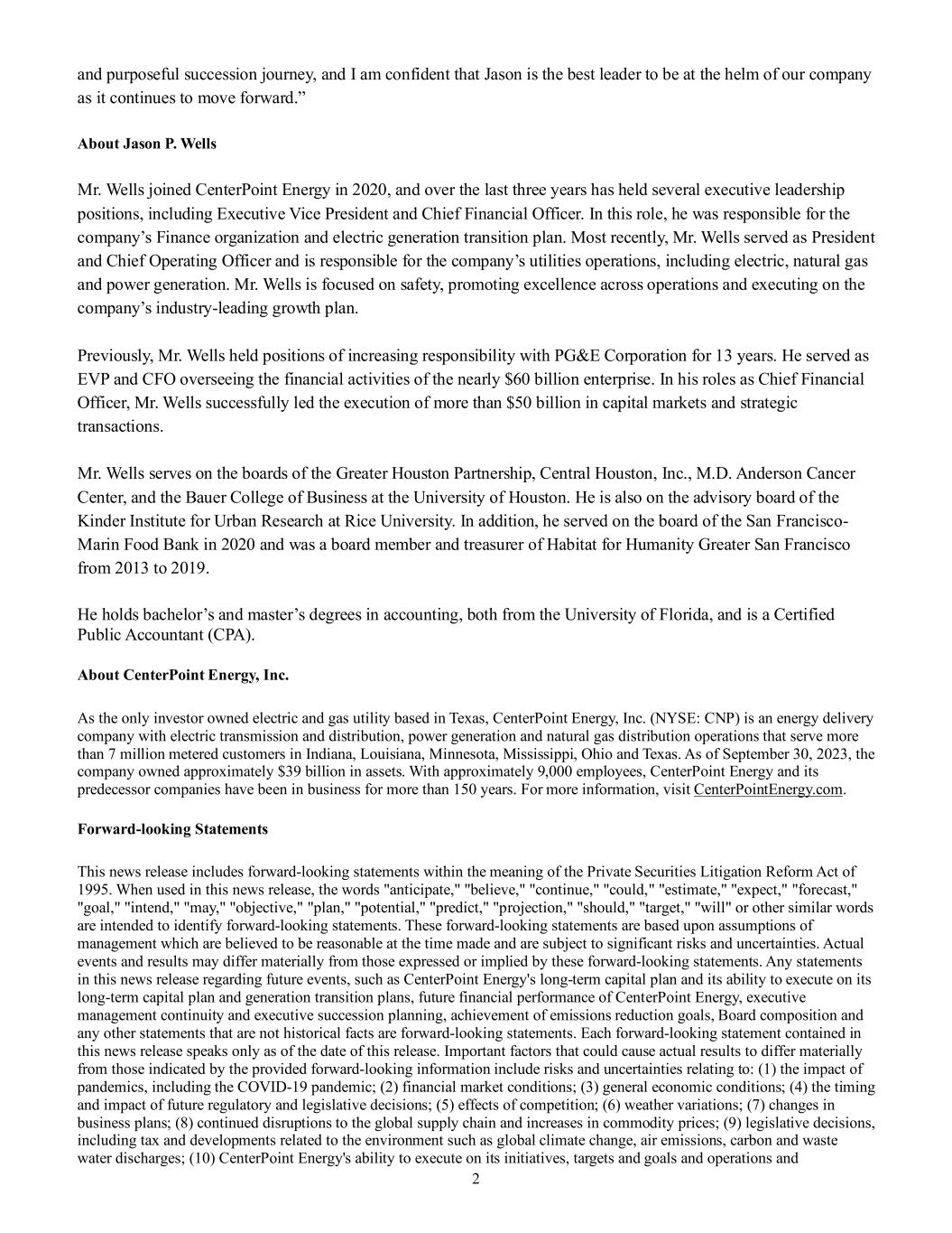 2 and purposeful succession journey, and I am confident that Jason is the best leader to be at the helm of our company as it continues to move forward.” About Jason P. Wells Mr. Wells joined CenterPoint Energy in 2020, and over the last three years has held several executive leadership positions, including Executive Vice President and Chief Financial Officer. In this role, he was responsible for the company’s Finance organization and electric generation transition plan. Most recently, Mr. Wells served as President and Chief Operating Officer and is responsible for the company’s utilities operations, including electric, natural gas and power generation. Mr. Wells is focused on safety, promoting excellence across operations and executing on the company’s industry-leading growth plan. Previously, Mr. Wells held positions of increasing responsibility with PG&E Corporation for 13 years. He served as EVP and CFO overseeing the financial activities of the nearly $60 billion enterprise. In his roles as Chief Financial Officer, Mr. Wells successfully led the execution of more than $50 billion in capital markets and strategic transactions. Mr. Wells serves on the boards of the Greater Houston Partnership, Central Houston, Inc., M.D. Anderson Cancer Center, and the Bauer College of Business at the University of Houston. He is also on the advisory board of the Kinder Institute for Urban Research at Rice University. In addition, he served on the board of the San Francisco- Marin Food Bank in 2020 and was a board member and treasurer of Habitat for Humanity Greater San Francisco from 2013 to 2019. He holds bachelor’s and master’s degrees in accounting, both from the University of Florida, and is a Certified Public Accountant (CPA). About CenterPoint Energy, Inc. As the only investor owned electric and gas utility based in Texas, CenterPoint Energy, Inc. (NYSE: CNP) is an energy delivery company with electric transmission and distribution, power generation and natural gas distribution operations that serve more than 7 million metered customers in Indiana, Louisiana, Minnesota, Mississippi, Ohio and Texas. As of September 30, 2023, the company owned approximately $39 billion in assets. With approximately 9,000 employees, CenterPoint Energy and its predecessor companies have been in business for more than 150 years. For more information, visit CenterPointEnergy.com. Forward-looking Statements This news release includes forward-looking statements within the meaning of the Private Securities Litigation Reform Act of 1995. When used in this news release, the words "anticipate," "believe," "continue," "could," "estimate," "expect," "forecast," "goal," "intend," "may," "objective," "plan," "potential," "predict," "projection," "should," "target," "will" or other similar words are intended to identify forward-looking statements. These forward-looking statements are based upon assumptions of management which are believed to be reasonable at the time made and are subject to significant risks and uncertainties. Actual events and results may differ materially from those expressed or implied by these forward-looking statements. Any statements in this news release regarding future events, such as CenterPoint Energy's long-term capital plan and its ability to execute on its long-term capital plan and generation transition plans, future financial performance of CenterPoint Energy, executive management continuity and executive succession planning, achievement of emissions reduction goals, Board composition and any other statements that are not historical facts are forward-looking statements. Each forward-looking statement contained in this news release speaks only as of the date of this release. Important factors that could cause actual results to differ materially from those indicated by the provided forward-looking information include risks and uncertainties relating to: (1) the impact of pandemics, including the COVID-19 pandemic; (2) financial market conditions; (3) general economic conditions; (4) the timing and impact of future regulatory and legislative decisions; (5) effects of competition; (6) weather variations; (7) changes in business plans; (8) continued disruptions to the global supply chain and increases in commodity prices; (9) legislative decisions, including tax and developments related to the environment such as global climate change, air emissions, carbon and waste water discharges; (10) CenterPoint Energy's ability to execute on its initiatives, targets and goals and operations and