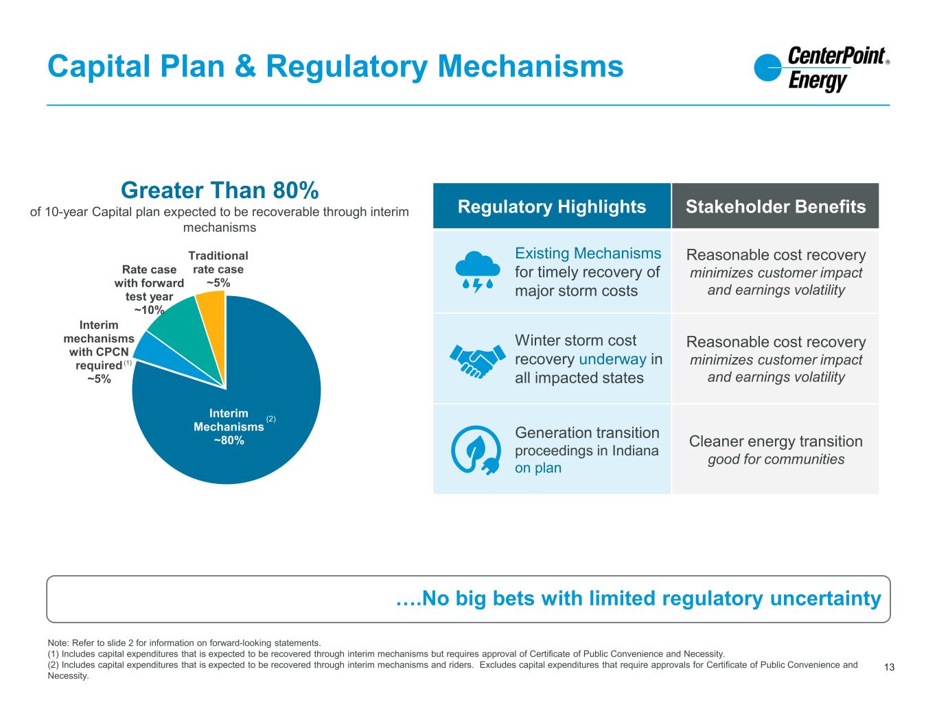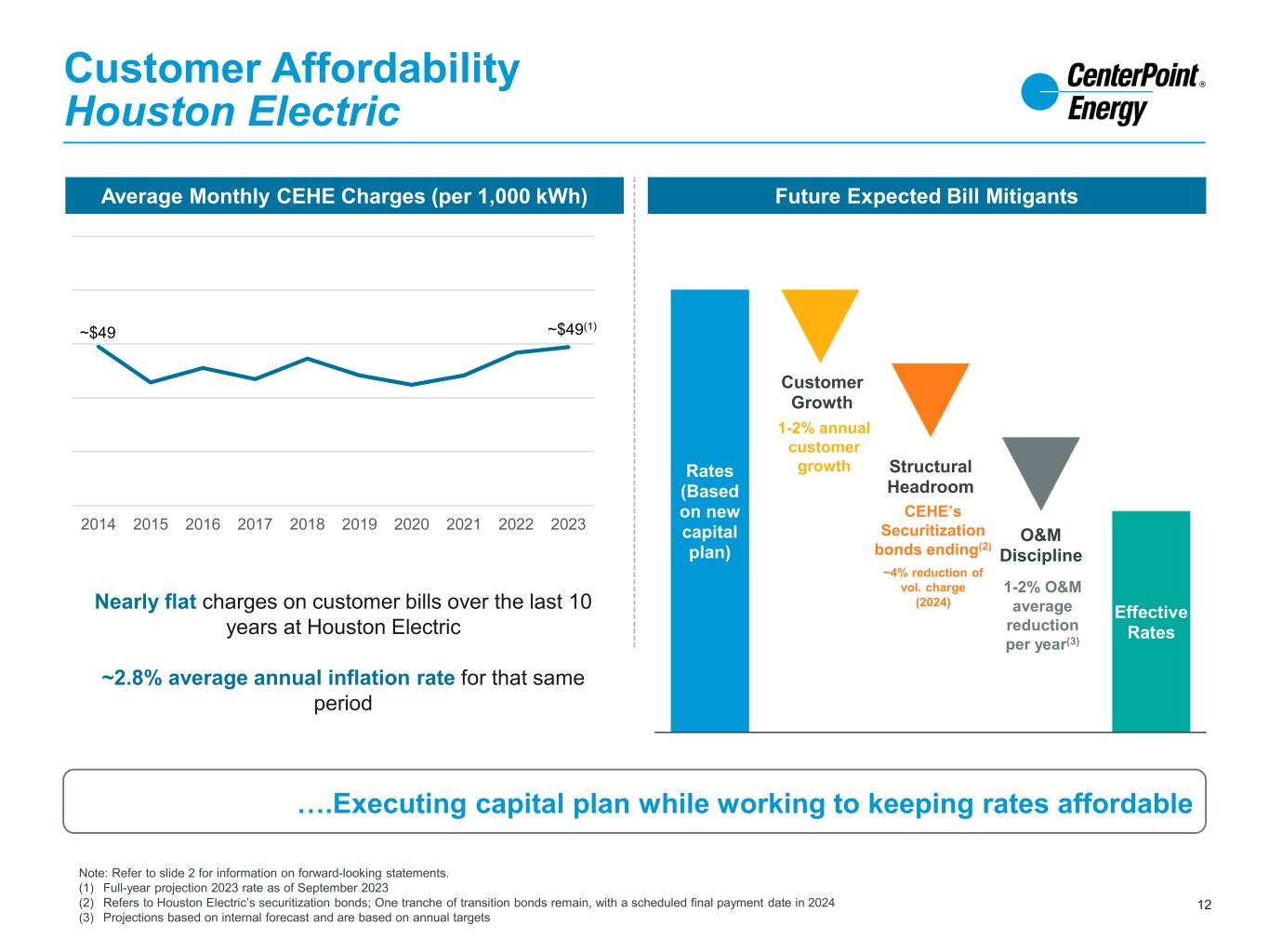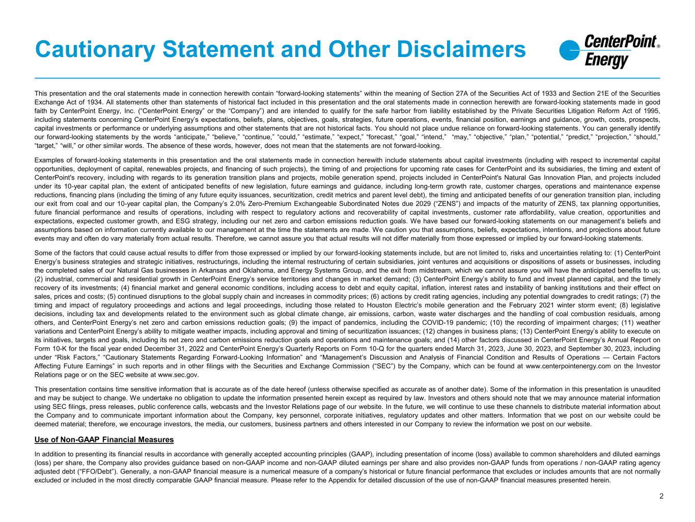 Cautionary Statement and Other Disclaimers This presentation and the oral statements made in connection herewith contain “forward-looking statements” within the meaning of Section 27A of the Securities Act of 1933 and Section 21E of the Securities Exchange Act of 1934. All statements other than statements of historical fact included in this presentation and the oral statements made in connection herewith are forward-looking statements made in good faith by CenterPoint Energy, Inc. (“CenterPoint Energy” or the “Company”) and are intended to qualify for the safe harbor from liability established by the Private Securities Litigation Reform Act of 1995, including statements concerning CenterPoint Energy’s expectations, beliefs, plans, objectives, goals, strategies, future operations, events, financial position, earnings and guidance, growth, costs, prospects, capital investments or performance or underlying assumptions and other statements that are not historical facts. You should not place undue reliance on forward-looking statements. You can generally identify our forward-looking statements by the words “anticipate,” “believe,” “continue,” “could,” “estimate,” “expect,” “forecast,” “goal,” “intend,” “may,” “objective,” “plan,” “potential,” “predict,” “projection,” “should,” “target,” “will,” or other similar words. The absence of these words, however, does not mean that the statements are not forward-looking. Examples of forward-looking statements in this presentation and the oral statements made in connection herewith include statements about capital investments (including with respect to incremental capital opportunities, deployment of capital, renewables projects, and financing of such projects), the timing of and projections for upcoming rate cases for CenterPoint and its subsidiaries, the timing and extent of CenterPoint's recovery, including with regards to its generation transition plans and projects, mobile generation spend, projects included in CenterPoint's Natural Gas Innovation Plan, and projects included under its 10-year capital plan, the extent of anticipated benefits of new legislation, future earnings and guidance, including long-term growth rate, customer charges, operations and maintenance expense reductions, financing plans (including the timing of any future equity issuances, securitization, credit metrics and parent level debt), the timing and anticipated benefits of our generation transition plan, including our exit from coal and our 10-year capital plan, the Company’s 2.0% Zero-Premium Exchangeable Subordinated Notes due 2029 (“ZENS”) and impacts of the maturity of ZENS, tax planning opportunities, future financial performance and results of operations, including with respect to regulatory actions and recoverability of capital investments, customer rate affordability, value creation, opportunities and expectations, expected customer growth, and ESG strategy, including our net zero and carbon emissions reduction goals. We have based our forward-looking statements on our management’s beliefs and assumptions based on information currently available to our management at the time the statements are made. We caution you that assumptions, beliefs, expectations, intentions, and projections about future events may and often do vary materially from actual results. Therefore, we cannot assure you that actual results will not differ materially from those expressed or implied by our forward-looking statements. Some of the factors that could cause actual results to differ from those expressed or implied by our forward-looking statements include, but are not limited to, risks and uncertainties relating to: (1) CenterPoint Energy’s business strategies and strategic initiatives, restructurings, including the internal restructuring of certain subsidiaries, joint ventures and acquisitions or dispositions of assets or businesses, including the completed sales of our Natural Gas businesses in Arkansas and Oklahoma, and Energy Systems Group, and the exit from midstream, which we cannot assure you will have the anticipated benefits to us; (2) industrial, commercial and residential growth in CenterPoint Energy’s service territories and changes in market demand; (3) CenterPoint Energy’s ability to fund and invest planned capital, and the timely recovery of its investments; (4) financial market and general economic conditions, including access to debt and equity capital, inflation, interest rates and instability of banking institutions and their effect on sales, prices and costs; (5) continued disruptions to the global supply chain and increases in commodity prices; (6) actions by credit rating agencies, including any potential downgrades to credit ratings; (7) the timing and impact of regulatory proceedings and actions and legal proceedings, including those related to Houston Electric’s mobile generation and the February 2021 winter storm event; (8) legislative decisions, including tax and developments related to the environment such as global climate change, air emissions, carbon, waste water discharges and the handling of coal combustion residuals, among others, and CenterPoint Energy’s net zero and carbon emissions reduction goals; (9) the impact of pandemics, including the COVID-19 pandemic; (10) the recording of impairment charges; (11) weather variations and CenterPoint Energy’s ability to mitigate weather impacts, including approval and timing of securitization issuances; (12) changes in business plans; (13) CenterPoint Energy’s ability to execute on its initiatives, targets and goals, including its net zero and carbon emissions reduction goals and operations and maintenance goals; and (14) other factors discussed in CenterPoint Energy’s Annual Report on Form 10-K for the fiscal year ended December 31, 2022 and CenterPoint Energy’s Quarterly Reports on Form 10-Q for the qua