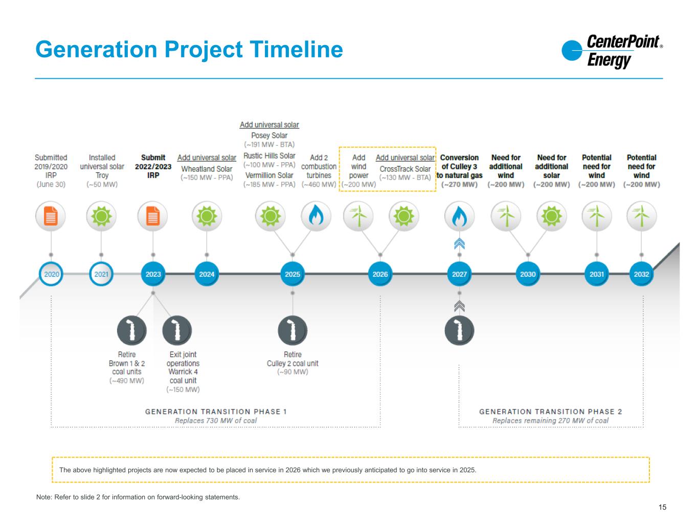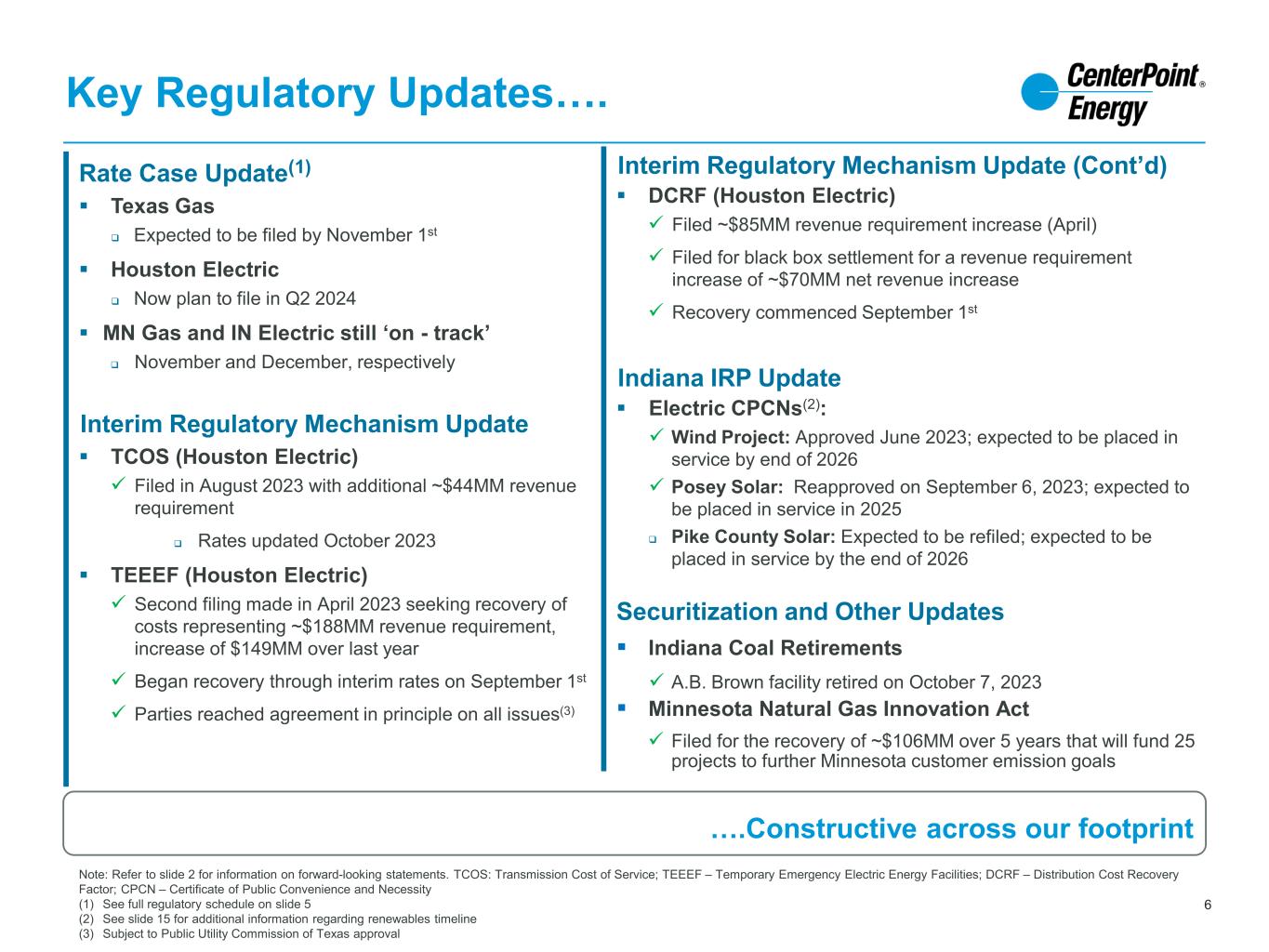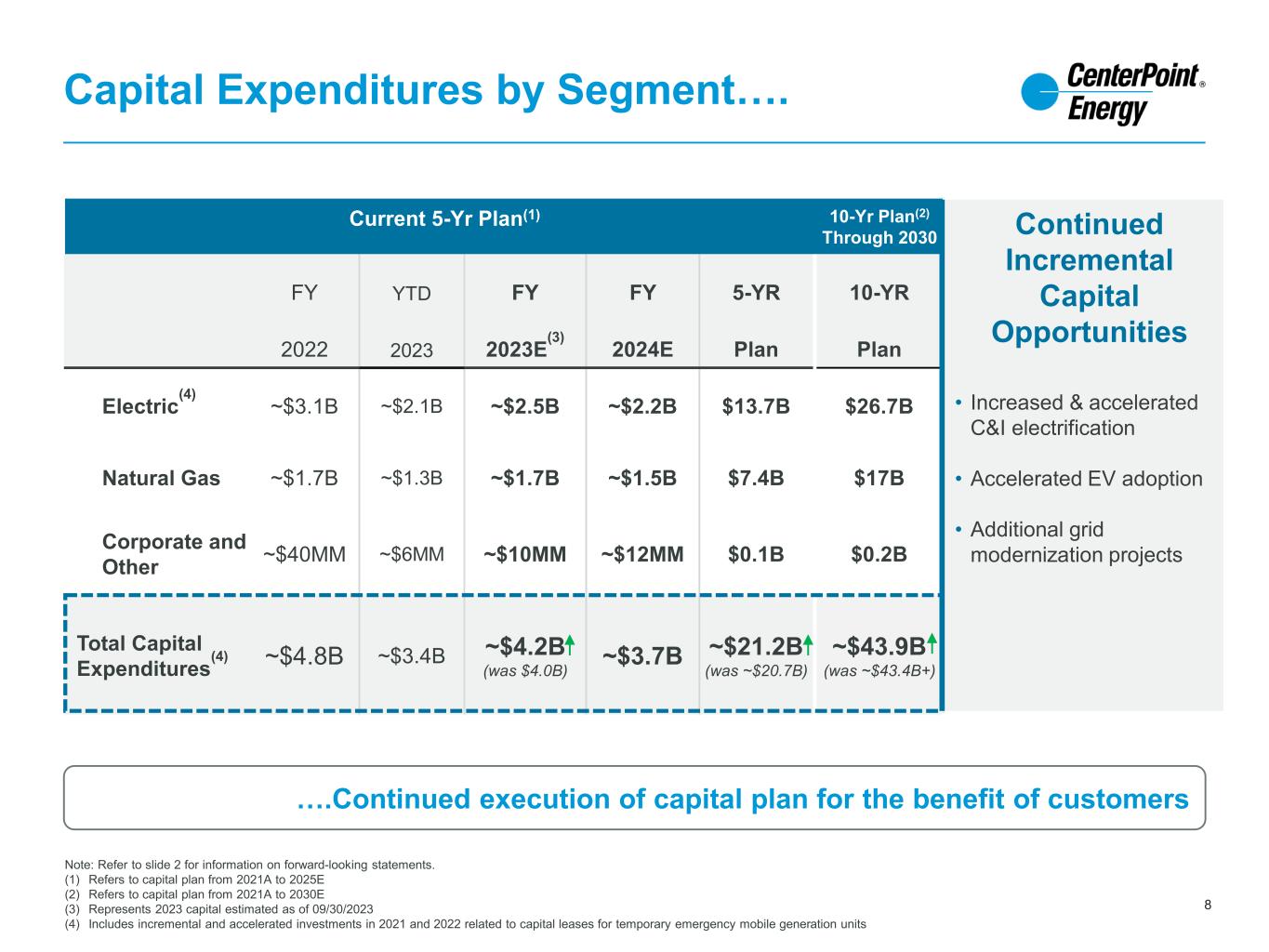 Cautionary Statement and Other Disclaimers This presentation and the oral statements made in connection herewith contain “forward-looking statements” within the meaning of Section 27A of the Securities Act of 1933 and Section 21E of the Securities Exchange Act of 1934. All statements other than statements of historical fact included in this presentation and the oral statements made in connection herewith are forward-looking statements made in good faith by CenterPoint Energy, Inc. (“CenterPoint Energy” or the “Company”) and are intended to qualify for the safe harbor from liability established by the Private Securities Litigation Reform Act of 1995, including statements concerning CenterPoint Energy’s expectations, beliefs, plans, objectives, goals, strategies, future operations, events, financial position, earnings and guidance, growth, costs, prospects, capital investments or performance or underlying assumptions and other statements that are not historical facts. You should not place undue reliance on forward-looking statements. You can generally identify our forward-looking statements by the words “anticipate,” “believe,” “continue,” “could,” “estimate,” “expect,” “forecast,” “goal,” “intend,” “may,” “objective,” “plan,” “potential,” “predict,” “projection,” “should,” “target,” “will,” or other similar words. The absence of these words, however, does not mean that the statements are not forward-looking. Examples of forward-looking statements in this presentation and the oral statements made in connection herewith include statements about capital investments (including with respect to incremental capital opportunities, deployment of capital, renewables projects, and financing of such projects), the timing of and projections for upcoming rate cases for CenterPoint and its subsidiaries, the timing and extent of CenterPoint's recovery, including with regards to its generation transition plans and projects, mobile generation spend, projects included in CenterPoint's Natural Gas Innovation Plan, and projects included under its 10-year capital plan, the extent of anticipated benefits of new legislation, future earnings and guidance, including long-term growth rate, customer charges, operations and maintenance expense reductions, financing plans (including the timing of any future equity issuances, securitization, credit metrics and parent level debt), the timing and anticipated benefits of our generation transition plan, including our exit from coal and our 10-year capital plan, the Company’s 2.0% Zero-Premium Exchangeable Subordinated Notes due 2029 (“ZENS”) and impacts of the maturity of ZENS, tax planning opportunities, future financial performance and results of operations, including with respect to regulatory actions and recoverability of capital investments, customer rate affordability, value creation, opportunities and expectations, expected customer growth, and ESG strategy, including our net zero and carbon emissions reduction goals. We have based our forward-looking statements on our management’s beliefs and assumptions based on information currently available to our management at the time the statements are made. We caution you that assumptions, beliefs, expectations, intentions, and projections about future events may and often do vary materially from actual results. Therefore, we cannot assure you that actual results will not differ materially from those expressed or implied by our forward-looking statements. Some of the factors that could cause actual results to differ from those expressed or implied by our forward-looking statements include, but are not limited to, risks and uncertainties relating to: (1) CenterPoint Energy’s business strategies and strategic initiatives, restructurings, including the internal restructuring of certain subsidiaries, joint ventures and acquisitions or dispositions of assets or businesses, including the completed sales of our Natural Gas businesses in Arkansas and Oklahoma, and Energy Systems Group, and the exit from midstream, which we cannot assure you will have the anticipated benefits to us; (2) industrial, commercial and residential growth in CenterPoint Energy’s service territories and changes in market demand; (3) CenterPoint Energy’s ability to fund and invest planned capital, and the timely recovery of its investments; (4) financial market and general economic conditions, including access to debt and equity capital, inflation, interest rates and instability of banking institutions and their effect on sales, prices and costs; (5) continued disruptions to the global supply chain and increases in commodity prices; (6) actions by credit rating agencies, including any potential downgrades to credit ratings; (7) the timing and impact of regulatory proceedings and actions and legal proceedings, including those related to Houston Electric’s mobile generation and the February 2021 winter storm event; (8) legislative decisions, including tax and developments related to the environment such as global climate change, air emissions, carbon, waste water discharges and the handling of coal combustion residuals, among others, and CenterPoint Energy’s net zero and carbon emissions reduction goals; (9) the impact of pandemics, including the COVID-19 pandemic; (10) the recording of impairment charges; (11) weather variations and CenterPoint Energy’s ability to mitigate weather impacts, including approval and timing of securitization issuances; (12) changes in business plans; (13) CenterPoint Energy’s ability to execute on its initiatives, targets and goals, including its net zero and carbon emissions reduction goals and operations and maintenance goals; and (14) other factors discussed in CenterPoint Energy’s Annual Report on Form 10-K for the fiscal year ended December 31, 2022 and CenterPoint Energy’s Quarterly Reports on Form 10-Q for the qua
