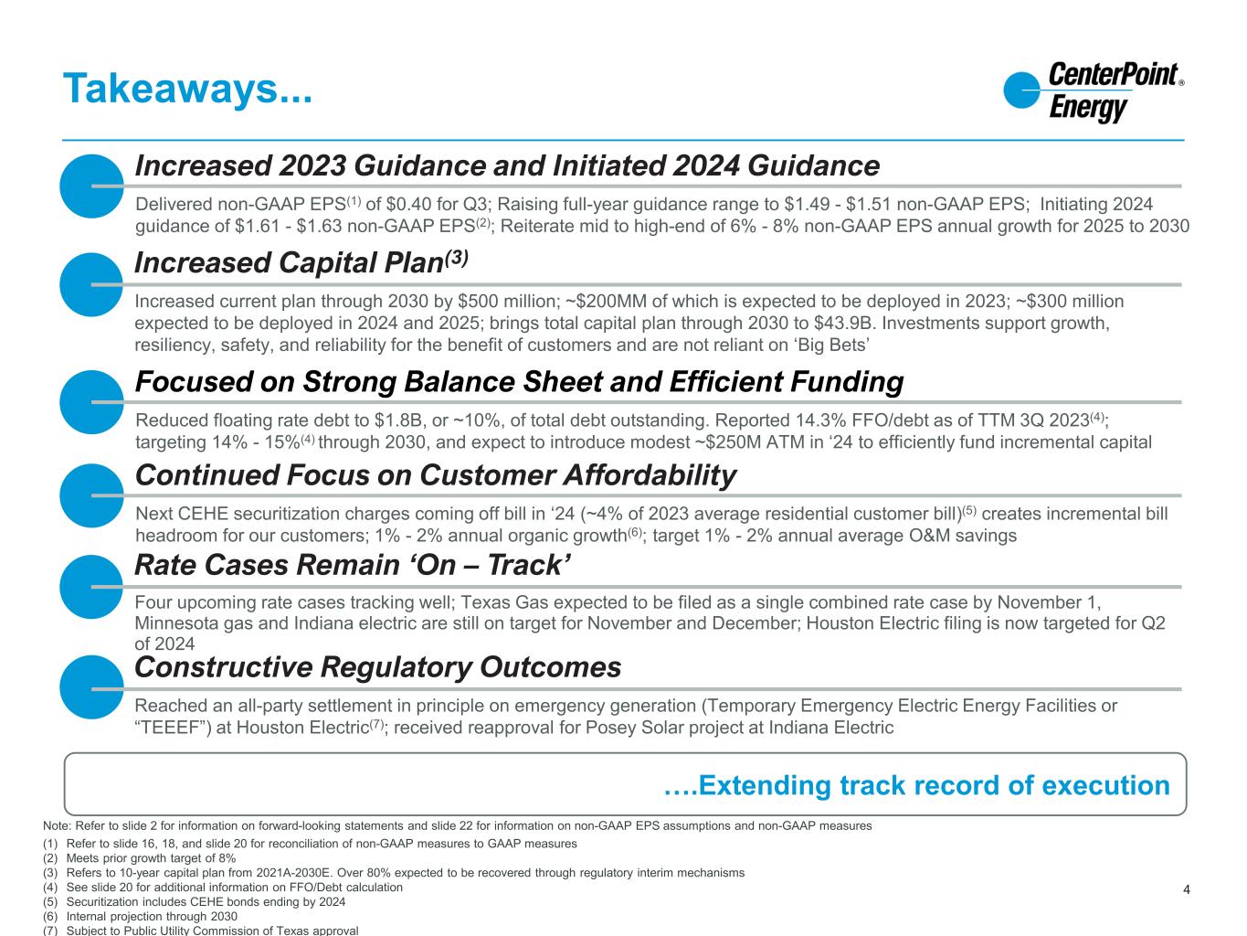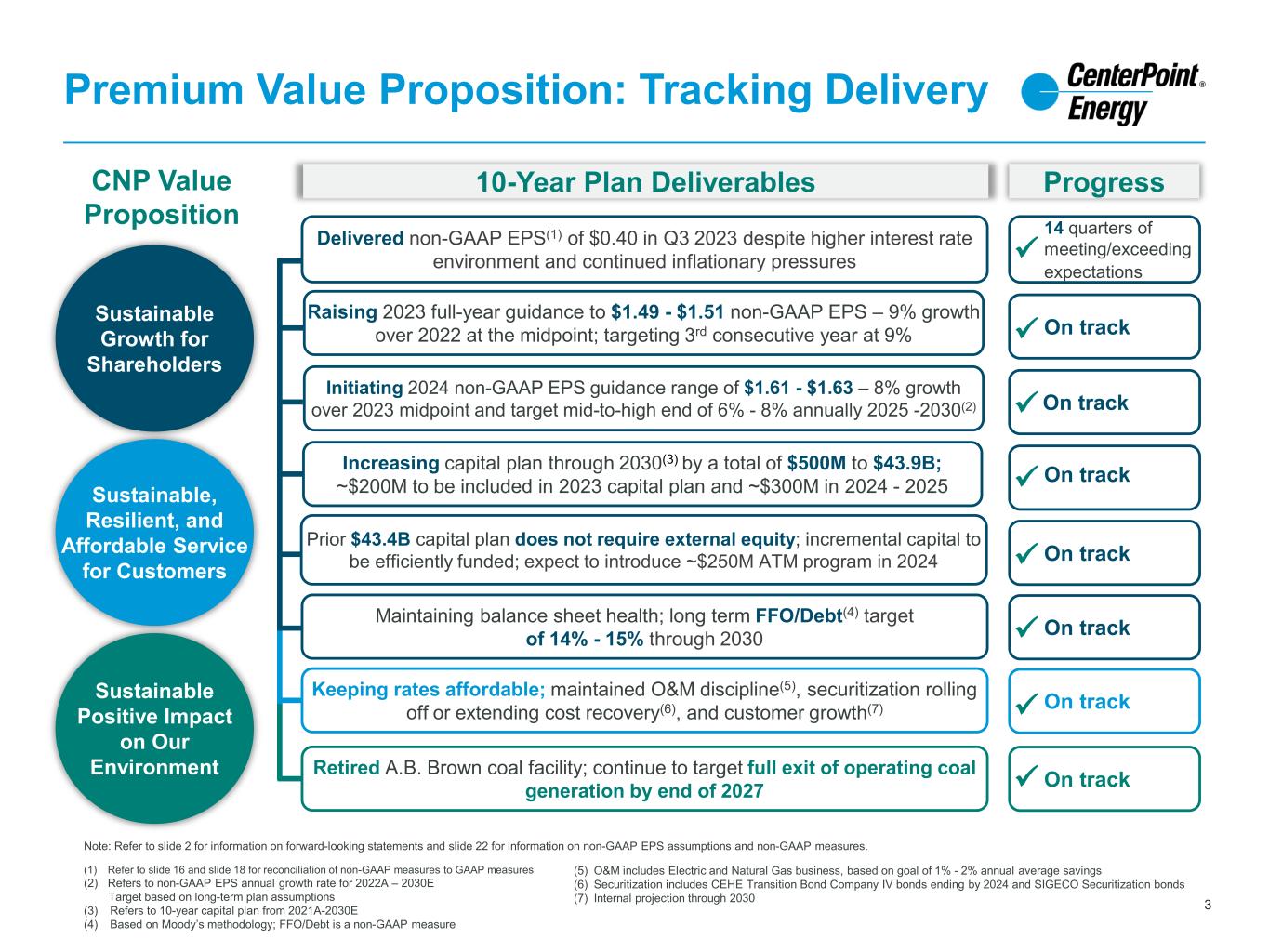 Note: Refer to slide 2 for information on forward-looking statements and slide 22 for information on non-GAAP EPS assumptions and non-GAAP measures. (1) Refer to slide 16 and slide 18 for reconciliation of non-GAAP measures to GAAP measures (2) Refers to non-GAAP EPS annual growth rate for 2022A – 2030E Target based on long-term plan assumptions (3) Refers to 10-year capital plan from 2021A-2030E (4) Based on Moody’s methodology; FFO/Debt is a non-GAAP measure (5) O&M includes Electric and Natural Gas business, based on goal of 1% - 2% annual average savings (6) Securitization includes CEHE Transition Bond Company IV bonds ending by 2024 and SIGECO Securitization bonds (7) Internal projection through 2030 On track Premium Value Proposition: Tracking Delivery Delivered non-GAAP EPS(1) of $0.40 in Q3 2023 despite higher interest rate environment and continued inflationary pressures Initiating 2024 non-GAAP EPS guidance range of $1.61 - $1.63 – 8% growth over 2023 midpoint and target mid-to-high end of 6% - 8% annually 2025 -2030(2) Increasing capital plan through 2030(3) by a total of $500M to $43.9B; ~$200M to be included in 2023 capital plan and ~$300M in 2024 - 2025 Maintaining balance sheet health; long term FFO/Debt(4) target of 14% - 15% through 2030 Keeping rates affordable; maintained O&M discipline(5), securitization rolling off or extending cost recovery(6), and customer growth(7) Prior $43.4B capital plan does not require external equity; incremental capital to be efficiently funded; expect to introduce ~$250M ATM program in 2024 Sustainable Growth for Shareholders 14 quarters of meeting/exceeding expectations On track On track On track On track On track 10-Year Plan Deliverables Progress        Sustainable Positive Impact on Our Environment Sustainable, Resilient, and Affordable Service for Customers Retired A.B. Brown coal facility; continue to target full exit of operating coal generation by end of 2027 CNP Value Proposition Raising 2023 full-year guidance to $1.49 - $1.51 non-GAAP EPS – 9% growth over 2022 at the midpoint; targeting 3rd consecutive year at 9% On track 3