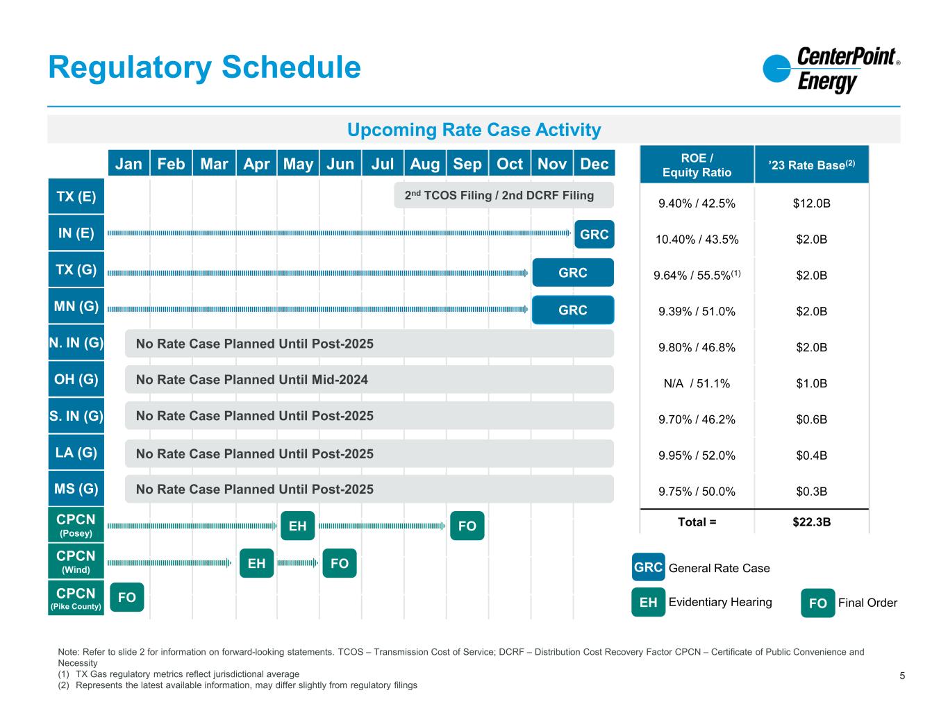 Focused on Strong Balance Sheet and Efficient Funding Reduced floating rate debt to $1.8B, or ~10%, of total debt outstanding. Reported 14.3% FFO/debt as of TTM 3Q 2023(4); targeting 14% - 15%(4) through 2030, and expect to introduce modest ~$250M ATM in ‘24 to efficiently fund incremental capital Rate Cases Remain ‘On – Track’ Four upcoming rate cases tracking well; Texas Gas expected to be filed as a single combined rate case by November 1, Minnesota gas and Indiana electric are still on target for November and December; Houston Electric filing is now targeted for Q2 of 2024 Increased Capital Plan(3) Increased current plan through 2030 by $500 million; ~$200MM of which is expected to be deployed in 2023; ~$300 million expected to be deployed in 2024 and 2025; brings total capital plan through 2030 to $43.9B. Investments support growth, resiliency, safety, and reliability for the benefit of customers and are not reliant on ‘Big Bets’ Note: Refer to slide 2 for information on forward-looking statements and slide 22 for information on non-GAAP EPS assumptions and non-GAAP measures (1) Refer to slide 16, 18, and slide 20 for reconciliation of non-GAAP measures to GAAP measures (2) Meets prior growth target of 8% (3) Refers to 10-year capital plan from 2021A-2030E. Over 80% expected to be recovered through regulatory interim mechanisms (4) See slide 20 for additional information on FFO/Debt calculation (5) Securitization includes CEHE bonds ending by 2024 (6) Internal projection through 2030 (7) Subject to Public Utility Commission of Texas approval ….Extending track record of execution Continued Focus on Customer Affordability Next CEHE securitization charges coming off bill in ‘24 (~4% of 2023 average residential customer bill)(5) creates incremental bill headroom for our customers; 1% - 2% annual organic growth(6); target 1% - 2% annual average O&M savings Constructive Regulatory Outcomes Reached an all-party settlement in principle on emergency generation (Temporary Emergency Electric Energy Facilities or “TEEEF”) at Houston Electric(7); received reapproval for Posey Solar project at Indiana Electric Increased 2023 Guidance and Initiated 2024 Guidance Delivered non-GAAP EPS(1) of $0.40 for Q3; Raising full-year guidance range to $1.49 - $1.51 non-GAAP EPS; Initiating 2024 guidance of $1.61 - $1.63 non-GAAP EPS(2); Reiterate mid to high-end of 6% - 8% non-GAAP EPS annual growth for 2025 to 2030 Takeaways... 4