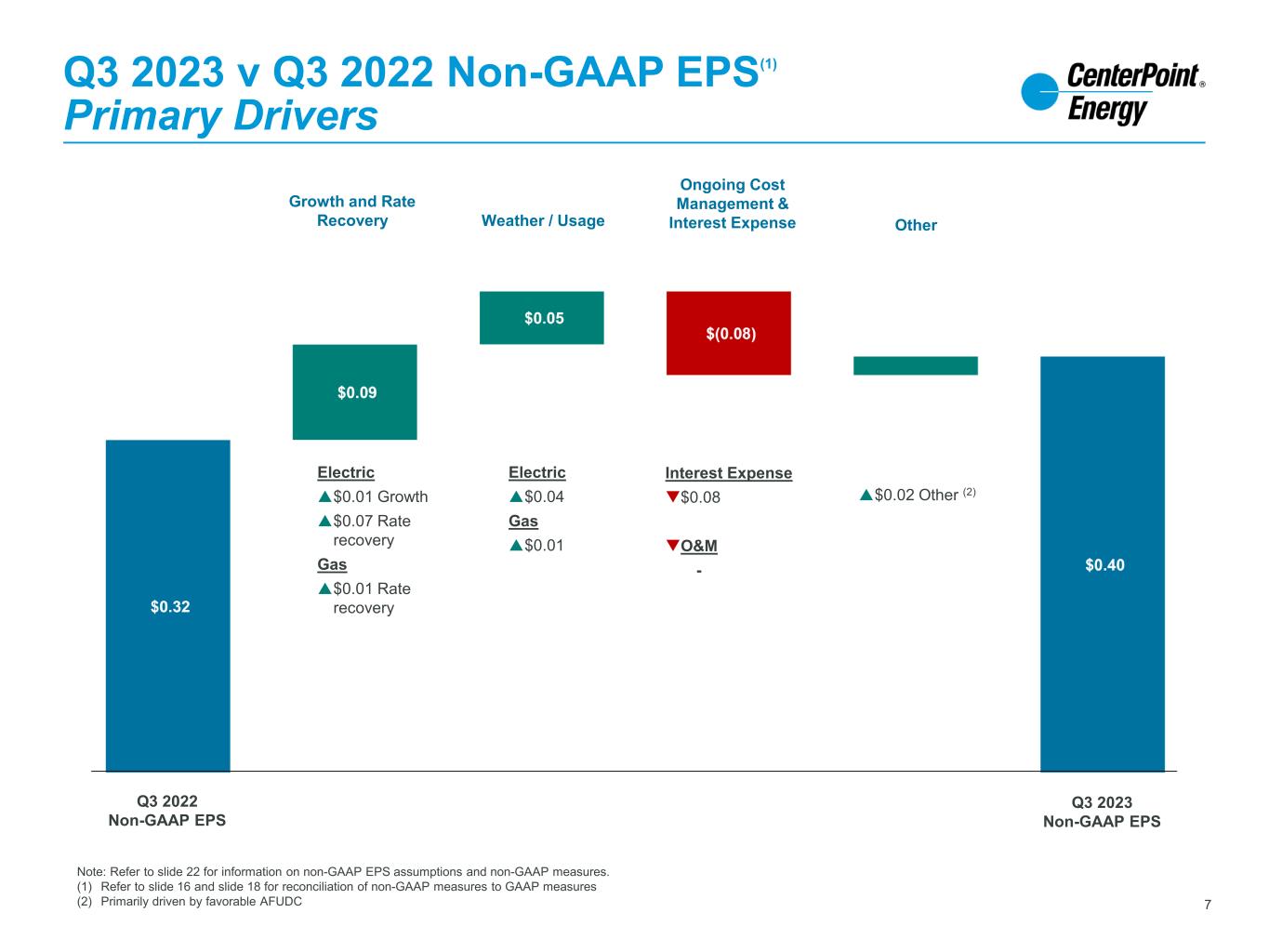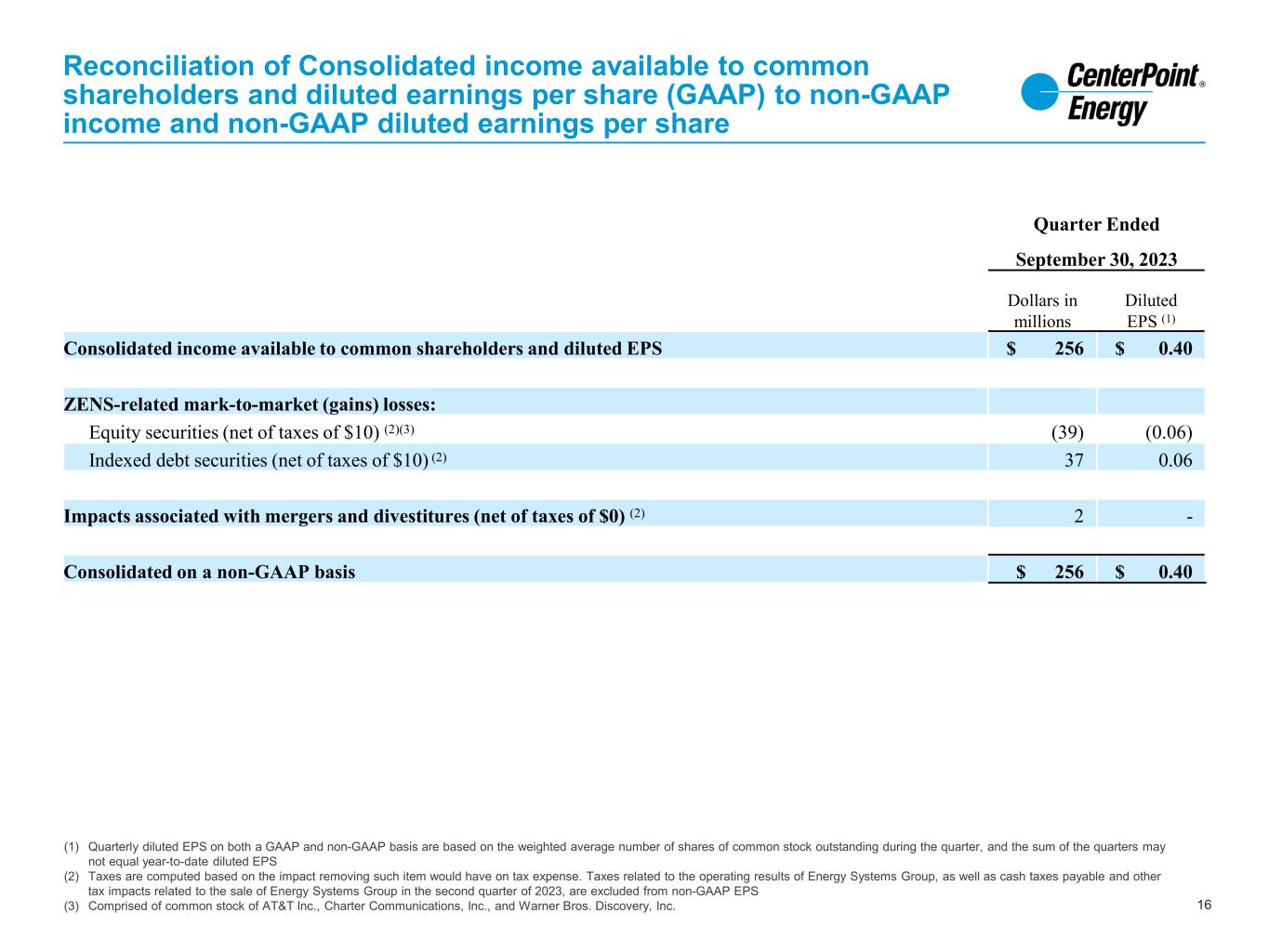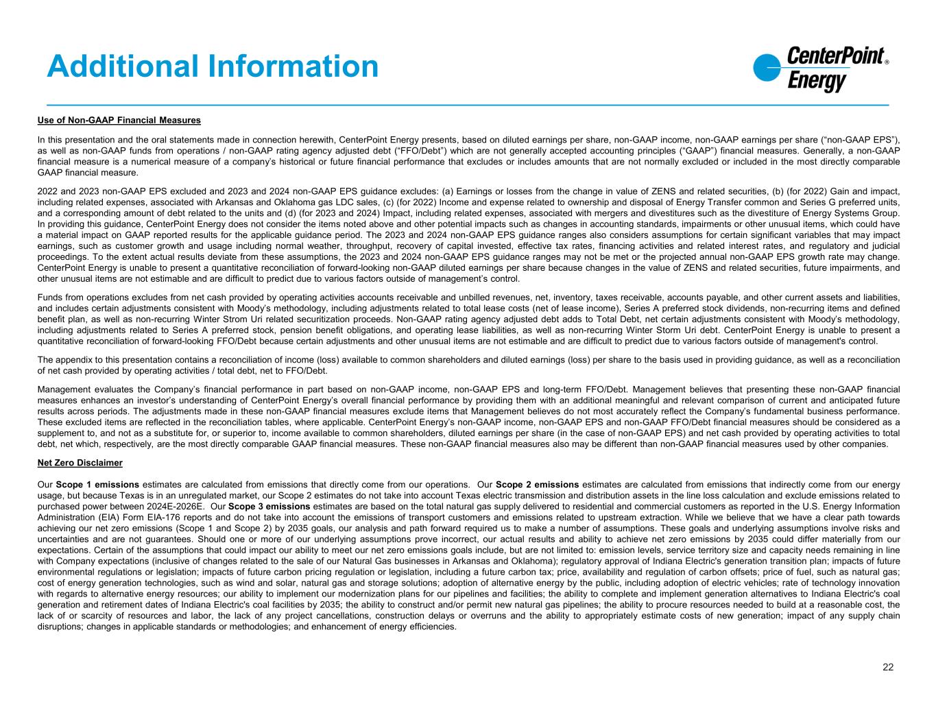Additional Information Use of Non-GAAP Financial Measures In this presentation and the oral statements made in connection herewith, CenterPoint Energy presents, based on diluted earnings per share, non-GAAP income, non-GAAP earnings per share (“non-GAAP EPS”), as well as non-GAAP funds from operations / non-GAAP rating agency adjusted debt (“FFO/Debt”) which are not generally accepted accounting principles (“GAAP”) financial measures. Generally, a non-GAAP financial measure is a numerical measure of a company’s historical or future financial performance that excludes or includes amounts that are not normally excluded or included in the most directly comparable GAAP financial measure. 2022 and 2023 non-GAAP EPS excluded and 2023 and 2024 non-GAAP EPS guidance excludes: (a) Earnings or losses from the change in value of ZENS and related securities, (b) (for 2022) Gain and impact, including related expenses, associated with Arkansas and Oklahoma gas LDC sales, (c) (for 2022) Income and expense related to ownership and disposal of Energy Transfer common and Series G preferred units, and a corresponding amount of debt related to the units and (d) (for 2023 and 2024) Impact, including related expenses, associated with mergers and divestitures such as the divestiture of Energy Systems Group. In providing this guidance, CenterPoint Energy does not consider the items noted above and other potential impacts such as changes in accounting standards, impairments or other unusual items, which could have a material impact on GAAP reported results for the applicable guidance period. The 2023 and 2024 non-GAAP EPS guidance ranges also considers assumptions for certain significant variables that may impact earnings, such as customer growth and usage including normal weather, throughput, recovery of capital invested, effective tax rates, financing activities and related interest rates, and regulatory and judicial proceedings. To the extent actual results deviate from these assumptions, the 2023 and 2024 non-GAAP EPS guidance ranges may not be met or the projected annual non-GAAP EPS growth rate may change. CenterPoint Energy is unable to present a quantitative reconciliation of forward-looking non-GAAP diluted earnings per share because changes in the value of ZENS and related securities, future impairments, and other unusual items are not estimable and are difficult to predict due to various factors outside of management’s control. Funds from operations excludes from net cash provided by operating activities accounts receivable and unbilled revenues, net, inventory, taxes receivable, accounts payable, and other current assets and liabilities, and includes certain adjustments consistent with Moody’s methodology, including adjustments related to total lease costs (net of lease income), Series A preferred stock dividends, non-recurring items and defined benefit plan, as well as non-recurring Winter Strom Uri related securitization proceeds. Non-GAAP rating agency adjusted debt adds to Total Debt, net certain adjustments consistent with Moody’s methodology, including adjustments related to Series A preferred stock, pension benefit obligations, and operating lease liabilities, as well as non-recurring Winter Storm Uri debt. CenterPoint Energy is unable to present a quantitative reconciliation of forward-looking FFO/Debt because certain adjustments and other unusual items are not estimable and are difficult to predict due to various factors outside of management's control. The appendix to this presentation contains a reconciliation of income (loss) available to common shareholders and diluted earnings (loss) per share to the basis used in providing guidance, as well as a reconciliation of net cash provided by operating activities / total debt, net to FFO/Debt. Management evaluates the Company’s financial performance in part based on non-GAAP income, non-GAAP EPS and long-term FFO/Debt. Management believes that presenting these non-GAAP financial measures enhances an investor’s understanding of CenterPoint Energy’s overall financial performance by providing them with an additional meaningful and relevant comparison of current and anticipated future results across periods. The adjustments made in these non-GAAP financial measures exclude items that Management believes do not most accurately reflect the Company’s fundamental business performance. These excluded items are reflected in the reconciliation tables, where applicable. CenterPoint Energy’s non-GAAP income, non-GAAP EPS and non-GAAP FFO/Debt financial measures should be considered as a supplement to, and not as a substitute for, or superior to, income available to common shareholders, diluted earnings per share (in the case of non-GAAP EPS) and net cash provided by operating activities to total debt, net which, respectively, are the most directly comparable GAAP financial measures. These non-GAAP financial measures also may be different than non-GAAP financial measures used by other companies. Net Zero Disclaimer Our Scope 1 emissions estimates are calculated from emissions that directly come from our operations. Our Scope 2 emissions estimates are calculated from emissions that indirectly come from our energy usage, but because Texas is in an unregulated market, our Scope 2 estimates do not take into account Texas electric transmission and distribution assets in the line loss calculation and exclude emissions related to purchased power between 2024E-2026E. Our Scope 3 emissions estimates are based on the total natural gas supply delivered to residential and commercial customers as reported in the U.S. Energy Information Administration (EIA) Form EIA-176 reports and do not take into account the emissions of transport customers and emissions related to upstream extraction. While we believe that we have a clear path towards achieving our net zero emissions (Scope 1 and Scope 2) by 2035 goals, our analysis and path forward requir