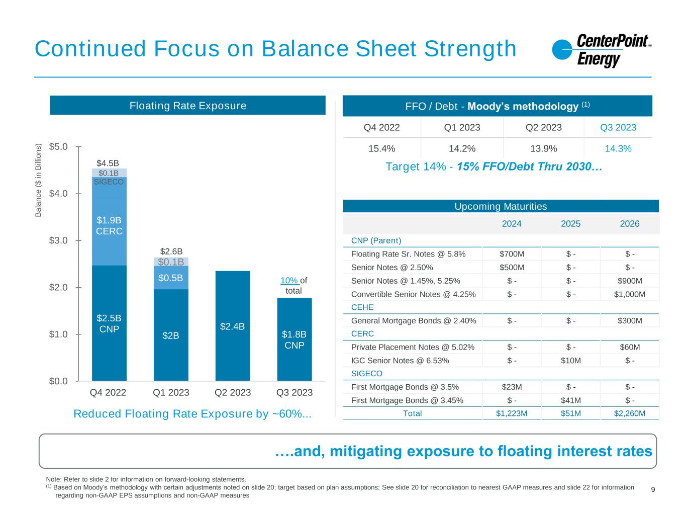 Continued Focus on Balance Sheet Strength $2.5B CNP $2B $2.4B $1.8B CNP $1.9B CERC $0.5B $0.1B SIGECO $0.1B $0.0 $1.0 $2.0 $3.0 $4.0 $5.0 Q4 2022 Q1 2023 Q2 2023 Q3 2023 B a la n c e ( $ i n B ill io n s ) 9 ….and, mitigating exposure to floating interest rates $4.5B $2.6B 10% of total Floating Rate Exposure FFO / Debt - Moody’s methodology (1) Q4 2022 Q1 2023 Q2 2023 Q3 2023 15.4% 14.2% 13.9% 14.3% Note: Refer to slide 2 for information on forward-looking statements. (1) Based on Moody’s methodology with certain adjustments noted on slide 20; target based on plan assumptions; See slide 20 for reconciliation to nearest GAAP measures and slide 22 for information regarding non-GAAP EPS assumptions and non-GAAP measures Target 14% - 15% FFO/Debt Thru 2030… Reduced Floating Rate Exposure by ~60%... 2024 2025 2026 Floating Rate Sr. Notes @ 5.8% $700M $ - $ - Senior Notes @ 2.50% $500M $ - $ - Senior Notes @ 1.45%, 5.25% $ - $ - $900M Convertible Senior Notes @ 4.25% $ - $ - $1,000M General Mortgage Bonds @ 2.40% $ - $ - $300M Private Placement Notes @ 5.02% $ - $ - $60M IGC Senior Notes @ 6.53% $ - $10M $ - First Mortgage Bonds @ 3.5% $23M $ - $ - First Mortgage Bonds @ 3.45% $ - $41M $ - Total $1,223M $51M $2,260M SIGECO Upcoming Maturities CNP (Parent) CEHE CERC