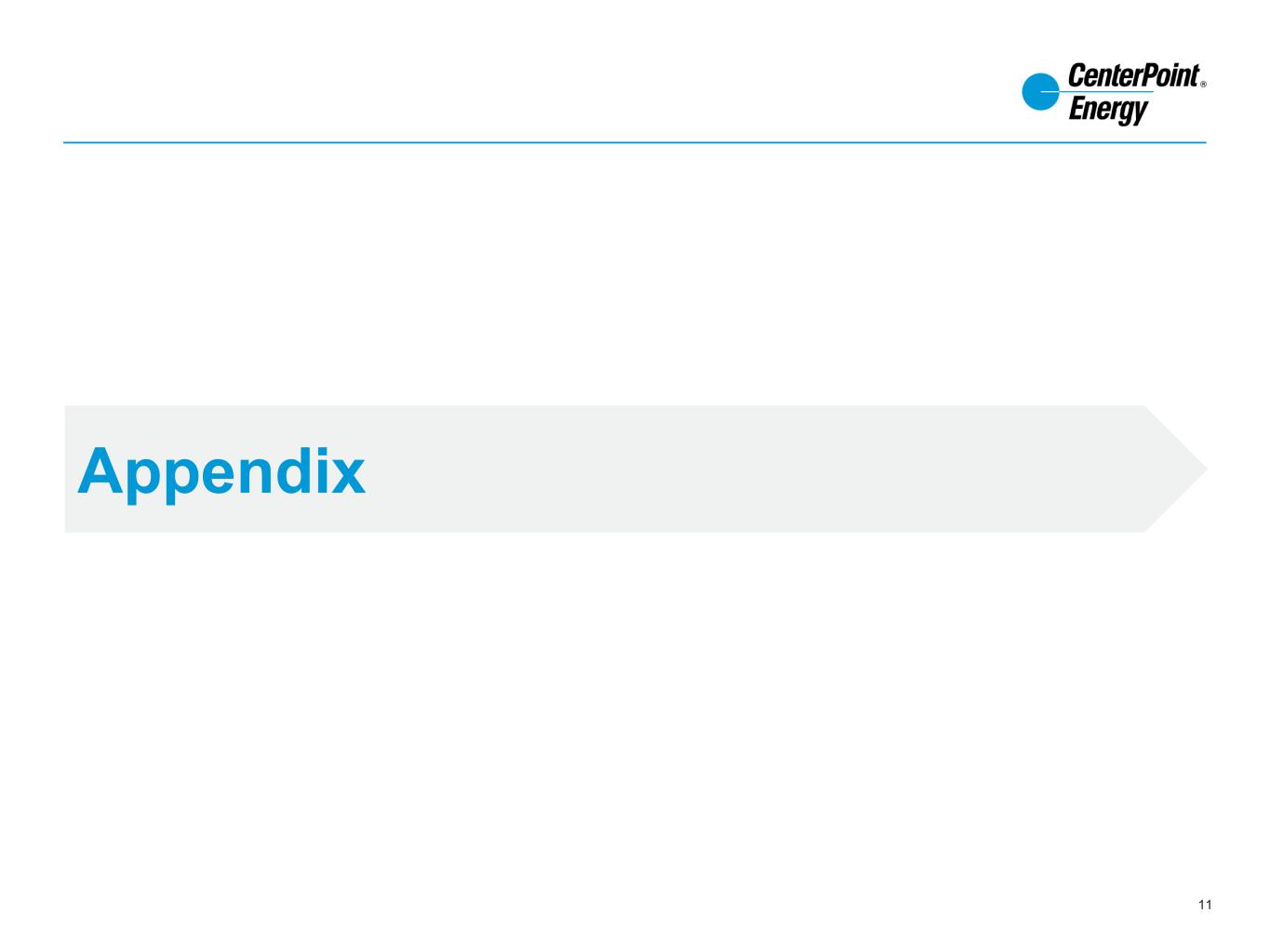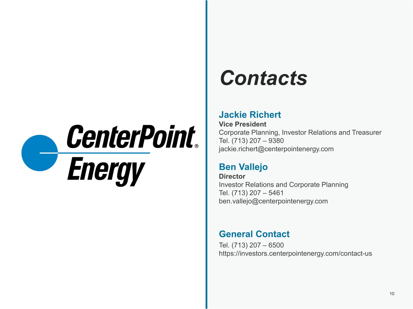 Contacts Jackie Richert Vice President Corporate Planning, Investor Relations and Treasurer Tel. (713) 207 – 9380 jackie.richert@centerpointenergy.com Ben Vallejo Director Investor Relations and Corporate Planning Tel. (713) 207 – 5461 ben.vallejo@centerpointenergy.com General Contact Tel. (713) 207 – 6500 https://investors.centerpointenergy.com/contact-us 10