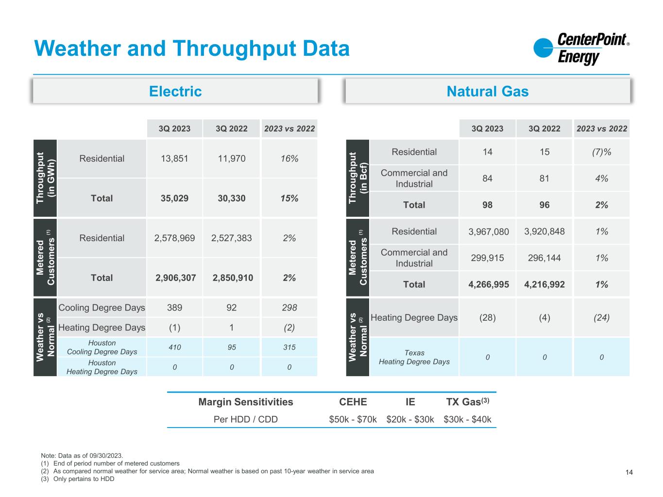 Weather and Throughput Data Note: Data as of 09/30/2023. (1) End of period number of metered customers (2) As compared normal weather for service area; Normal weather is based on past 10-year weather in service area (3) Only pertains to HDD Electric Natural Gas 3Q 2023 3Q 2022 2023 vs 2022 Th ro ug hp ut (in G W h) Residential 13,851 11,970 16% Total 35,029 30,330 15% M et er ed C us to m er s (1 ) Residential 2,578,969 2,527,383 2% Total 2,906,307 2,850,910 2% W ea th er v s N or m al (2 ) Cooling Degree Days 389 92 298 Heating Degree Days (1) 1 (2) Houston Cooling Degree Days 410 95 315 Houston Heating Degree Days 0 0 0 3Q 2023 3Q 2022 2023 vs 2022 Th ro ug hp ut (in B cf ) Residential 14 15 (7)% Commercial and Industrial 84 81 4% Total 98 96 2% M et er ed C us to m er s (1 ) Residential 3,967,080 3,920,848 1% Commercial and Industrial 299,915 296,144 1% Total 4,266,995 4,216,992 1% W ea th er v s N or m al (2 ) Heating Degree Days (28) (4) (24) Texas Heating Degree Days 0 0 0 14 Margin Sensitivities CEHE IE TX Gas(3) Per HDD / CDD $50k - $70k $20k - $30k $30k - $40k