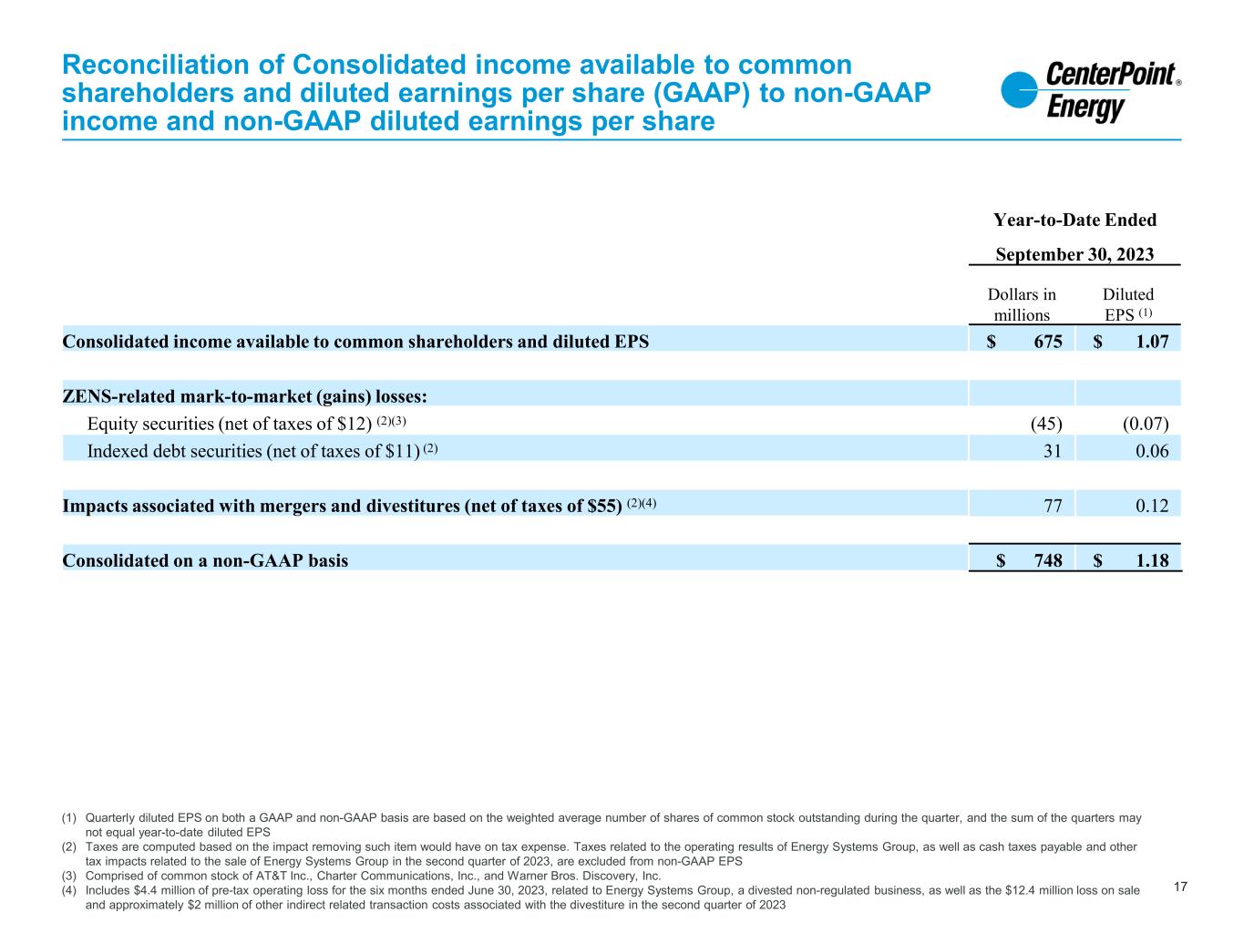 Reconciliation of Consolidated income available to common shareholders and diluted earnings per share (GAAP) to non-GAAP income and non-GAAP diluted earnings per share Quarter Ended September 30, 2023 Dollars in millions Diluted EPS (1) Consolidated income available to common shareholders and diluted EPS $ 256 $ 0.40 ZENS-related mark-to-market (gains) losses: Equity securities (net of taxes of $10) (2)(3) (39) (0.06) Indexed debt securities (net of taxes of $10) (2) 37 0.06 Impacts associated with mergers and divestitures (net of taxes of $0) (2) 2 - Consolidated on a non-GAAP basis $ 256 $ 0.40 16 (1) Quarterly diluted EPS on both a GAAP and non-GAAP basis are based on the weighted average number of shares of common stock outstanding during the quarter, and the sum of the quarters may not equal year-to-date diluted EPS (2) Taxes are computed based on the impact removing such item would have on tax expense. Taxes related to the operating results of Energy Systems Group, as well as cash taxes payable and other tax impacts related to the sale of Energy Systems Group in the second quarter of 2023, are excluded from non-GAAP EPS (3) Comprised of common stock of AT&T Inc., Charter Communications, Inc., and Warner Bros. Discovery, Inc.