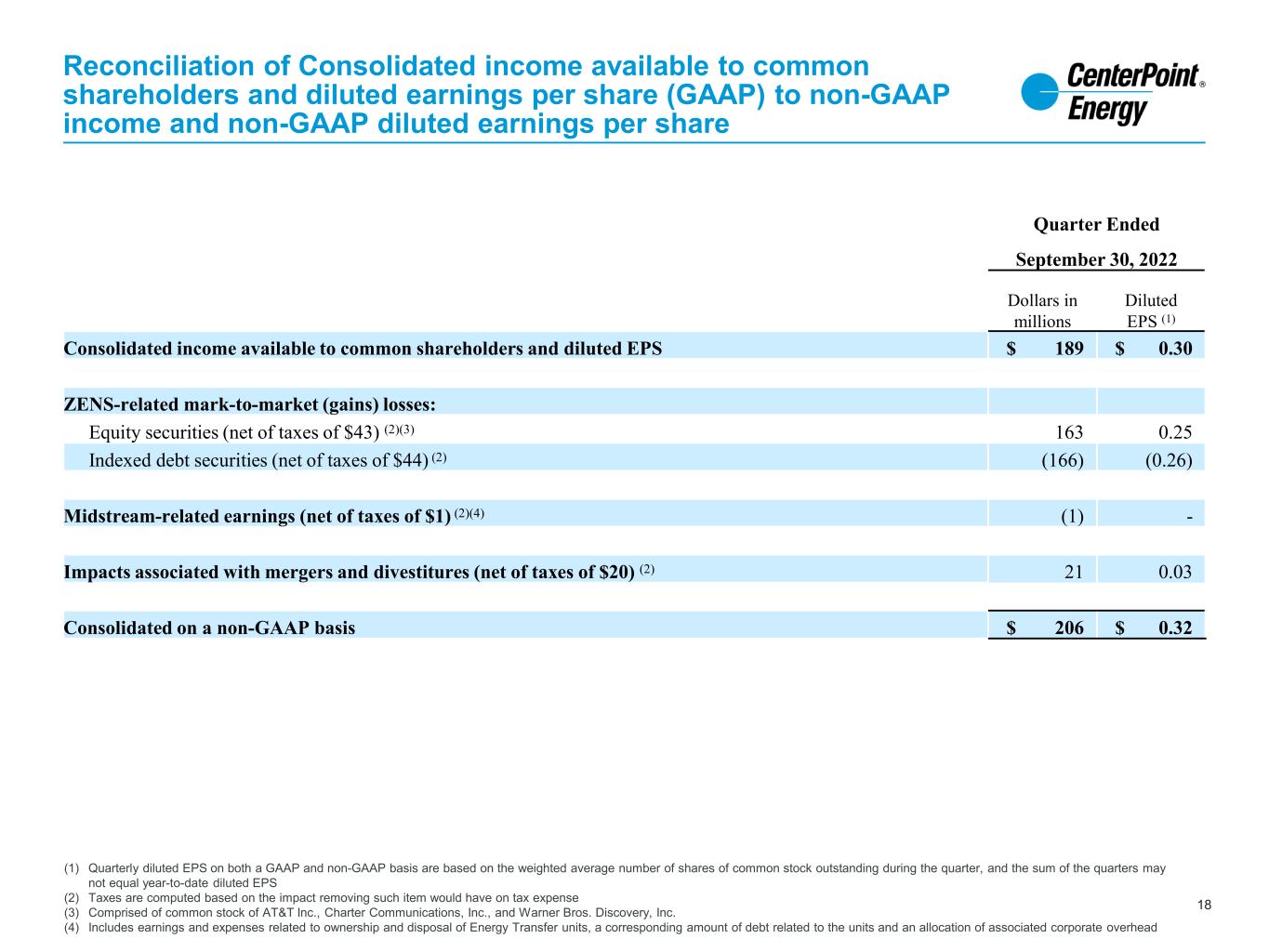 Reconciliation of Consolidated income available to common shareholders and diluted earnings per share (GAAP) to non-GAAP income and non-GAAP diluted earnings per share Year-to-Date Ended September 30, 2023 Dollars in millions Diluted EPS (1) Consolidated income available to common shareholders and diluted EPS $ 675 $ 1.07 ZENS-related mark-to-market (gains) losses: Equity securities (net of taxes of $12) (2)(3) (45) (0.07) Indexed debt securities (net of taxes of $11) (2) 31 0.06 Impacts associated with mergers and divestitures (net of taxes of $55) (2)(4) 77 0.12 Consolidated on a non-GAAP basis $ 748 $ 1.18 17 (1) Quarterly diluted EPS on both a GAAP and non-GAAP basis are based on the weighted average number of shares of common stock outstanding during the quarter, and the sum of the quarters may not equal year-to-date diluted EPS (2) Taxes are computed based on the impact removing such item would have on tax expense. Taxes related to the operating results of Energy Systems Group, as well as cash taxes payable and other tax impacts related to the sale of Energy Systems Group in the second quarter of 2023, are excluded from non-GAAP EPS (3) Comprised of common stock of AT&T Inc., Charter Communications, Inc., and Warner Bros. Discovery, Inc. (4) Includes $4.4 million of pre-tax operating loss for the six months ended June 30, 2023, related to Energy Systems Group, a divested non-regulated business, as well as the $12.4 million loss on sale and approximately $2 million of other indirect related transaction costs associated with the divestiture in the second quarter of 2023