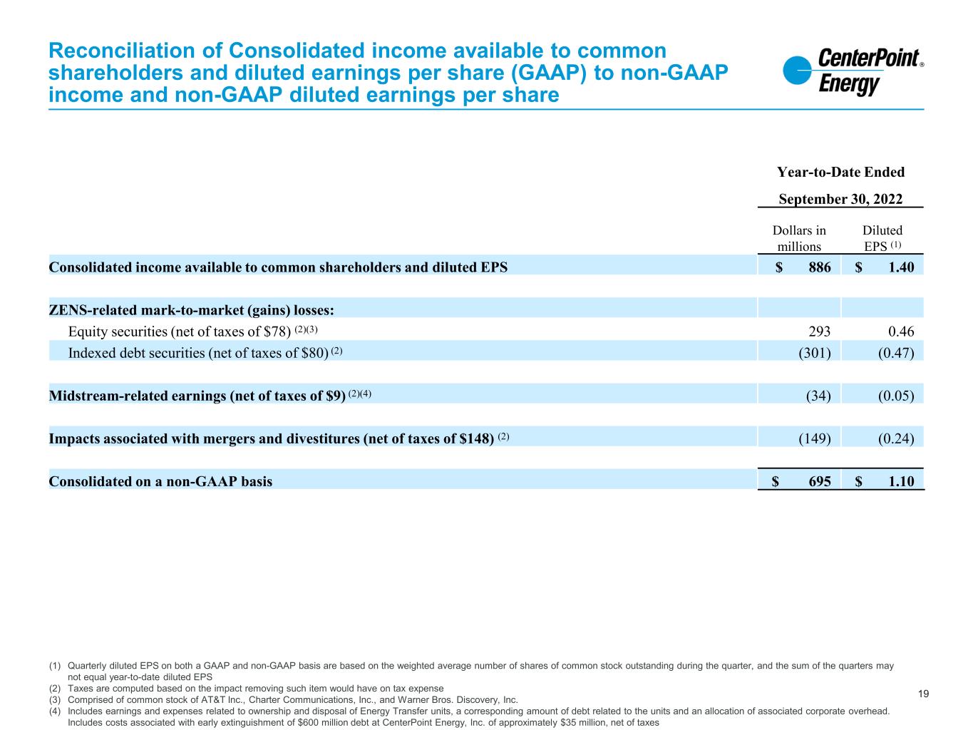 Reconciliation of Consolidated income available to common shareholders and diluted earnings per share (GAAP) to non-GAAP income and non-GAAP diluted earnings per share Year-to-Date Ended September 30, 2022 Dollars in millions Diluted EPS (1) Consolidated income available to common shareholders and diluted EPS $ 886 $ 1.40 ZENS-related mark-to-market (gains) losses: Equity securities (net of taxes of $78) (2)(3) 293 0.46 Indexed debt securities (net of taxes of $80) (2) (301) (0.47) Midstream-related earnings (net of taxes of $9) (2)(4) (34) (0.05) Impacts associated with mergers and divestitures (net of taxes of $148) (2) (149) (0.24) Consolidated on a non-GAAP basis $ 695 $ 1.10 19 (1) Quarterly diluted EPS on both a GAAP and non-GAAP basis are based on the weighted average number of shares of common stock outstanding during the quarter, and the sum of the quarters may not equal year-to-date diluted EPS (2) Taxes are computed based on the impact removing such item would have on tax expense (3) Comprised of common stock of AT&T Inc., Charter Communications, Inc., and Warner Bros. Discovery, Inc. (4) Includes earnings and expenses related to ownership and disposal of Energy Transfer units, a corresponding amount of debt related to the units and an allocation of associated corporate overhead. Includes costs associated with early extinguishment of $600 million debt at CenterPoint Energy, Inc. of approximately $35 million, net of taxes
