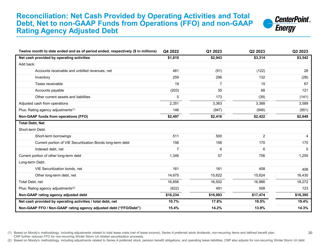 Twelve month to date ended and as of period ended, respectively ($ in millions) Q4 2022 Q1 2023 Q2 2023 Q3 2023 Net cash provided by operating activities $1,810 $2,943 $3,314 $3,542 Add back: Accounts receivable and unbilled revenues, net 461 (91) (122) 28 Inventory 259 296 132 (28) Taxes receivable 19 7 15 67 Accounts payable (203) 35 68 121 Other current assets and liabilities 5 173 (39) (141) Adjusted cash from operations 2,351 3,363 3,368 3,589 Plus: Rating agency adjustments(1) 146 (947) (946) (951) Non-GAAP funds from operations (FFO) $2,497 $2,416 $2,422 $2,649 Total Debt, Net Short-term Debt: Short-term borrowings 511 500 2 4 Current portion of VIE Securitization Bonds long-term debt 156 156 170 170 Indexed debt, net 7 6 6 5 Current portion of other long-term debt 1,346 57 756 1,255 Long-term Debt: VIE Securitization bonds, net 161 161 408 408 Other long-term debt, net 14,675 15,622 15,624 16,430 Total Debt, net 16,856 16,502 16,966 18,272 Plus: Rating agency adjustments(2) (622) 491 508 123 Non-GAAP rating agency adjusted debt $16,234 $16,993 $17,474 $18,395 Net cash provided by operating activities / total debt, net 10.7% 17.8% 19.5% 19.4% Non-GAAP FFO / Non-GAAP rating agency adjusted debt (“FFO/Debt”) 15.4% 14.2% 13.9% 14.3% Reconciliation: Net Cash Provided by Operating Activities and Total Debt, Net to non-GAAP Funds from Operations (FFO) and non-GAAP Rating Agency Adjusted Debt 20(1) Based on Moody’s methodology, including adjustments related to total lease costs (net of lease income), Series A preferred stock dividends, non-recurring items and defined benefit plan. CNP further reduces FFO for non-recurring Winter Storm Uri related securitization proceeds. (2) Based on Moody’s methodology, including adjustments related to Series A preferred stock, pension benefit obligations, and operating lease liabilities. CNP also adjusts for non-recurring Winter Storm Uri debt