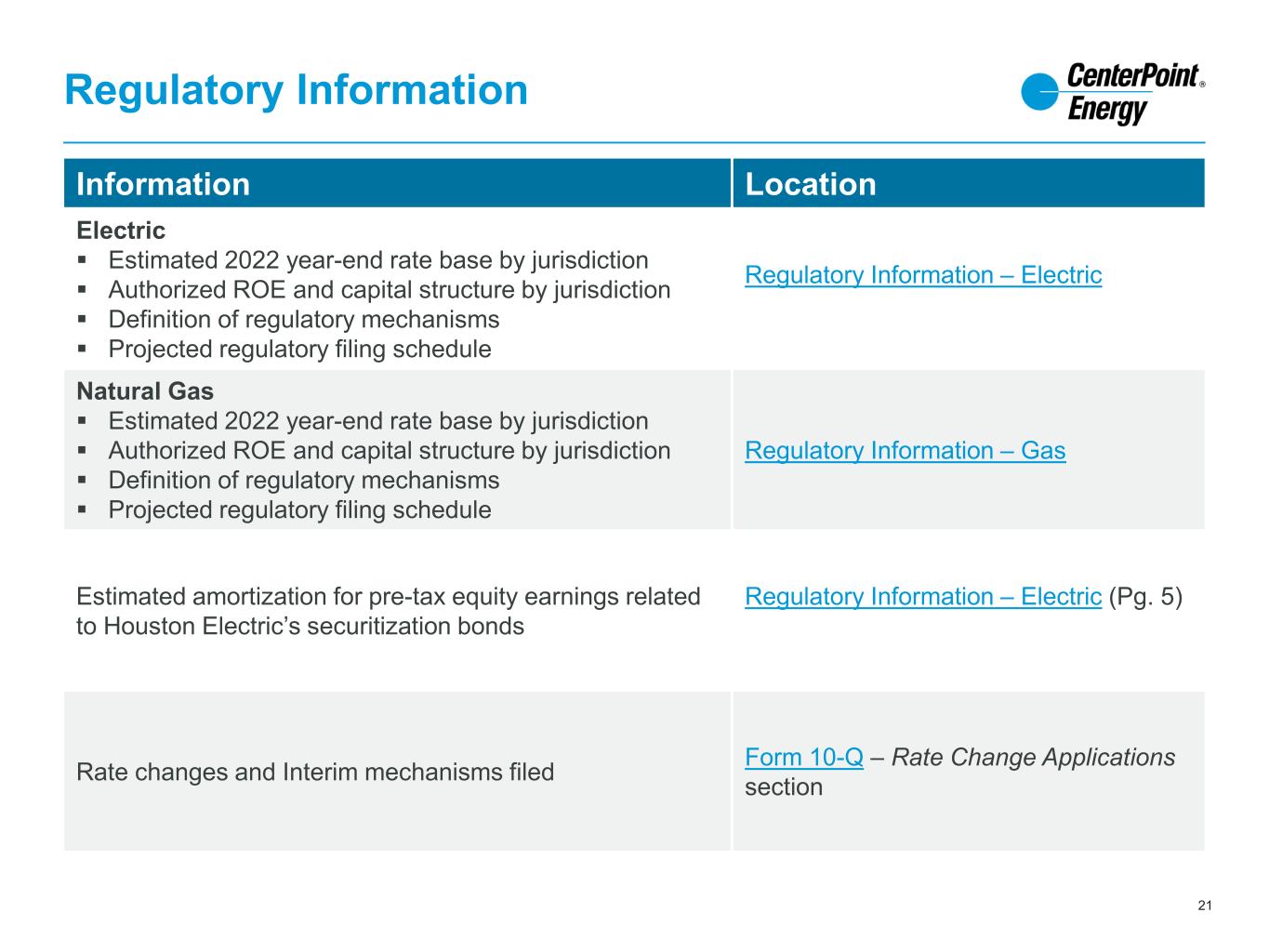 Regulatory Information Information Location Electric  Estimated 2022 year-end rate base by jurisdiction  Authorized ROE and capital structure by jurisdiction  Definition of regulatory mechanisms  Projected regulatory filing schedule Regulatory Information – Electric Natural Gas  Estimated 2022 year-end rate base by jurisdiction  Authorized ROE and capital structure by jurisdiction  Definition of regulatory mechanisms  Projected regulatory filing schedule Regulatory Information – Gas Estimated amortization for pre-tax equity earnings related to Houston Electric’s securitization bonds Regulatory Information – Electric (Pg. 5) Rate changes and Interim mechanisms filed Form 10-Q – Rate Change Applications section 21