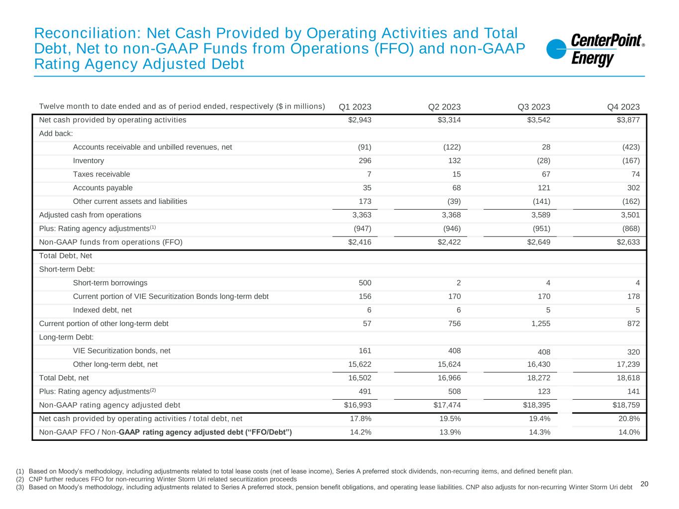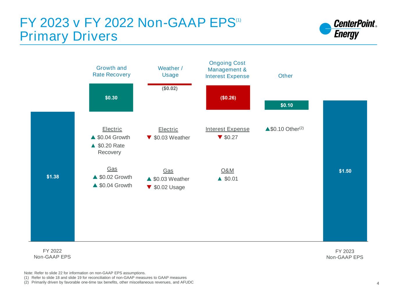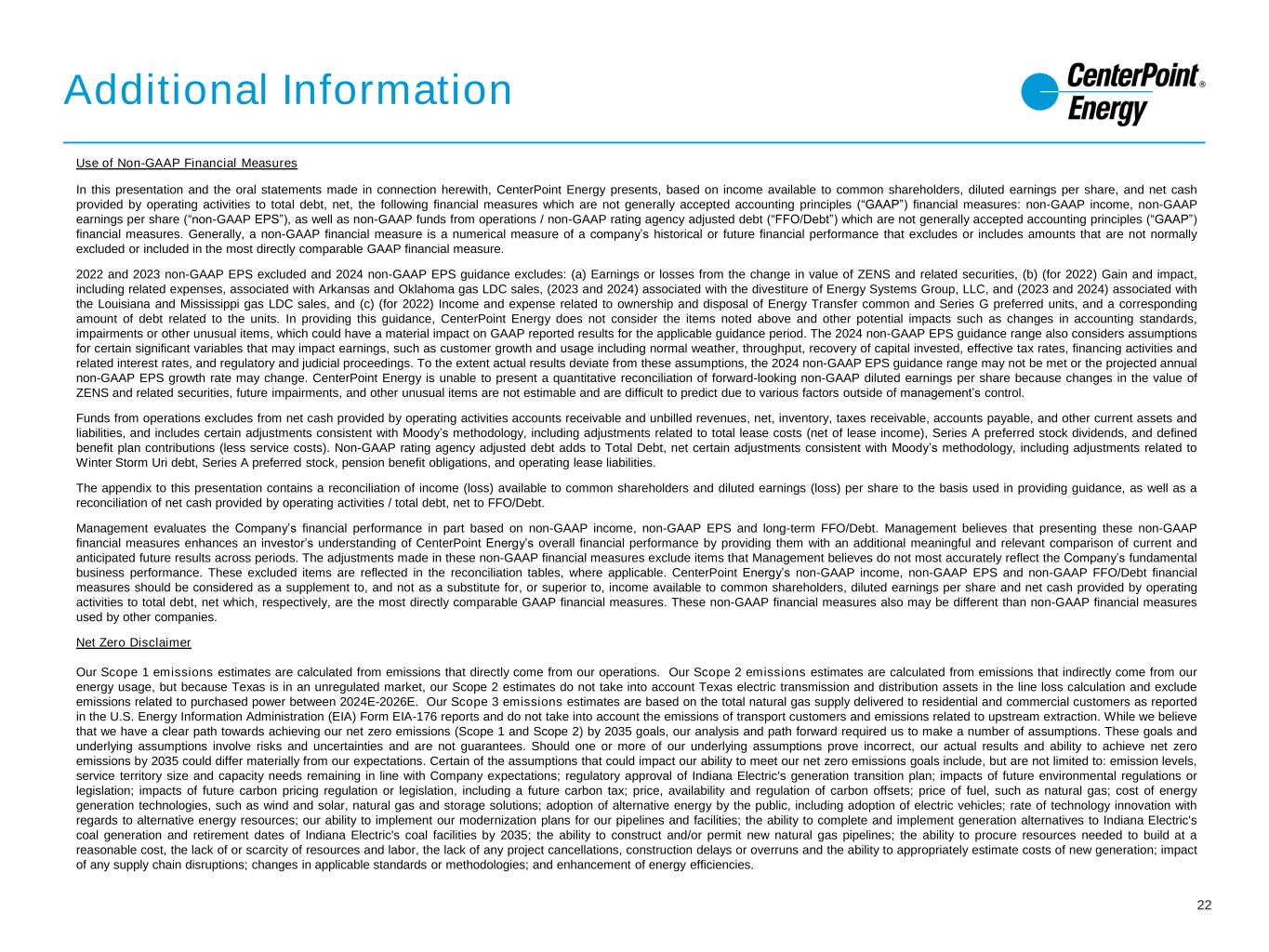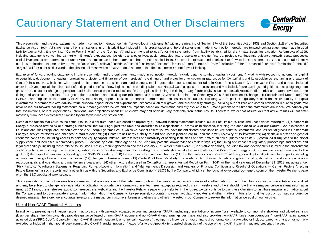 Use of Non-GAAP Financial Measures In this presentation and the oral statements made in connection herewith, CenterPoint Energy presents, based on income available to common shareholders, diluted earnings per share, and net cash provided by operating activities to total debt, net, the following financial measures which are not generally accepted accounting principles (“GAAP”) financial measures: non-GAAP income, non-GAAP earnings per share (“non-GAAP EPS”), as well as non-GAAP funds from operations / non-GAAP rating agency adjusted debt (“FFO/Debt”) which are not generally accepted accounting principles (“GAAP”) financial measures. Generally, a non-GAAP financial measure is a numerical measure of a company’s historical or future financial performance that excludes or includes amounts that are not normally excluded or included in the most directly comparable GAAP financial measure. 2022 and 2023 non-GAAP EPS excluded and 2024 non-GAAP EPS guidance excludes: (a) Earnings or losses from the change in value of ZENS and related securities, (b) (for 2022) Gain and impact, including related expenses, associated with Arkansas and Oklahoma gas LDC sales, (2023 and 2024) associated with the divestiture of Energy Systems Group, LLC, and (2023 and 2024) associated with the Louisiana and Mississippi gas LDC sales, and (c) (for 2022) Income and expense related to ownership and disposal of Energy Transfer common and Series G preferred units, and a corresponding amount of debt related to the units. In providing this guidance, CenterPoint Energy does not consider the items noted above and other potential impacts such as changes in accounting standards, impairments or other unusual items, which could have a material impact on GAAP reported results for the applicable guidance period. The 2024 non-GAAP EPS guidance range also considers assumptions for certain significant variables that may impact earnings, such as customer growth and usage including normal weather, throughput, recovery of capital invested, effective tax rates, financing activities and related interest rates, and regulatory and judicial proceedings. To the extent actual results deviate from these assumptions, the 2024 non-GAAP EPS guidance range may not be met or the projected annual non-GAAP EPS growth rate may change. CenterPoint Energy is unable to present a quantitative reconciliation of forward-looking non-GAAP diluted earnings per share because changes in the value of ZENS and related securities, future impairments, and other unusual items are not estimable and are difficult to predict due to various factors outside of management’s control. Funds from operations excludes from net cash provided by operating activities accounts receivable and unbilled revenues, net, inventory, taxes receivable, accounts payable, and other current assets and liabilities, and includes certain adjustments consistent with Moody’s methodology, including adjustments related to total lease costs (net of lease income), Series A preferred stock dividends, and defined benefit plan contributions (less service costs). Non-GAAP rating agency adjusted debt adds to Total Debt, net certain adjustments consistent with Moody’s methodology, including adjustments related to Winter Storm Uri debt, Series A preferred stock, pension benefit obligations, and operating lease liabilities. The appendix to this presentation contains a reconciliation of income (loss) available to common shareholders and diluted earnings (loss) per share to the basis used in providing guidance, as well as a reconciliation of net cash provided by operating activities / total debt, net to FFO/Debt. Management evaluates the Company’s financial performance in part based on non-GAAP income, non-GAAP EPS and long-term FFO/Debt. Management believes that presenting these non-GAAP financial measures enhances an investor’s understanding of CenterPoint Energy’s overall financial performance by providing them with an additional meaningful and relevant comparison of current and anticipated future results across periods. The adjustments made in these non-GAAP financial measures exclude items that Management believes do not most accurately reflect the Company’s fundamental business performance. These excluded items are reflected in the reconciliation tables, where applicable. CenterPoint Energy’s non-GAAP income, non-GAAP EPS and non-GAAP FFO/Debt financial measures should be considered as a supplement to, and not as a substitute for, or superior to, income available to common shareholders, diluted earnings per share and net cash provided by operating activities to total debt, net which, respectively, are the most directly comparable GAAP financial measures. These non-GAAP financial measures also may be different than non-GAAP financial measures used by other companies. Net Zero Disclaimer Our Scope 1 emissions estimates are calculated from emissions that directly come from our operations. Our Scope 2 emissions estimates are calculated from emissions that indirectly come from our energy usage, but because Texas is in an unregulated market, our Scope 2 estimates do not take into account Texas electric transmission and distribution assets in the line loss calculation and exclude emissions related to purchased power between 2024E-2026E. Our Scope 3 emissions estimates are based on the total natural gas supply delivered to residential and commercial customers as reported in the U.S. Energy Information Administration (EIA) Form EIA-176 reports and do not take into account the emissions of transport customers and emissions related to upstream extraction. While we believe that we have a clear path towards achieving our net zero emissions (Scope 1 and Scope 2) by 2035 goals, our analysis and path forward required us to make a number of assumptions. These goals and underlying assumptions involve risks and uncertainties and are not guarantees. Should one or more of our underlying assumptions