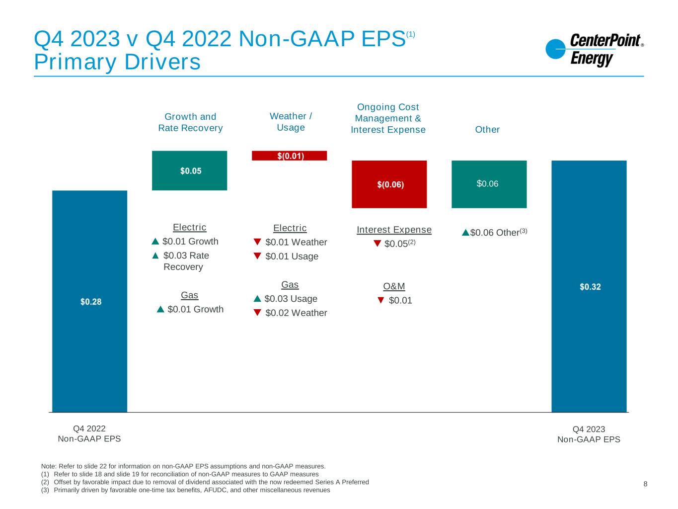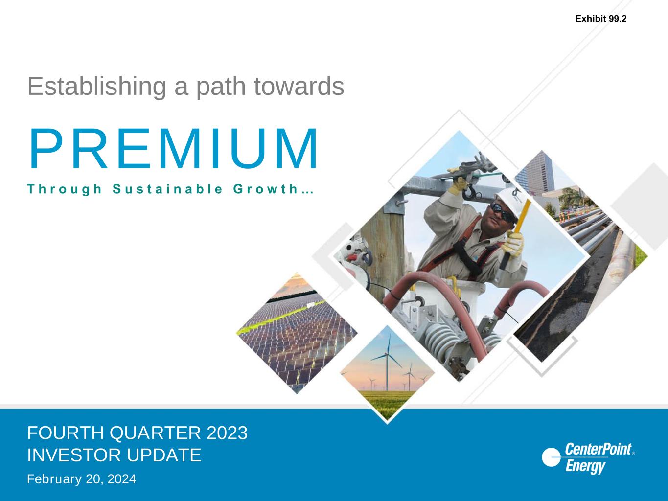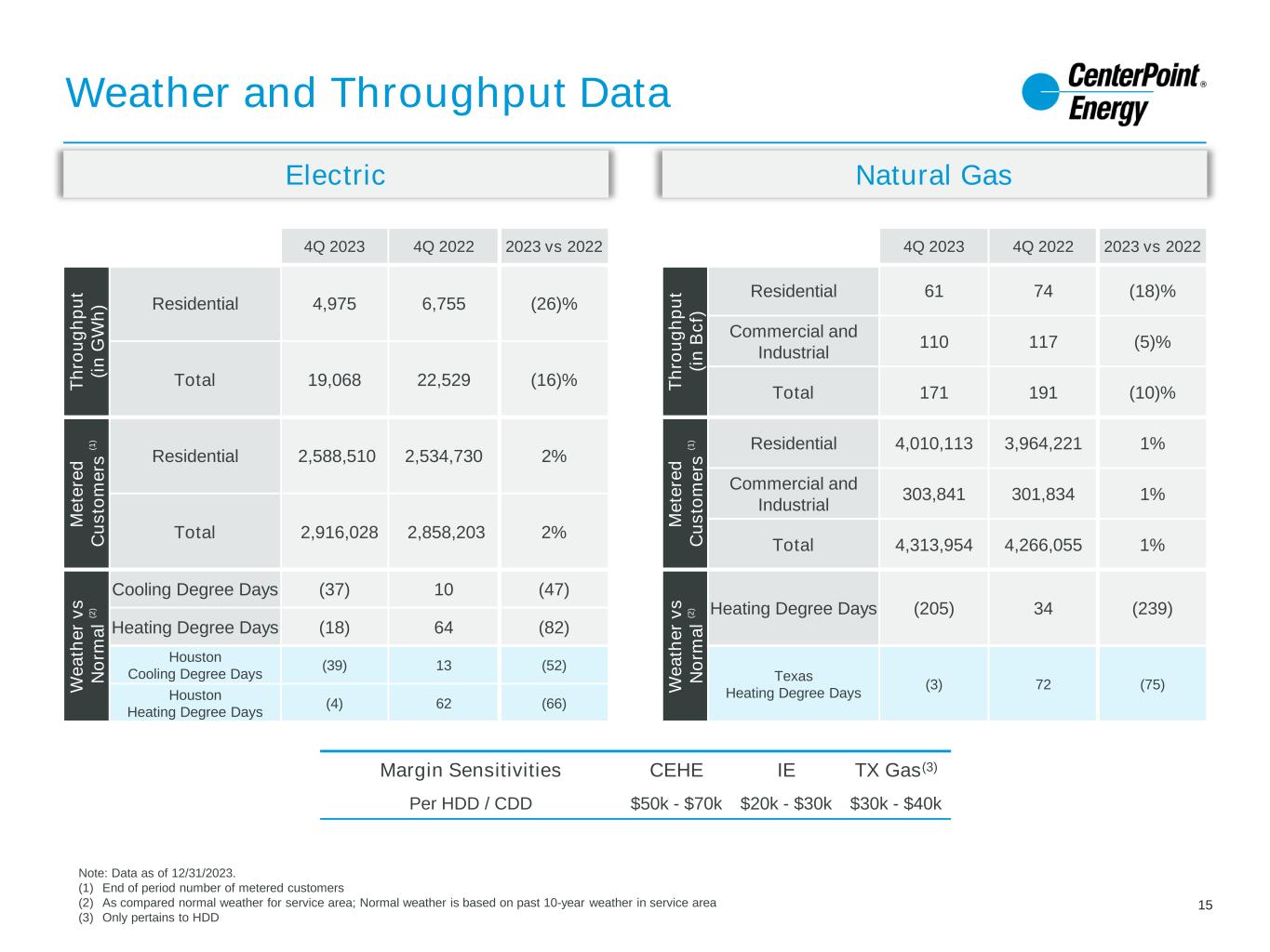 Use of Non-GAAP Financial Measures In this presentation and the oral statements made in connection herewith, CenterPoint Energy presents, based on income available to common shareholders, diluted earnings per share, and net cash provided by operating activities to total debt, net, the following financial measures which are not generally accepted accounting principles (“GAAP”) financial measures: non-GAAP income, non-GAAP earnings per share (“non-GAAP EPS”), as well as non-GAAP funds from operations / non-GAAP rating agency adjusted debt (“FFO/Debt”) which are not generally accepted accounting principles (“GAAP”) financial measures. Generally, a non-GAAP financial measure is a numerical measure of a company’s historical or future financial performance that excludes or includes amounts that are not normally excluded or included in the most directly comparable GAAP financial measure. 2022 and 2023 non-GAAP EPS excluded and 2024 non-GAAP EPS guidance excludes: (a) Earnings or losses from the change in value of ZENS and related securities, (b) (for 2022) Gain and impact, including related expenses, associated with Arkansas and Oklahoma gas LDC sales, (2023 and 2024) associated with the divestiture of Energy Systems Group, LLC, and (2023 and 2024) associated with the Louisiana and Mississippi gas LDC sales, and (c) (for 2022) Income and expense related to ownership and disposal of Energy Transfer common and Series G preferred units, and a corresponding amount of debt related to the units. In providing this guidance, CenterPoint Energy does not consider the items noted above and other potential impacts such as changes in accounting standards, impairments or other unusual items, which could have a material impact on GAAP reported results for the applicable guidance period. The 2024 non-GAAP EPS guidance range also considers assumptions for certain significant variables that may impact earnings, such as customer growth and usage including normal weather, throughput, recovery of capital invested, effective tax rates, financing activities and related interest rates, and regulatory and judicial proceedings. To the extent actual results deviate from these assumptions, the 2024 non-GAAP EPS guidance range may not be met or the projected annual non-GAAP EPS growth rate may change. CenterPoint Energy is unable to present a quantitative reconciliation of forward-looking non-GAAP diluted earnings per share because changes in the value of ZENS and related securities, future impairments, and other unusual items are not estimable and are difficult to predict due to various factors outside of management’s control. Funds from operations excludes from net cash provided by operating activities accounts receivable and unbilled revenues, net, inventory, taxes receivable, accounts payable, and other current assets and liabilities, and includes certain adjustments consistent with Moody’s methodology, including adjustments related to total lease costs (net of lease income), Series A preferred stock dividends, and defined benefit plan contributions (less service costs). Non-GAAP rating agency adjusted debt adds to Total Debt, net certain adjustments consistent with Moody’s methodology, including adjustments related to Winter Storm Uri debt, Series A preferred stock, pension benefit obligations, and operating lease liabilities. The appendix to this presentation contains a reconciliation of income (loss) available to common shareholders and diluted earnings (loss) per share to the basis used in providing guidance, as well as a reconciliation of net cash provided by operating activities / total debt, net to FFO/Debt. Management evaluates the Company’s financial performance in part based on non-GAAP income, non-GAAP EPS and long-term FFO/Debt. Management believes that presenting these non-GAAP financial measures enhances an investor’s understanding of CenterPoint Energy’s overall financial performance by providing them with an additional meaningful and relevant comparison of current and anticipated future results across periods. The adjustments made in these non-GAAP financial measures exclude items that Management believes do not most accurately reflect the Company’s fundamental business performance. These excluded items are reflected in the reconciliation tables, where applicable. CenterPoint Energy’s non-GAAP income, non-GAAP EPS and non-GAAP FFO/Debt financial measures should be considered as a supplement to, and not as a substitute for, or superior to, income available to common shareholders, diluted earnings per share and net cash provided by operating activities to total debt, net which, respectively, are the most directly comparable GAAP financial measures. These non-GAAP financial measures also may be different than non-GAAP financial measures used by other companies. Net Zero Disclaimer Our Scope 1 emissions estimates are calculated from emissions that directly come from our operations. Our Scope 2 emissions estimates are calculated from emissions that indirectly come from our energy usage, but because Texas is in an unregulated market, our Scope 2 estimates do not take into account Texas electric transmission and distribution assets in the line loss calculation and exclude emissions related to purchased power between 2024E-2026E. Our Scope 3 emissions estimates are based on the total natural gas supply delivered to residential and commercial customers as reported in the U.S. Energy Information Administration (EIA) Form EIA-176 reports and do not take into account the emissions of transport customers and emissions related to upstream extraction. While we believe that we have a clear path towards achieving our net zero emissions (Scope 1 and Scope 2) by 2035 goals, our analysis and path forward required us to make a number of assumptions. These goals and underlying assumptions involve risks and uncertainties and are not guarantees. Should one or more of our underlying assumptions