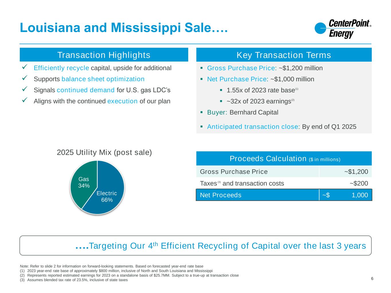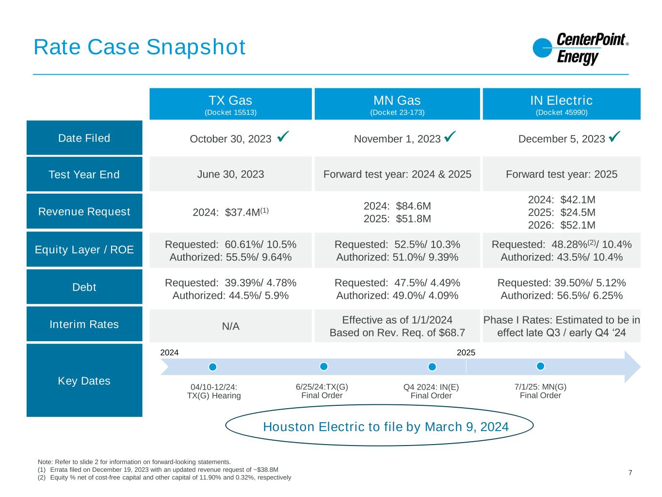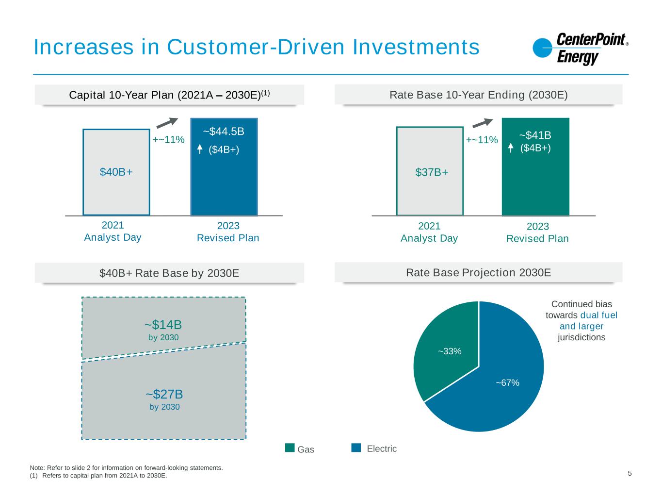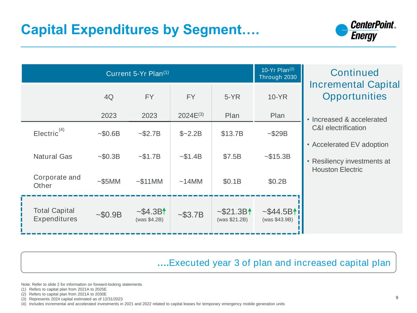 Use of Non-GAAP Financial Measures In this presentation and the oral statements made in connection herewith, CenterPoint Energy presents, based on income available to common shareholders, diluted earnings per share, and net cash provided by operating activities to total debt, net, the following financial measures which are not generally accepted accounting principles (“GAAP”) financial measures: non-GAAP income, non-GAAP earnings per share (“non-GAAP EPS”), as well as non-GAAP funds from operations / non-GAAP rating agency adjusted debt (“FFO/Debt”) which are not generally accepted accounting principles (“GAAP”) financial measures. Generally, a non-GAAP financial measure is a numerical measure of a company’s historical or future financial performance that excludes or includes amounts that are not normally excluded or included in the most directly comparable GAAP financial measure. 2022 and 2023 non-GAAP EPS excluded and 2024 non-GAAP EPS guidance excludes: (a) Earnings or losses from the change in value of ZENS and related securities, (b) (for 2022) Gain and impact, including related expenses, associated with Arkansas and Oklahoma gas LDC sales, (2023 and 2024) associated with the divestiture of Energy Systems Group, LLC, and (2023 and 2024) associated with the Louisiana and Mississippi gas LDC sales, and (c) (for 2022) Income and expense related to ownership and disposal of Energy Transfer common and Series G preferred units, and a corresponding amount of debt related to the units. In providing this guidance, CenterPoint Energy does not consider the items noted above and other potential impacts such as changes in accounting standards, impairments or other unusual items, which could have a material impact on GAAP reported results for the applicable guidance period. The 2024 non-GAAP EPS guidance range also considers assumptions for certain significant variables that may impact earnings, such as customer growth and usage including normal weather, throughput, recovery of capital invested, effective tax rates, financing activities and related interest rates, and regulatory and judicial proceedings. To the extent actual results deviate from these assumptions, the 2024 non-GAAP EPS guidance range may not be met or the projected annual non-GAAP EPS growth rate may change. CenterPoint Energy is unable to present a quantitative reconciliation of forward-looking non-GAAP diluted earnings per share because changes in the value of ZENS and related securities, future impairments, and other unusual items are not estimable and are difficult to predict due to various factors outside of management’s control. Funds from operations excludes from net cash provided by operating activities accounts receivable and unbilled revenues, net, inventory, taxes receivable, accounts payable, and other current assets and liabilities, and includes certain adjustments consistent with Moody’s methodology, including adjustments related to total lease costs (net of lease income), Series A preferred stock dividends, and defined benefit plan contributions (less service costs). Non-GAAP rating agency adjusted debt adds to Total Debt, net certain adjustments consistent with Moody’s methodology, including adjustments related to Winter Storm Uri debt, Series A preferred stock, pension benefit obligations, and operating lease liabilities. The appendix to this presentation contains a reconciliation of income (loss) available to common shareholders and diluted earnings (loss) per share to the basis used in providing guidance, as well as a reconciliation of net cash provided by operating activities / total debt, net to FFO/Debt. Management evaluates the Company’s financial performance in part based on non-GAAP income, non-GAAP EPS and long-term FFO/Debt. Management believes that presenting these non-GAAP financial measures enhances an investor’s understanding of CenterPoint Energy’s overall financial performance by providing them with an additional meaningful and relevant comparison of current and anticipated future results across periods. The adjustments made in these non-GAAP financial measures exclude items that Management believes do not most accurately reflect the Company’s fundamental business performance. These excluded items are reflected in the reconciliation tables, where applicable. CenterPoint Energy’s non-GAAP income, non-GAAP EPS and non-GAAP FFO/Debt financial measures should be considered as a supplement to, and not as a substitute for, or superior to, income available to common shareholders, diluted earnings per share and net cash provided by operating activities to total debt, net which, respectively, are the most directly comparable GAAP financial measures. These non-GAAP financial measures also may be different than non-GAAP financial measures used by other companies. Net Zero Disclaimer Our Scope 1 emissions estimates are calculated from emissions that directly come from our operations. Our Scope 2 emissions estimates are calculated from emissions that indirectly come from our energy usage, but because Texas is in an unregulated market, our Scope 2 estimates do not take into account Texas electric transmission and distribution assets in the line loss calculation and exclude emissions related to purchased power between 2024E-2026E. Our Scope 3 emissions estimates are based on the total natural gas supply delivered to residential and commercial customers as reported in the U.S. Energy Information Administration (EIA) Form EIA-176 reports and do not take into account the emissions of transport customers and emissions related to upstream extraction. While we believe that we have a clear path towards achieving our net zero emissions (Scope 1 and Scope 2) by 2035 goals, our analysis and path forward required us to make a number of assumptions. These goals and underlying assumptions involve risks and uncertainties and are not guarantees. Should one or more of our underlying assumptions