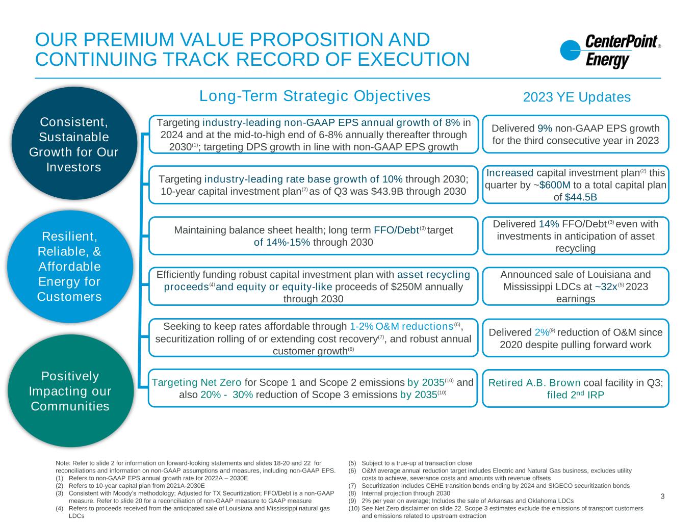 Cautionary Statement and Other Disclaimers 2 This presentation and the oral statements made in connection herewith contain “forward-looking statements” within the meaning of Section 27A of the Securities Act of 1933 and Section 21E of the Securities Exchange Act of 1934. All statements other than statements of historical fact included in this presentation and the oral statements made in connection herewith are forward-looking statements made in good faith by CenterPoint Energy, Inc. (“CenterPoint Energy” or the “Company”) and are intended to qualify for the safe harbor from liability established by the Private Securities Litigation Reform Act of 1995, including statements concerning CenterPoint Energy’s expectations, beliefs, plans, objectives, goals, strategies, future operations, events, financial position, earnings and guidance, growth, costs, prospects, capital investments or performance or underlying assumptions and other statements that are not historical facts. You should not place undue reliance on forward-looking statements. You can generally identify our forward-looking statements by the words “anticipate,” “believe,” “continue,” “could,” “estimate,” “expect,” “forecast,” “goal,” “intend,” “may,” “objective,” “plan,” “potential,” “predict,” “projection,” “should,” “target,” “will,” or other similar words. The absence of these words, however, does not mean that the statements are not forward-looking. Examples of forward-looking statements in this presentation and the oral statements made in connection herewith include statements about capital investments (including with respect to incremental capital opportunities, deployment of capital, renewables projects, and financing of such projects), the timing of and projections for upcoming rate cases for CenterPoint and its subsidiaries, the timing and extent of CenterPoint's recovery, including with regards to its generation transition plans and projects, mobile generation spend, projects included in CenterPoint's Natural Gas Innovation Plan, and projects included under its 10-year capital plan, the extent of anticipated benefits of new legislation, the pending sale of our Natural Gas businesses in Louisiana and Mississippi, future earnings and guidance, including long-term growth rate, customer charges, operations and maintenance expense reductions, financing plans (including the timing of any future equity issuances, securitization, credit metrics and parent level debt), the timing and anticipated benefits of our generation transition plan, including our exit from coal and our 10-year capital plan, the Company’s 2.0% Zero-Premium Exchangeable Subordinated Notes due 2029 (“ZENS”) and impacts of the maturity of ZENS, tax planning opportunities, future financial performance and results of operations, including with respect to regulatory actions and recoverability of capital investments, customer rate affordability, value creation, opportunities and expectations, expected customer growth, and sustainability strategy, including our net zero and carbon emissions reduction goals. We have based our forward-looking statements on our management’s beliefs and assumptions based on information currently available to our management at the time the statements are made. We caution you that assumptions, beliefs, expectations, intentions, and projections about future events may and often do vary materially from actual results. Therefore, we cannot assure you that actual results will not differ materially from those expressed or implied by our forward-looking statements. Some of the factors that could cause actual results to differ from those expressed or implied by our forward-looking statements include, but are not limited to, risks and uncertainties relating to: (1) CenterPoint Energy’s business strategies and strategic initiatives, restructurings, joint ventures and acquisitions or dispositions of assets or businesses, including the announced sale of our Natural Gas businesses in Louisiana and Mississippi, and the completed sale of Energy Systems Group, which we cannot assure you will have the anticipated benefits to us; (2) industrial, commercial and residential growth in CenterPoint Energy’s service territories and changes in market demand; (3) CenterPoint Energy’s ability to fund and invest planned capital, and the timely recovery of its investments; (4) financial market and general economic conditions, including access to debt and equity capital, inflation, interest rates and instability of banking institutions and their effect on sales, prices and costs; (5) continued disruptions to the global supply chain and increases in commodity prices; (6) actions by credit rating agencies, including any potential downgrades to credit ratings; (7) the timing and impact of regulatory proceedings and actions and legal proceedings, including those related to Houston Electric’s mobile generation and the February 2021 winter storm event; (8) legislative decisions, including tax and developments related to the environment such as global climate change, air emissions, carbon, waste water discharges and the handling of coal combustion residuals, among others, and CenterPoint Energy’s net zero and carbon emissions reduction goals; (9) the impact of pandemics, including the COVID-19 pandemic; (10) the recording of impairment charges; (11) weather variations and CenterPoint Energy’s ability to mitigate weather impacts, including approval and timing of securitization issuances; (12) changes in business plans; (13) CenterPoint Energy’s ability to execute on its initiatives, targets and goals, including its net zero and carbon emissions reduction goals and operations and maintenance goals; and (14) other factors discussed in CenterPoint Energy’s Annual Report on Form 10-K for the fiscal year ended December 31, 2023, including under “Risk Factors,” “Cauti