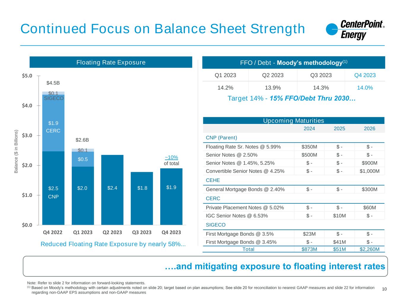Capital Expenditures by Segment…. 4Q FY FY 5-YR 10-YR 2023 2023 2024E(3) Plan Plan Electric (4) ~$0.6B ~$2.7B $~2.2B $13.7B ~$29B Natural Gas ~$0.3B ~$1.7B ~$1.4B $7.5B ~$15.3B Corporate and Other ~$5MM ~$11MM ~14MM $0.1B $0.2B Total Capital Expenditures ~$0.9B ~$4.3B (was $4.2B) ~$3.7B ~$21.3B (was $21.2B) ~$44.5B (was $43.9B) Note: Refer to slide 2 for information on forward-looking statements. (1) Refers to capital plan from 2021A to 2025E (2) Refers to capital plan from 2021A to 2030E (3) Represents 2024 capital estimated as of 12/31/2023 (4) Includes incremental and accelerated investments in 2021 and 2022 related to capital leases for temporary emergency mobile generation units Current 5-Yr Plan(1) 10-Yr Plan(2) Through 2030 Continued Incremental Capital Opportunities • Increased & accelerated C&I electrification • Accelerated EV adoption • Resiliency investments at Houston Electric ….Executed year 3 of plan and increased capital plan 9