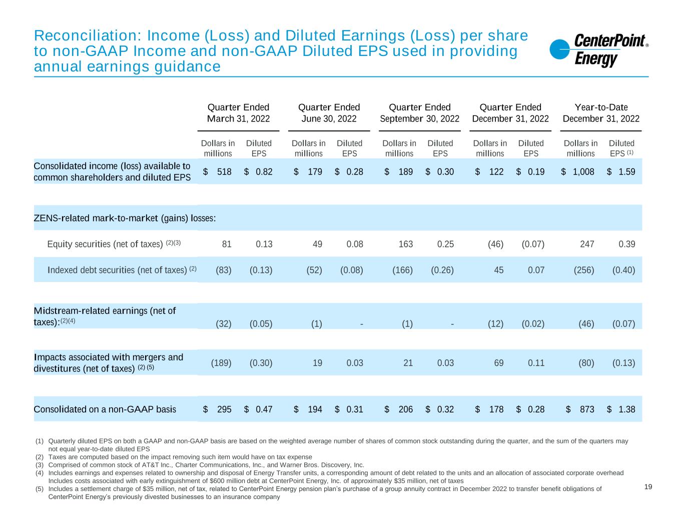 Reconciliation: Income (Loss) and Diluted Earnings (Loss) per share to non-GAAP Income and non-GAAP Diluted EPS used in providing annual earnings guidance (1) Quarterly diluted EPS on both a GAAP and non-GAAP basis are based on the weighted average number of shares of common stock outstanding during the quarter, and the sum of the quarters may not equal year-to-date diluted EPS (2) Taxes are computed based on the impact removing such item would have on tax expense. Taxes related to the operating results of Energy Systems Group, as well as cash taxes payable and other tax impacts related to the sale of Energy Systems Group, are excluded from non-GAAP EPS (3) Comprised of common stock of AT&T Inc., Charter Communications, Inc., and Warner Bros. Discovery, Inc. (4) Includes $4.4 million of pre-tax operating loss related to Energy Systems Group, a divested non-regulated business, as well as the $13 million loss on sale and approximately $2 million of other indirect related transaction costs associated with the divestiture Quarter Ended March 31, 2023 Quarter Ended June 30, 2023 Quarter Ended September 30, 2023 Quarter Ended December 31, 2023 Year-to-Date December 31, 2023 Dollars in millions Diluted EPS Dollars in millions Diluted EPS Dollars in millions Diluted EPS Dollars in millions Diluted EPS Dollars in millions Diluted EPS (1) Consolidated income (loss) available to common shareholders and diluted EPS $ 313 $ 0.49 $ 106 $ 0.17 $ 256 $ 0.40 $ 192 $ 0.30 $ 867 $ 1.37 ZENS-related mark-to-market (gains) losses: Equity securities (net of taxes) (2)(3) (31) (0.05) 25 0.04 (39) (0.06) 20 0.03 (25) (0.04) Indexed debt securities (net of taxes) (2) 31 0.05 (27) (0.04) 37 0.06 (20) (0.03) 21 0.03 Impacts associated with mergers and divestitures (net of taxes) (2)(4) 1 0.00 74 0.12 2 - 12 0.02 89 0.14 Consolidated on a non-GAAP basis $ 314 $ 0.50 $ 178 $ 0.28 $ 256 $ 0.40 $ 204 $ 0.32 $ 952 $ 1.50 18