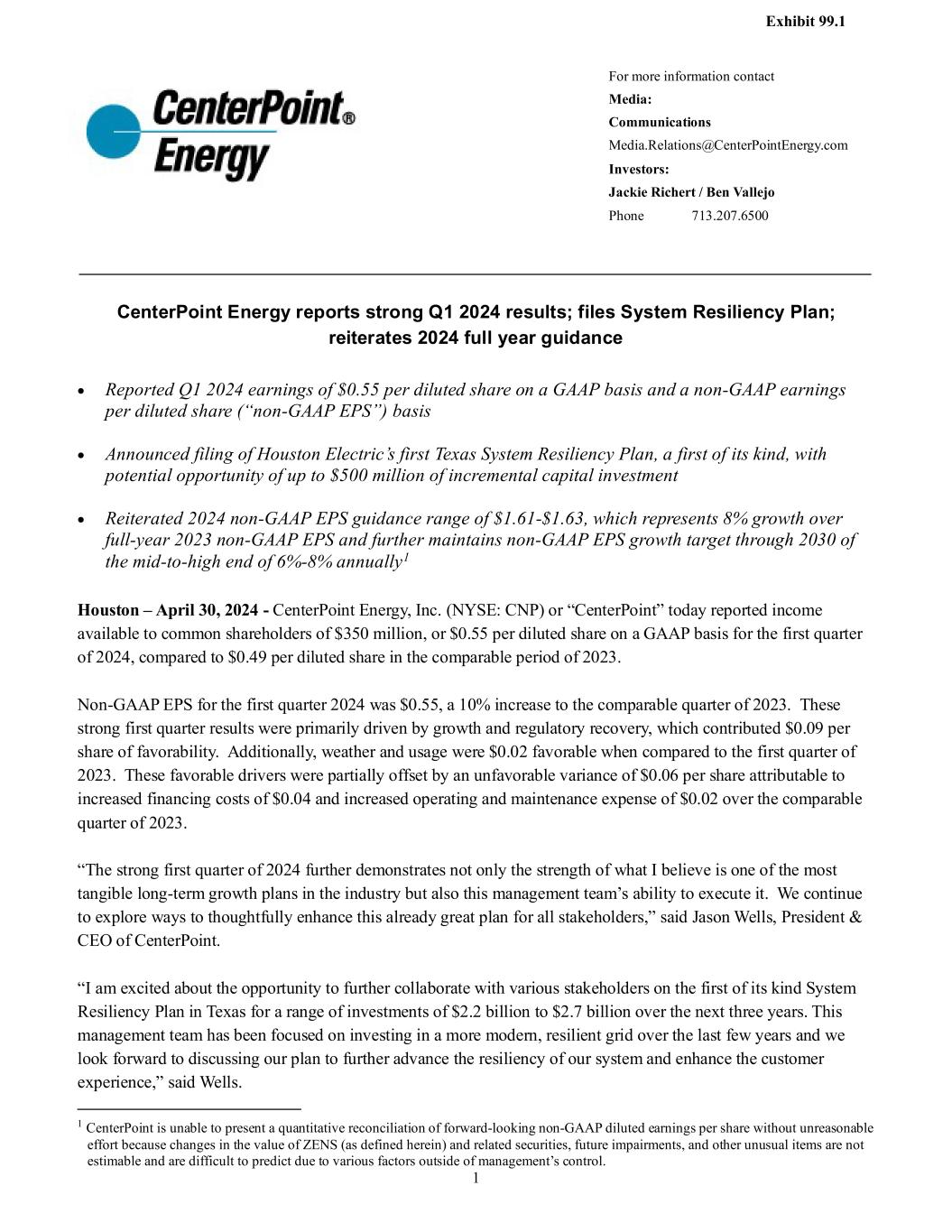 1 CenterPoint Energy reports strong Q1 2024 results; files System Resiliency Plan; reiterates 2024 full year guidance • Reported Q1 2024 earnings of $0.55 per diluted share on a GAAP basis and a non-GAAP earnings per diluted share (“non-GAAP EPS”) basis • Announced filing of Houston Electric’s first Texas System Resiliency Plan, a first of its kind, with potential opportunity of up to $500 million of incremental capital investment • Reiterated 2024 non-GAAP EPS guidance range of $1.61-$1.63, which represents 8% growth over full-year 2023 non-GAAP EPS and further maintains non-GAAP EPS growth target through 2030 of the mid-to-high end of 6%-8% annually1 Houston – April 30, 2024 - CenterPoint Energy, Inc. (NYSE: CNP) or “CenterPoint” today reported income available to common shareholders of $350 million, or $0.55 per diluted share on a GAAP basis for the first quarter of 2024, compared to $0.49 per diluted share in the comparable period of 2023. Non-GAAP EPS for the first quarter 2024 was $0.55, a 10% increase to the comparable quarter of 2023. These strong first quarter results were primarily driven by growth and regulatory recovery, which contributed $0.09 per share of favorability. Additionally, weather and usage were $0.02 favorable when compared to the first quarter of 2023. These favorable drivers were partially offset by an unfavorable variance of $0.06 per share attributable to increased financing costs of $0.04 and increased operating and maintenance expense of $0.02 over the comparable quarter of 2023. “The strong first quarter of 2024 further demonstrates not only the strength of what I believe is one of the most tangible long-term growth plans in the industry but also this management team’s ability to execute it. We continue to explore ways to thoughtfully enhance this already great plan for all stakeholders,” said Jason Wells, President & CEO of CenterPoint. “I am excited about the opportunity to further collaborate with various stakeholders on the first of its kind System Resiliency Plan in Texas for a range of investments of $2.2 billion to $2.7 billion over the next three years. This management team has been focused on investing in a more modern, resilient grid over the last few years and we look forward to discussing our plan to further advance the resiliency of our system and enhance the customer experience,” said Wells. 1 CenterPoint is unable to present a quantitative reconciliation of forward-looking non-GAAP diluted earnings per share without unreasonable effort because changes in the value of ZENS (as defined herein) and related securities, future impairments, and other unusual items are not estimable and are difficult to predict due to various factors outside of management’s control. For more information contact Media: Communications Media.Relations@CenterPointEnergy.com Investors: Jackie Richert / Ben Vallejo Phone 713.207.6500 Exhibit 99.1