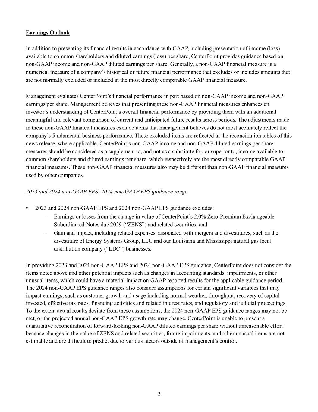 2 Earnings Outlook In addition to presenting its financial results in accordance with GAAP, including presentation of income (loss) available to common shareholders and diluted earnings (loss) per share, CenterPoint provides guidance based on non-GAAP income and non-GAAP diluted earnings per share. Generally, a non-GAAP financial measure is a numerical measure of a company’s historical or future financial performance that excludes or includes amounts that are not normally excluded or included in the most directly comparable GAAP financial measure. Management evaluates CenterPoint’s financial performance in part based on non-GAAP income and non-GAAP earnings per share. Management believes that presenting these non-GAAP financial measures enhances an investor’s understanding of CenterPoint’s overall financial performance by providing them with an additional meaningful and relevant comparison of current and anticipated future results across periods. The adjustments made in these non-GAAP financial measures exclude items that management believes do not most accurately reflect the company’s fundamental business performance. These excluded items are reflected in the reconciliation tables of this news release, where applicable. CenterPoint’s non-GAAP income and non-GAAP diluted earnings per share measures should be considered as a supplement to, and not as a substitute for, or superior to, income available to common shareholders and diluted earnings per share, which respectively are the most directly comparable GAAP financial measures. These non-GAAP financial measures also may be different than non-GAAP financial measures used by other companies. 2023 and 2024 non-GAAP EPS; 2024 non-GAAP EPS guidance range • 2023 and 2024 non-GAAP EPS and 2024 non-GAAP EPS guidance excludes: ◦ Earnings or losses from the change in value of CenterPoint’s 2.0% Zero-Premium Exchangeable Subordinated Notes due 2029 (“ZENS”) and related securities; and ◦ Gain and impact, including related expenses, associated with mergers and divestitures, such as the divestiture of Energy Systems Group, LLC and our Louisiana and Mississippi natural gas local distribution company (“LDC”) businesses. In providing 2023 and 2024 non-GAAP EPS and 2024 non-GAAP EPS guidance, CenterPoint does not consider the items noted above and other potential impacts such as changes in accounting standards, impairments, or other unusual items, which could have a material impact on GAAP reported results for the applicable guidance period. The 2024 non-GAAP EPS guidance ranges also consider assumptions for certain significant variables that may impact earnings, such as customer growth and usage including normal weather, throughput, recovery of capital invested, effective tax rates, financing activities and related interest rates, and regulatory and judicial proceedings. To the extent actual results deviate from these assumptions, the 2024 non-GAAP EPS guidance ranges may not be met, or the projected annual non-GAAP EPS growth rate may change. CenterPoint is unable to present a quantitative reconciliation of forward-looking non-GAAP diluted earnings per share without unreasonable effort because changes in the value of ZENS and related securities, future impairments, and other unusual items are not estimable and are difficult to predict due to various factors outside of management’s control.