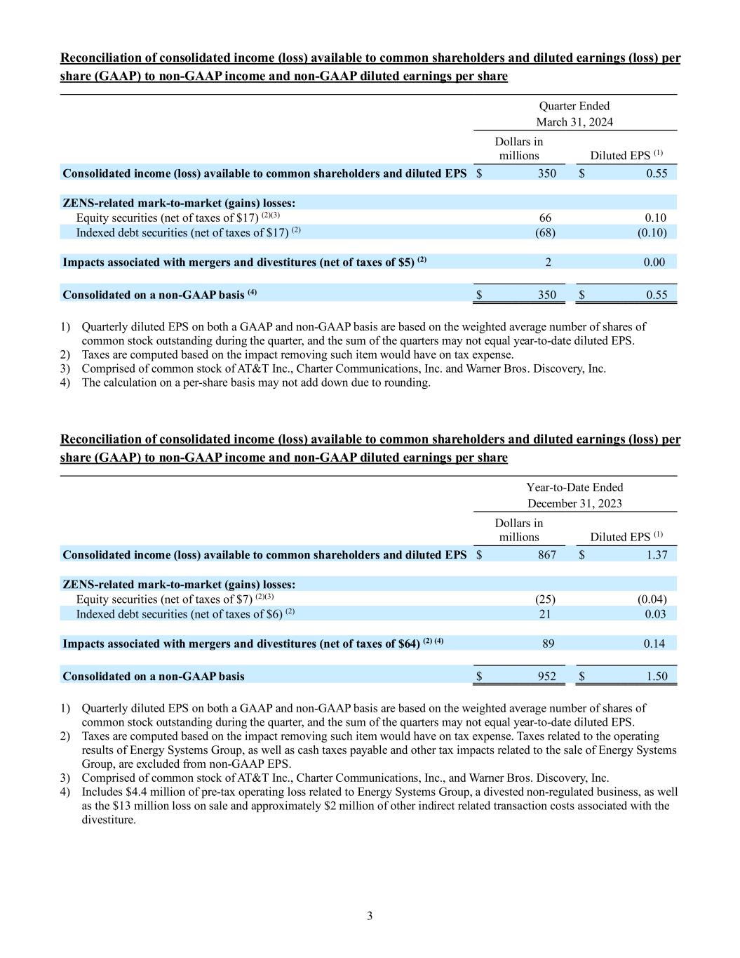 3 Reconciliation of consolidated income (loss) available to common shareholders and diluted earnings (loss) per share (GAAP) to non-GAAP income and non-GAAP diluted earnings per share Quarter Ended March 31, 2024 Dollars in millions Diluted EPS (1) Consolidated income (loss) available to common shareholders and diluted EPS $ 350 $ 0.55 ZENS-related mark-to-market (gains) losses: Equity securities (net of taxes of $17) (2)(3) 66 0.10 Indexed debt securities (net of taxes of $17) (2) (68) (0.10) Impacts associated with mergers and divestitures (net of taxes of $5) (2) 2 0.00 Consolidated on a non-GAAP basis (4) $ 350 $ 0.55 1) Quarterly diluted EPS on both a GAAP and non-GAAP basis are based on the weighted average number of shares of common stock outstanding during the quarter, and the sum of the quarters may not equal year-to-date diluted EPS. 2) Taxes are computed based on the impact removing such item would have on tax expense. 3) Comprised of common stock of AT&T Inc., Charter Communications, Inc. and Warner Bros. Discovery, Inc. 4) The calculation on a per-share basis may not add down due to rounding. Reconciliation of consolidated income (loss) available to common shareholders and diluted earnings (loss) per share (GAAP) to non-GAAP income and non-GAAP diluted earnings per share Year-to-Date Ended December 31, 2023 Dollars in millions Diluted EPS (1) Consolidated income (loss) available to common shareholders and diluted EPS $ 867 $ 1.37 ZENS-related mark-to-market (gains) losses: Equity securities (net of taxes of $7) (2)(3) (25) (0.04) Indexed debt securities (net of taxes of $6) (2) 21 0.03 Impacts associated with mergers and divestitures (net of taxes of $64) (2) (4) 89 0.14 Consolidated on a non-GAAP basis $ 952 $ 1.50 1) Quarterly diluted EPS on both a GAAP and non-GAAP basis are based on the weighted average number of shares of common stock outstanding during the quarter, and the sum of the quarters may not equal year-to-date diluted EPS. 2) Taxes are computed based on the impact removing such item would have on tax expense. Taxes related to the operating results of Energy Systems Group, as well as cash taxes payable and other tax impacts related to the sale of Energy Systems Group, are excluded from non-GAAP EPS. 3) Comprised of common stock of AT&T Inc., Charter Communications, Inc., and Warner Bros. Discovery, Inc. 4) Includes $4.4 million of pre-tax operating loss related to Energy Systems Group, a divested non-regulated business, as well as the $13 million loss on sale and approximately $2 million of other indirect related transaction costs associated with the divestiture.