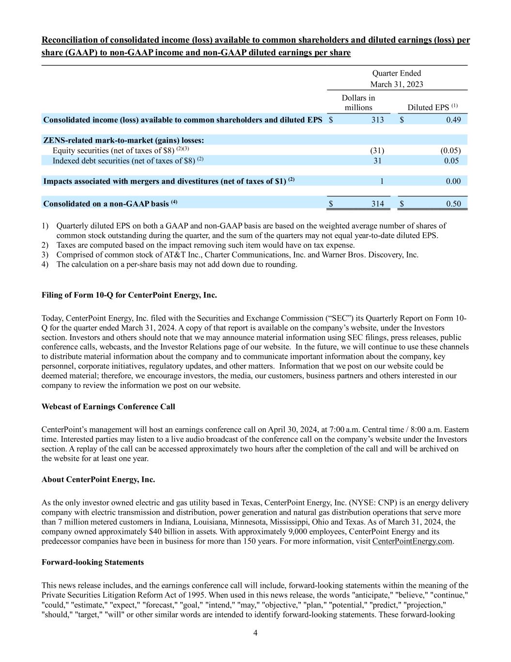 4 Reconciliation of consolidated income (loss) available to common shareholders and diluted earnings (loss) per share (GAAP) to non-GAAP income and non-GAAP diluted earnings per share Quarter Ended March 31, 2023 Dollars in millions Diluted EPS (1) Consolidated income (loss) available to common shareholders and diluted EPS $ 313 $ 0.49 ZENS-related mark-to-market (gains) losses: Equity securities (net of taxes of $8) (2)(3) (31) (0.05) Indexed debt securities (net of taxes of $8) (2) 31 0.05 Impacts associated with mergers and divestitures (net of taxes of $1) (2) 1 0.00 Consolidated on a non-GAAP basis (4) $ 314 $ 0.50 1) Quarterly diluted EPS on both a GAAP and non-GAAP basis are based on the weighted average number of shares of common stock outstanding during the quarter, and the sum of the quarters may not equal year-to-date diluted EPS. 2) Taxes are computed based on the impact removing such item would have on tax expense. 3) Comprised of common stock of AT&T Inc., Charter Communications, Inc. and Warner Bros. Discovery, Inc. 4) The calculation on a per-share basis may not add down due to rounding. Filing of Form 10-Q for CenterPoint Energy, Inc. Today, CenterPoint Energy, Inc. filed with the Securities and Exchange Commission (“SEC”) its Quarterly Report on Form 10- Q for the quarter ended March 31, 2024. A copy of that report is available on the company’s website, under the Investors section. Investors and others should note that we may announce material information using SEC filings, press releases, public conference calls, webcasts, and the Investor Relations page of our website. In the future, we will continue to use these channels to distribute material information about the company and to communicate important information about the company, key personnel, corporate initiatives, regulatory updates, and other matters. Information that we post on our website could be deemed material; therefore, we encourage investors, the media, our customers, business partners and others interested in our company to review the information we post on our website. Webcast of Earnings Conference Call CenterPoint’s management will host an earnings conference call on April 30, 2024, at 7:00 a.m. Central time / 8:00 a.m. Eastern time. Interested parties may listen to a live audio broadcast of the conference call on the company’s website under the Investors section. A replay of the call can be accessed approximately two hours after the completion of the call and will be archived on the website for at least one year. About CenterPoint Energy, Inc. As the only investor owned electric and gas utility based in Texas, CenterPoint Energy, Inc. (NYSE: CNP) is an energy delivery company with electric transmission and distribution, power generation and natural gas distribution operations that serve more than 7 million metered customers in Indiana, Louisiana, Minnesota, Mississippi, Ohio and Texas. As of March 31, 2024, the company owned approximately $40 billion in assets. With approximately 9,000 employees, CenterPoint Energy and its predecessor companies have been in business for more than 150 years. For more information, visit CenterPointEnergy.com. Forward-looking Statements This news release includes, and the earnings conference call will include, forward-looking statements within the meaning of the Private Securities Litigation Reform Act of 1995. When used in this news release, the words "anticipate," "believe," "continue," "could," "estimate," "expect," "forecast," "goal," "intend," "may," "objective," "plan," "potential," "predict," "projection," "should," "target," "will" or other similar words are intended to identify forward-looking statements. These forward-looking