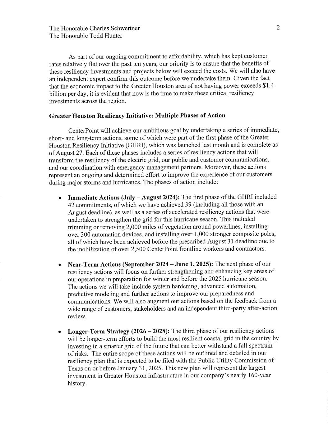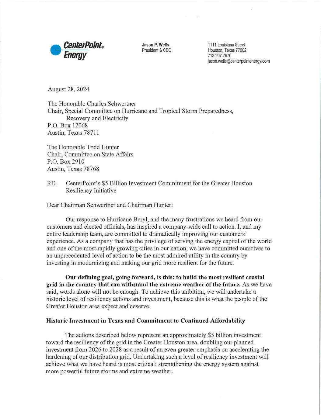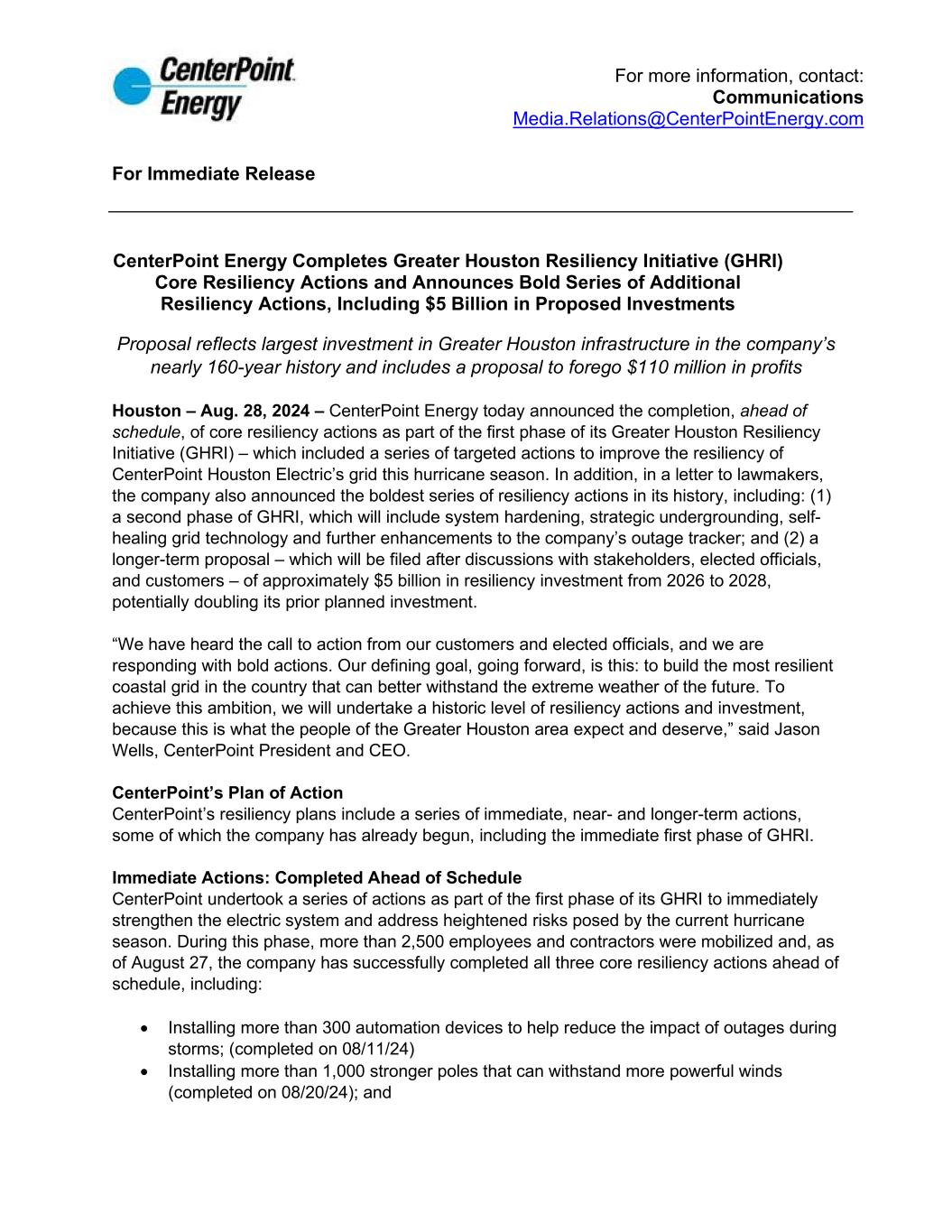 For Immediate Release For more information, contact: Communications Media.Relations@CenterPointEnergy.com CenterPoint Energy Completes Greater Houston Resiliency Initiative (GHRI) Core Resiliency Actions and Announces Bold Series of Additional Resiliency Actions, Including $5 Billion in Proposed Investments Proposal reflects largest investment in Greater Houston infrastructure in the company’s nearly 160-year history and includes a proposal to forego $110 million in profits Houston – Aug. 28, 2024 – CenterPoint Energy today announced the completion, ahead of schedule, of core resiliency actions as part of the first phase of its Greater Houston Resiliency Initiative (GHRI) – which included a series of targeted actions to improve the resiliency of CenterPoint Houston Electric’s grid this hurricane season. In addition, in a letter to lawmakers, the company also announced the boldest series of resiliency actions in its history, including: (1) a second phase of GHRI, which will include system hardening, strategic undergrounding, self- healing grid technology and further enhancements to the company’s outage tracker; and (2) a longer-term proposal – which will be filed after discussions with stakeholders, elected officials, and customers – of approximately $5 billion in resiliency investment from 2026 to 2028, potentially doubling its prior planned investment. “We have heard the call to action from our customers and elected officials, and we are responding with bold actions. Our defining goal, going forward, is this: to build the most resilient coastal grid in the country that can better withstand the extreme weather of the future. To achieve this ambition, we will undertake a historic level of resiliency actions and investment, because this is what the people of the Greater Houston area expect and deserve,” said Jason Wells, CenterPoint President and CEO. CenterPoint’s Plan of Action CenterPoint’s resiliency plans include a series of immediate, near- and longer-term actions, some of which the company has already begun, including the immediate first phase of GHRI. Immediate Actions: Completed Ahead of Schedule CenterPoint undertook a series of actions as part of the first phase of its GHRI to immediately strengthen the electric system and address heightened risks posed by the current hurricane season. During this phase, more than 2,500 employees and contractors were mobilized and, as of August 27, the company has successfully completed all three core resiliency actions ahead of schedule, including: • Installing more than 300 automation devices to help reduce the impact of outages during storms; (completed on 08/11/24) • Installing more than 1,000 stronger poles that can withstand more powerful winds (completed on 08/20/24); and