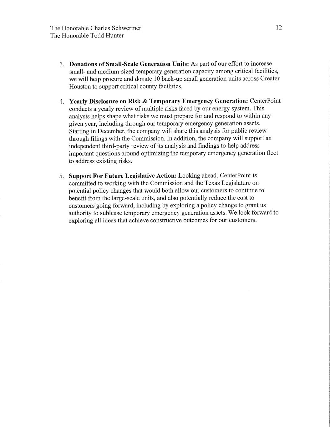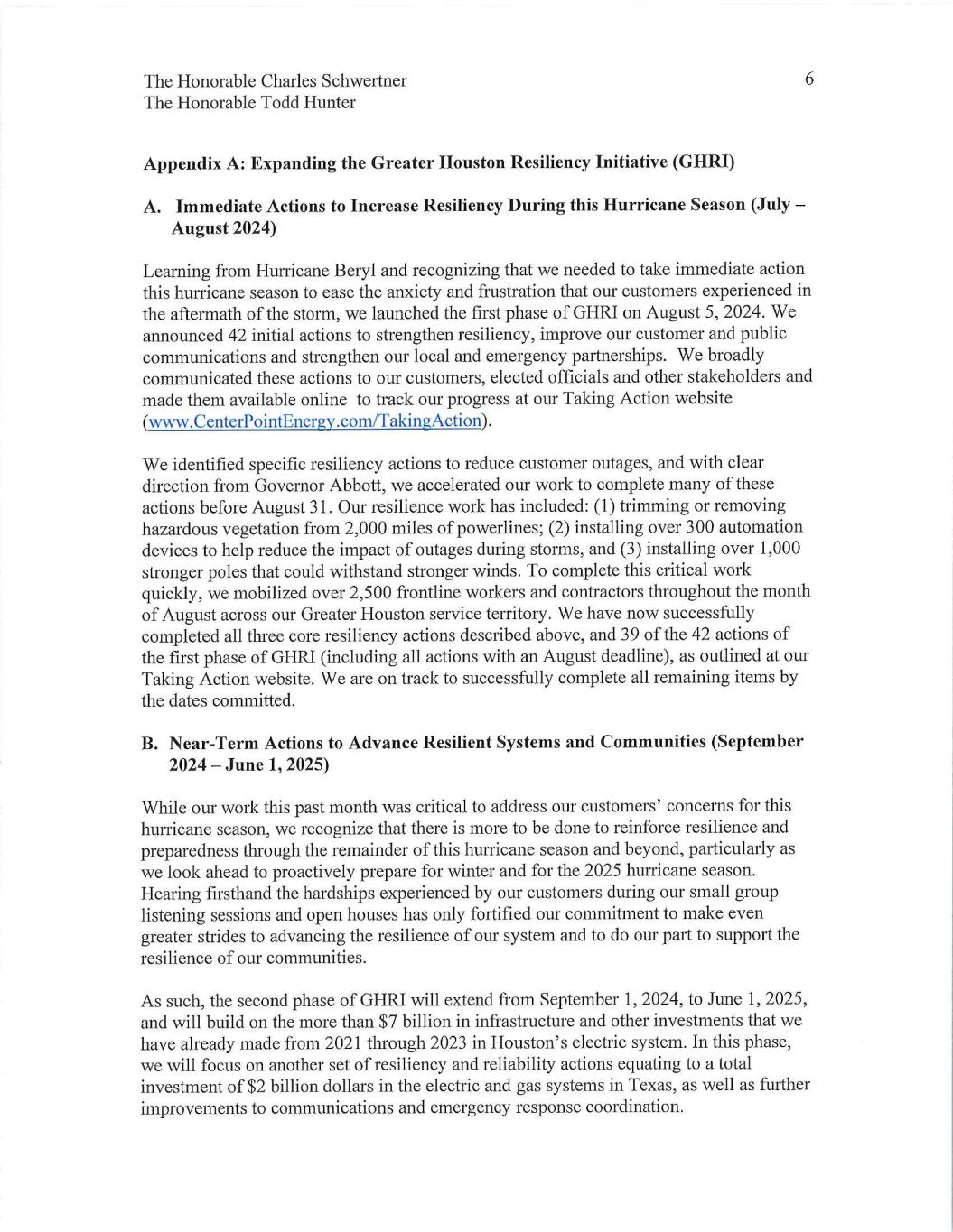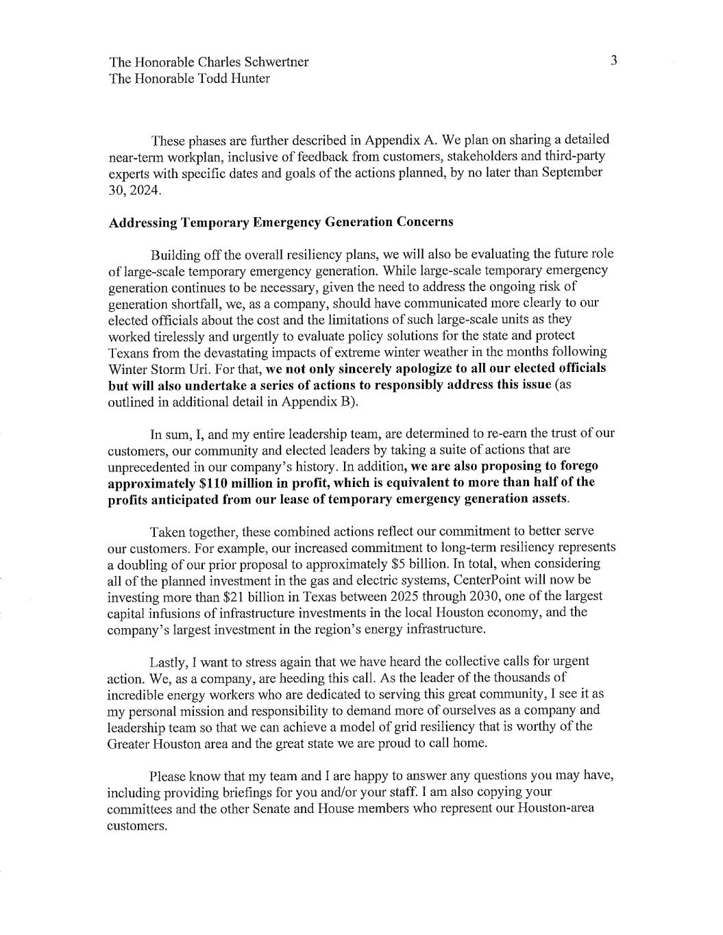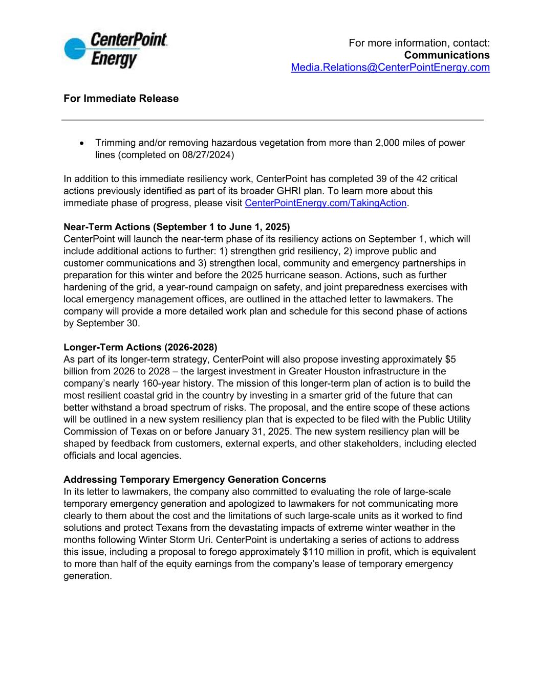 For Immediate Release For more information, contact: Communications Media.Relations@CenterPointEnergy.com • Trimming and/or removing hazardous vegetation from more than 2,000 miles of power lines (completed on 08/27/2024) In addition to this immediate resiliency work, CenterPoint has completed 39 of the 42 critical actions previously identified as part of its broader GHRI plan. To learn more about this immediate phase of progress, please visit CenterPointEnergy.com/TakingAction. Near-Term Actions (September 1 to June 1, 2025) CenterPoint will launch the near-term phase of its resiliency actions on September 1, which will include additional actions to further: 1) strengthen grid resiliency, 2) improve public and customer communications and 3) strengthen local, community and emergency partnerships in preparation for this winter and before the 2025 hurricane season. Actions, such as further hardening of the grid, a year-round campaign on safety, and joint preparedness exercises with local emergency management offices, are outlined in the attached letter to lawmakers. The company will provide a more detailed work plan and schedule for this second phase of actions by September 30. Longer-Term Actions (2026-2028) As part of its longer-term strategy, CenterPoint will also propose investing approximately $5 billion from 2026 to 2028 – the largest investment in Greater Houston infrastructure in the company’s nearly 160-year history. The mission of this longer-term plan of action is to build the most resilient coastal grid in the country by investing in a smarter grid of the future that can better withstand a broad spectrum of risks. The proposal, and the entire scope of these actions will be outlined in a new system resiliency plan that is expected to be filed with the Public Utility Commission of Texas on or before January 31, 2025. The new system resiliency plan will be shaped by feedback from customers, external experts, and other stakeholders, including elected officials and local agencies. Addressing Temporary Emergency Generation Concerns In its letter to lawmakers, the company also committed to evaluating the role of large-scale temporary emergency generation and apologized to lawmakers for not communicating more clearly to them about the cost and the limitations of such large-scale units as it worked to find solutions and protect Texans from the devastating impacts of extreme winter weather in the months following Winter Storm Uri. CenterPoint is undertaking a series of actions to address this issue, including a proposal to forego approximately $110 million in profit, which is equivalent to more than half of the equity earnings from the company’s lease of temporary emergency generation.