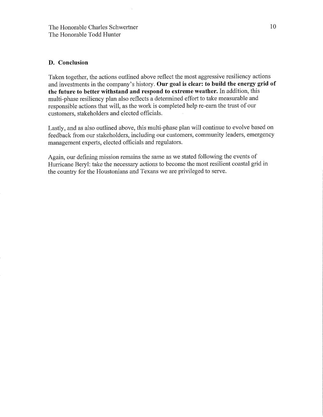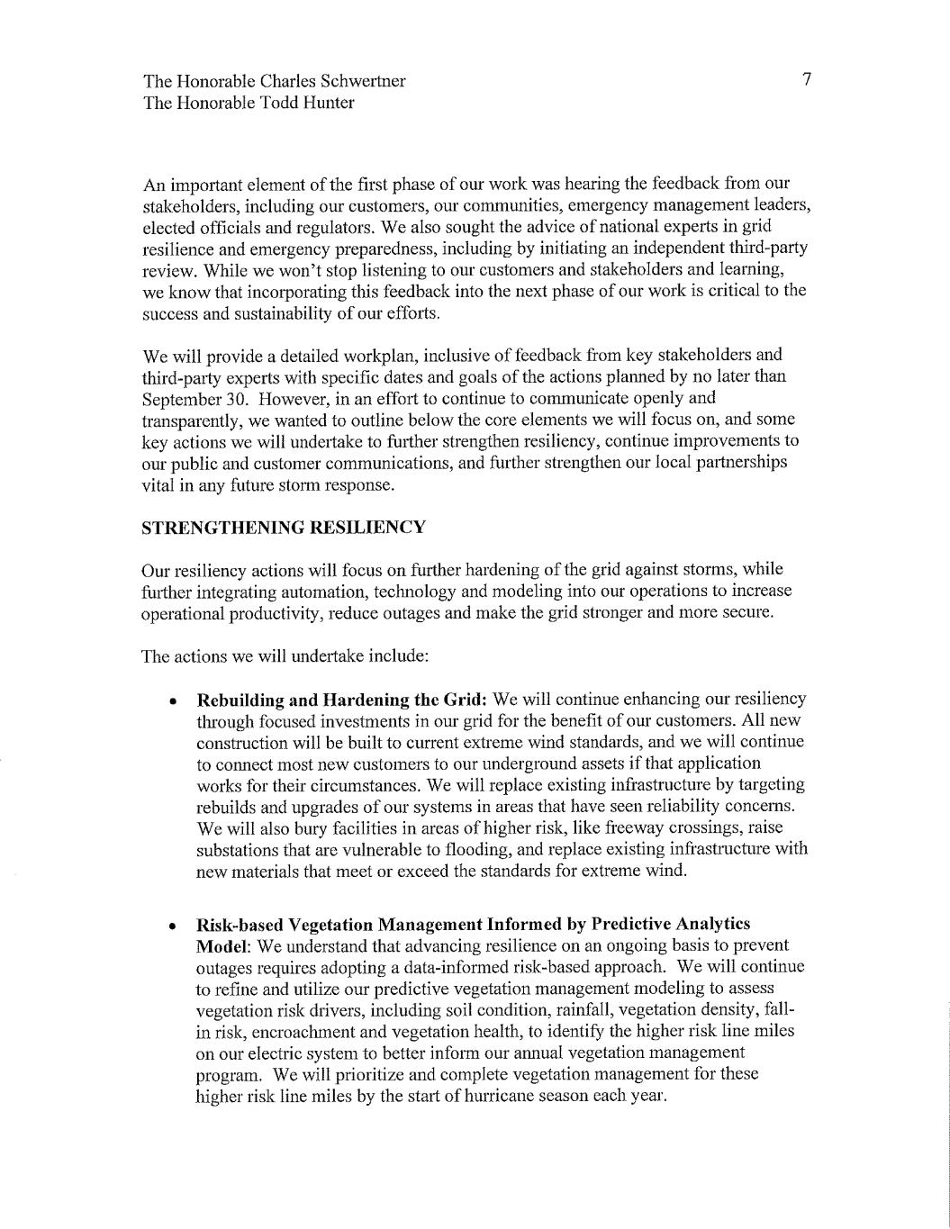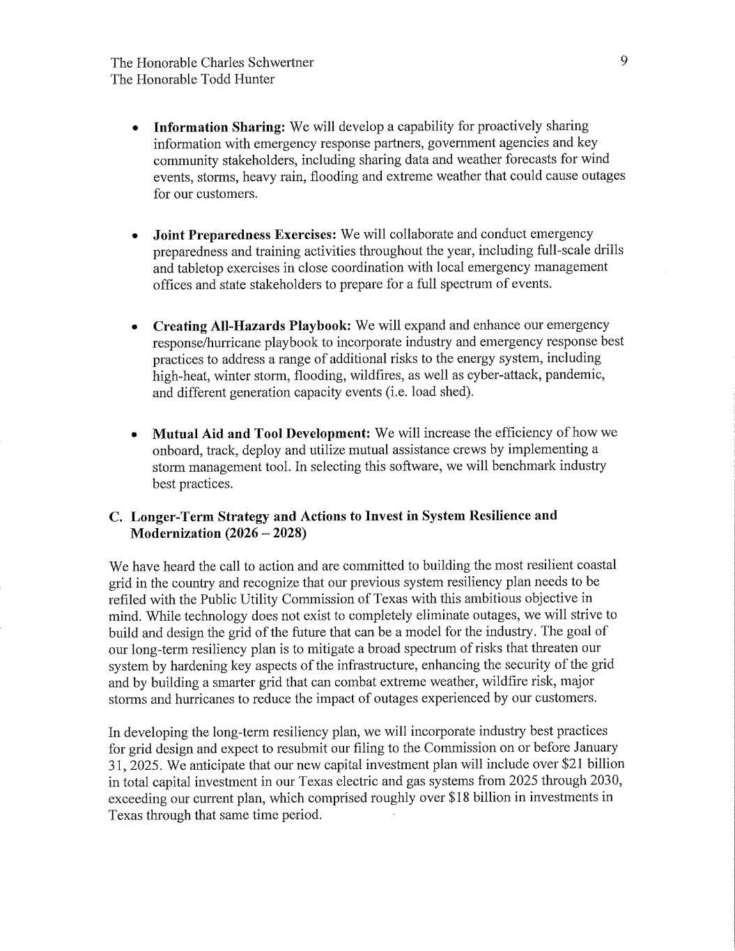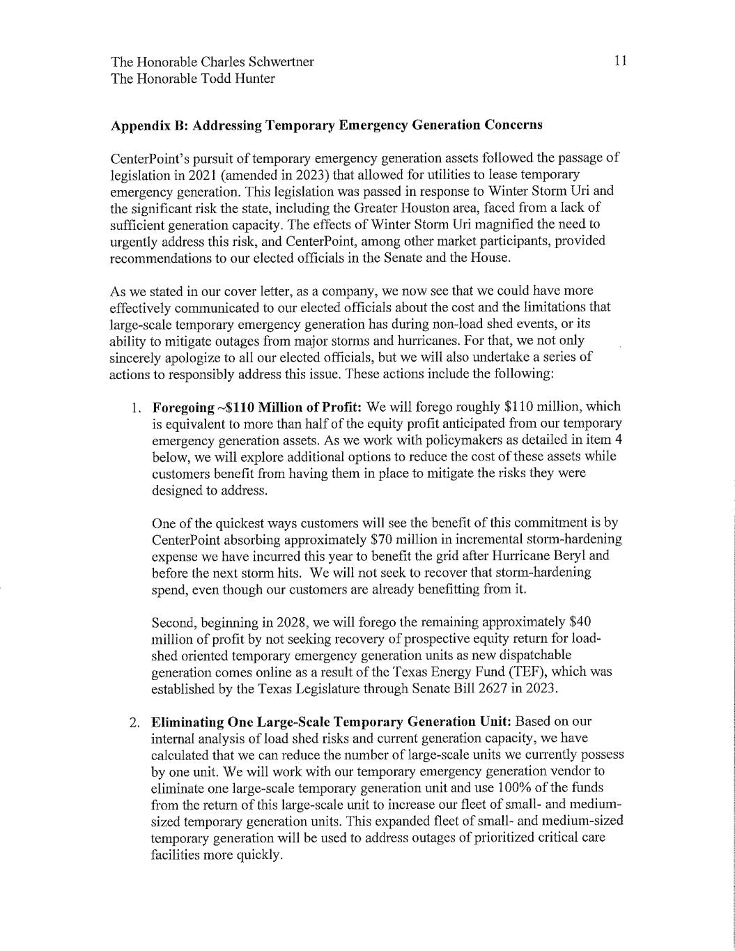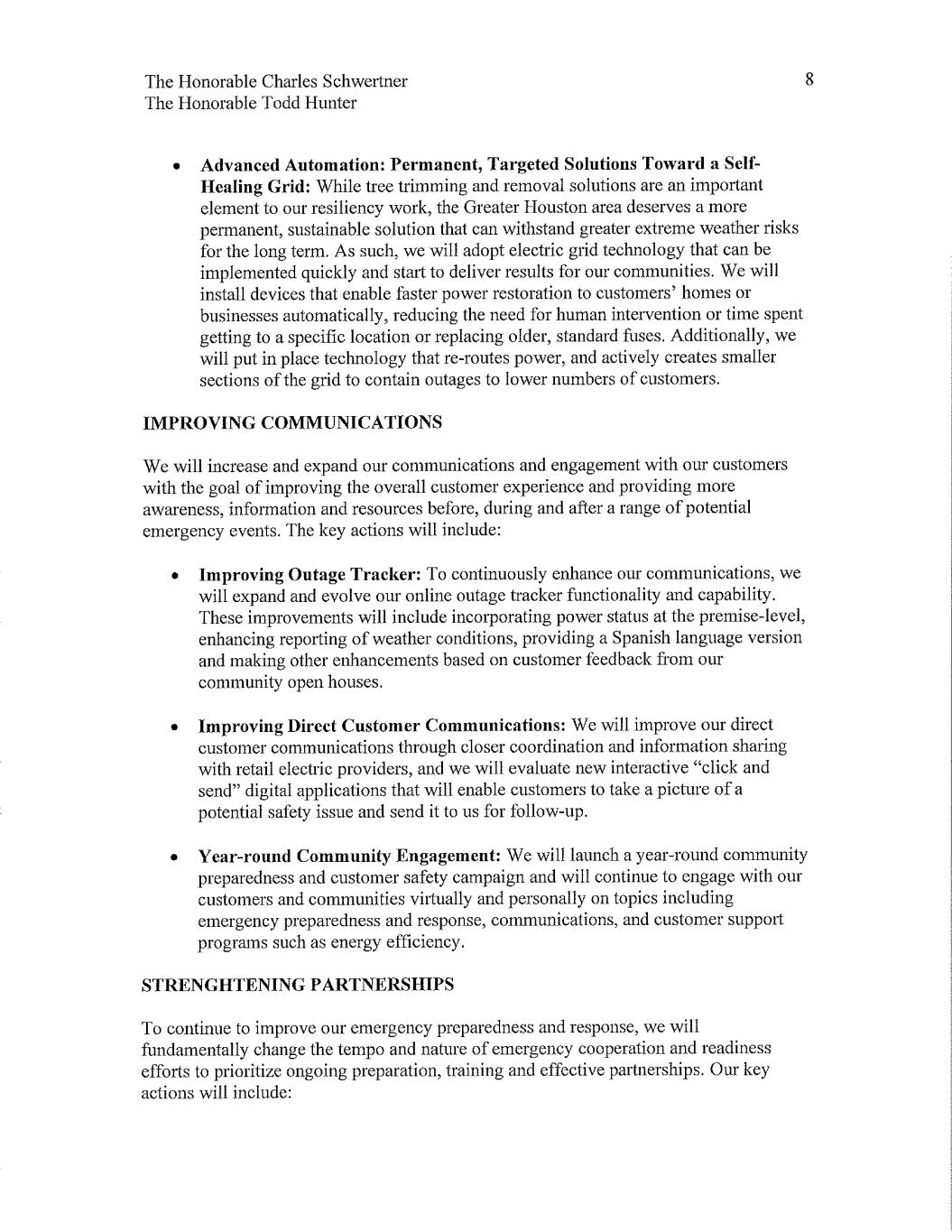 For Immediate Release For more information, contact: Communications Media.Relations@CenterPointEnergy.com • Trimming and/or removing hazardous vegetation from more than 2,000 miles of power lines (completed on 08/27/2024) In addition to this immediate resiliency work, CenterPoint has completed 39 of the 42 critical actions previously identified as part of its broader GHRI plan. To learn more about this immediate phase of progress, please visit CenterPointEnergy.com/TakingAction. Near-Term Actions (September 1 to June 1, 2025) CenterPoint will launch the near-term phase of its resiliency actions on September 1, which will include additional actions to further: 1) strengthen grid resiliency, 2) improve public and customer communications and 3) strengthen local, community and emergency partnerships in preparation for this winter and before the 2025 hurricane season. Actions, such as further hardening of the grid, a year-round campaign on safety, and joint preparedness exercises with local emergency management offices, are outlined in the attached letter to lawmakers. The company will provide a more detailed work plan and schedule for this second phase of actions by September 30. Longer-Term Actions (2026-2028) As part of its longer-term strategy, CenterPoint will also propose investing approximately $5 billion from 2026 to 2028 – the largest investment in Greater Houston infrastructure in the company’s nearly 160-year history. The mission of this longer-term plan of action is to build the most resilient coastal grid in the country by investing in a smarter grid of the future that can better withstand a broad spectrum of risks. The proposal, and the entire scope of these actions will be outlined in a new system resiliency plan that is expected to be filed with the Public Utility Commission of Texas on or before January 31, 2025. The new system resiliency plan will be shaped by feedback from customers, external experts, and other stakeholders, including elected officials and local agencies. Addressing Temporary Emergency Generation Concerns In its letter to lawmakers, the company also committed to evaluating the role of large-scale temporary emergency generation and apologized to lawmakers for not communicating more clearly to them about the cost and the limitations of such large-scale units as it worked to find solutions and protect Texans from the devastating impacts of extreme winter weather in the months following Winter Storm Uri. CenterPoint is undertaking a series of actions to address this issue, including a proposal to forego approximately $110 million in profit, which is equivalent to more than half of the equity earnings from the company’s lease of temporary emergency generation.