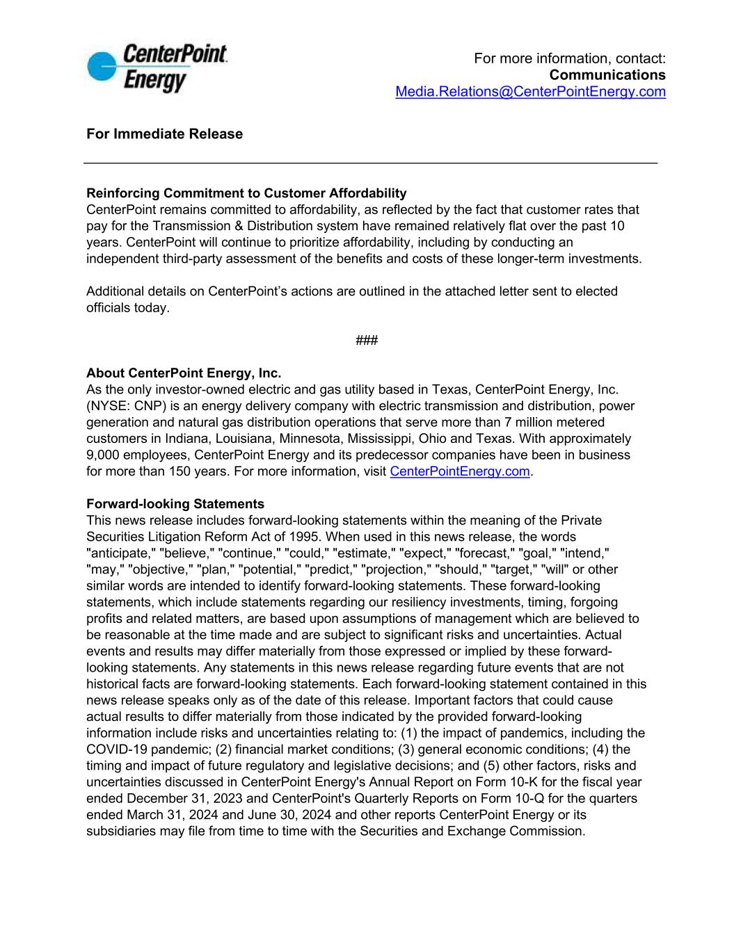 For Immediate Release For more information, contact: Communications Media.Relations@CenterPointEnergy.com Reinforcing Commitment to Customer Affordability CenterPoint remains committed to affordability, as reflected by the fact that customer rates that pay for the Transmission & Distribution system have remained relatively flat over the past 10 years. CenterPoint will continue to prioritize affordability, including by conducting an independent third-party assessment of the benefits and costs of these longer-term investments. Additional details on CenterPoint’s actions are outlined in the attached letter sent to elected officials today. ### About CenterPoint Energy, Inc. As the only investor-owned electric and gas utility based in Texas, CenterPoint Energy, Inc. (NYSE: CNP) is an energy delivery company with electric transmission and distribution, power generation and natural gas distribution operations that serve more than 7 million metered customers in Indiana, Louisiana, Minnesota, Mississippi, Ohio and Texas. With approximately 9,000 employees, CenterPoint Energy and its predecessor companies have been in business for more than 150 years. For more information, visit CenterPointEnergy.com. Forward-looking Statements This news release includes forward-looking statements within the meaning of the Private Securities Litigation Reform Act of 1995. When used in this news release, the words "anticipate," "believe," "continue," "could," "estimate," "expect," "forecast," "goal," "intend," "may," "objective," "plan," "potential," "predict," "projection," "should," "target," "will" or other similar words are intended to identify forward-looking statements. These forward-looking statements, which include statements regarding our resiliency investments, timing, forgoing profits and related matters, are based upon assumptions of management which are believed to be reasonable at the time made and are subject to significant risks and uncertainties. Actual events and results may differ materially from those expressed or implied by these forward- looking statements. Any statements in this news release regarding future events that are not historical facts are forward-looking statements. Each forward-looking statement contained in this news release speaks only as of the date of this release. Important factors that could cause actual results to differ materially from those indicated by the provided forward-looking information include risks and uncertainties relating to: (1) the impact of pandemics, including the COVID-19 pandemic; (2) financial market conditions; (3) general economic conditions; (4) the timing and impact of future regulatory and legislative decisions; and (5) other factors, risks and uncertainties discussed in CenterPoint Energy's Annual Report on Form 10-K for the fiscal year ended December 31, 2023 and CenterPoint's Quarterly Reports on Form 10-Q for the quarters ended March 31, 2024 and June 30, 2024 and other reports CenterPoint Energy or its subsidiaries may file from time to time with the Securities and Exchange Commission.