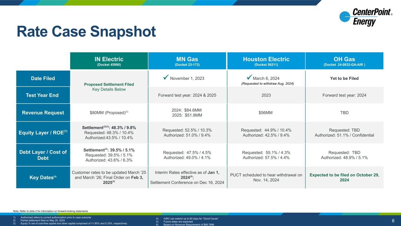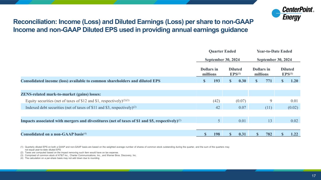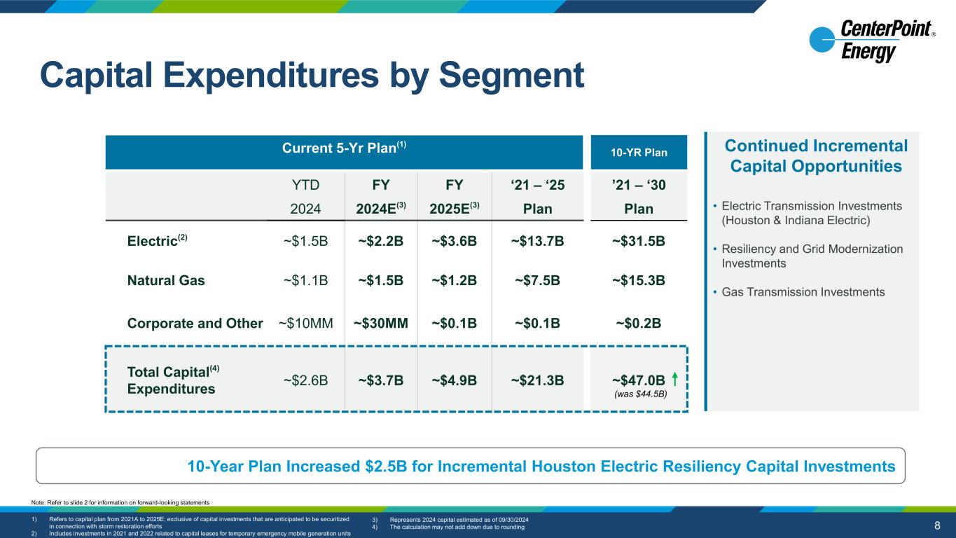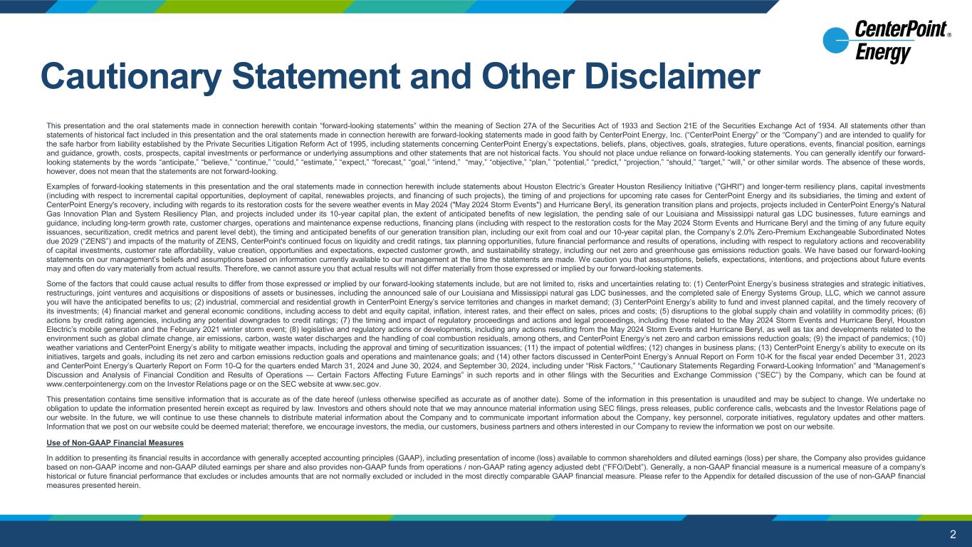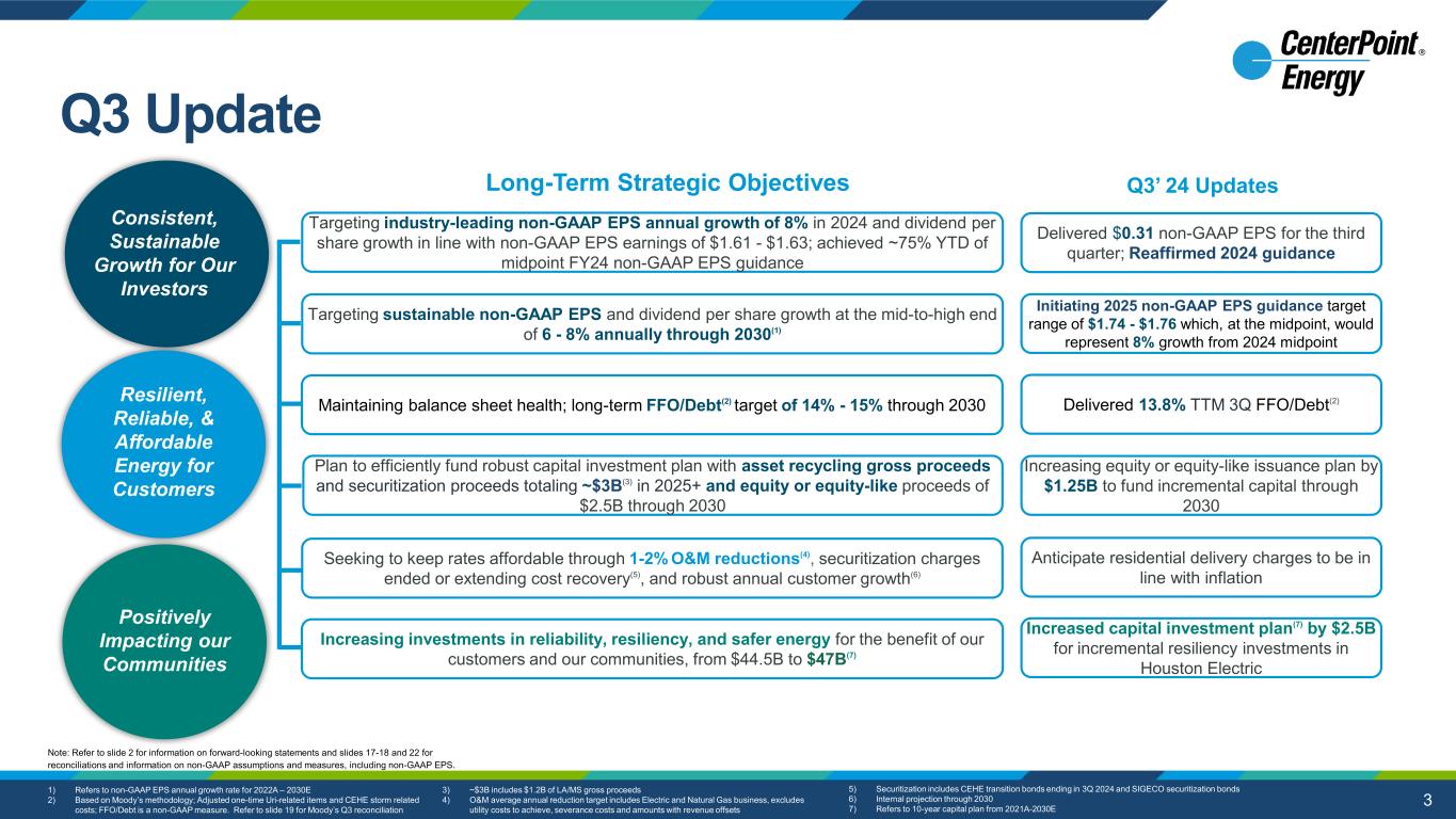 2 This presentation and the oral statements made in connection herewith contain “forward-looking statements” within the meaning of Section 27A of the Securities Act of 1933 and Section 21E of the Securities Exchange Act of 1934. All statements other than statements of historical fact included in this presentation and the oral statements made in connection herewith are forward-looking statements made in good faith by CenterPoint Energy, Inc. (“CenterPoint Energy” or the “Company”) and are intended to qualify for the safe harbor from liability established by the Private Securities Litigation Reform Act of 1995, including statements concerning CenterPoint Energy’s expectations, beliefs, plans, objectives, goals, strategies, future operations, events, financial position, earnings and guidance, growth, costs, prospects, capital investments or performance or underlying assumptions and other statements that are not historical facts. You should not place undue reliance on forward-looking statements. You can generally identify our forward- looking statements by the words “anticipate,” “believe,” “continue,” “could,” “estimate,” “expect,” “forecast,” “goal,” “intend,” “may,” “objective,” “plan,” “potential,” “predict,” “projection,” “should,” “target,” “will,” or other similar words. The absence of these words, however, does not mean that the statements are not forward-looking. Examples of forward-looking statements in this presentation and the oral statements made in connection herewith include statements about Houston Electric’s Greater Houston Resiliency Initiative ("GHRI") and longer-term resiliency plans, capital investments (including with respect to incremental capital opportunities, deployment of capital, renewables projects, and financing of such projects), the timing of and projections for upcoming rate cases for CenterPoint Energy and its subsidiaries, the timing and extent of CenterPoint Energy's recovery, including with regards to its restoration costs for the severe weather events in May 2024 ("May 2024 Storm Events") and Hurricane Beryl, its generation transition plans and projects, projects included in CenterPoint Energy's Natural Gas Innovation Plan and System Resiliency Plan, and projects included under its 10-year capital plan, the extent of anticipated benefits of new legislation, the pending sale of our Louisiana and Mississippi natural gas LDC businesses, future earnings and guidance, including long-term growth rate, customer charges, operations and maintenance expense reductions, financing plans (including with respect to the restoration costs for the May 2024 Storm Events and Hurricane Beryl and the timing of any future equity issuances, securitization, credit metrics and parent level debt), the timing and anticipated benefits of our generation transition plan, including our exit from coal and our 10-year capital plan, the Company’s 2.0% Zero-Premium Exchangeable Subordinated Notes due 2029 (“ZENS”) and impacts of the maturity of ZENS, CenterPoint's continued focus on liquidity and credit ratings, tax planning opportunities, future financial performance and results of operations, including with respect to regulatory actions and recoverability of capital investments, customer rate affordability, value creation, opportunities and expectations, expected customer growth, and sustainability strategy, including our net zero and greenhouse gas emissions reduction goals. We have based our forward-looking statements on our management’s beliefs and assumptions based on information currently available to our management at the time the statements are made. We caution you that assumptions, beliefs, expectations, intentions, and projections about future events may and often do vary materially from actual results. Therefore, we cannot assure you that actual results will not differ materially from those expressed or implied by our forward-looking statements. Some of the factors that could cause actual results to differ from those expressed or implied by our forward-looking statements include, but are not limited to, risks and uncertainties relating to: (1) CenterPoint Energy’s business strategies and strategic initiatives, restructurings, joint ventures and acquisitions or dispositions of assets or businesses, including the announced sale of our Louisiana and Mississippi natural gas LDC businesses, and the completed sale of Energy Systems Group, LLC, which we cannot assure you will have the anticipated benefits to us; (2) industrial, commercial and residential growth in CenterPoint Energy’s service territories and changes in market demand; (3) CenterPoint Energy’s ability to fund and invest planned capital, and the timely recovery of its investments; (4) financial market and general economic conditions, including access to debt and equity capital, inflation, interest rates, and their effect on sales, prices and costs; (5) disruptions to the global supply chain and volatility in commodity prices; (6) actions by credit rating agencies, including any potential downgrades to credit ratings; (7) the timing and impact of regulatory proceedings and actions and legal proceedings, including those related to the May 2024 Storm Events and Hurricane Beryl, Houston Electric’s mobile generation and the February 2021 winter storm event; (8) legislative and regulatory actions or developments, including any actions resulting from the May 2024 Storm Events and Hurricane Beryl, as well as tax and developments related to the environment such as global climate change, air emissions, carbon, waste water discharges and the handling of coal combustion residuals, among others, and CenterPoint Energy’s net zero and carbon emissions reduction goals; (9) the impact of pandemics; (10) weather variations and CenterPoint Energy’s ability to mitigate weather impacts, including the approval and timing of securitizat