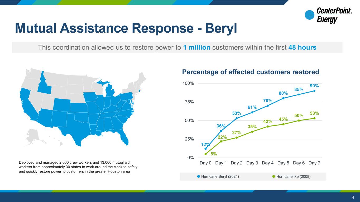 3 Consistent, Sustainable Growth for Our Investors Positively Impacting our Communities Resilient, Reliable, & Affordable Energy for Customers Targeting industry-leading non-GAAP EPS annual growth of 8% in 2024 and dividend per share growth in line with non-GAAP EPS earnings of $1.61 - $1.63; achieved ~75% YTD of midpoint FY24 non-GAAP EPS guidance Long-Term Strategic Objectives Q3’ 24 Updates Delivered $0.31 non-GAAP EPS for the third quarter; Reaffirmed 2024 guidance Maintaining balance sheet health; long-term FFO/Debt(2) target of 14% - 15% through 2030 Initiating 2025 non-GAAP EPS guidance target range of $1.74 - $1.76 which, at the midpoint, would represent 8% growth from 2024 midpoint Plan to efficiently fund robust capital investment plan with asset recycling gross proceeds and securitization proceeds totaling ~$3B(3) in 2025+ and equity or equity-like proceeds of $2.5B through 2030 Increasing equity or equity-like issuance plan by $1.25B to fund incremental capital through 2030 Seeking to keep rates affordable through 1-2% O&M reductions(4), securitization charges ended or extending cost recovery(5), and robust annual customer growth(6) Anticipate residential delivery charges to be in line with inflation Increasing investments in reliability, resiliency, and safer energy for the benefit of our customers and our communities, from $44.5B to $47B(7) Increased capital investment plan(7) by $2.5B for incremental resiliency investments in Houston Electric 1) Refers to non-GAAP EPS annual growth rate for 2022A – 2030E 2) Based on Moody’s methodology; Adjusted one-time Uri-related items and CEHE storm related costs; FFO/Debt is a non-GAAP measure. Refer to slide 19 for Moody’s Q3 reconciliation 3) ~$3B includes $1.2B of LA/MS gross proceeds 4) O&M average annual reduction target includes Electric and Natural Gas business, excludes utility costs to achieve, severance costs and amounts with revenue offsets 5) Securitization includes CEHE transition bonds ending in 3Q 2024 and SIGECO securitization bonds 6) Internal projection through 2030 7) Refers to 10-year capital plan from 2021A-2030E Note: Refer to slide 2 for information on forward-looking statements and slides 17-18 and 22 for reconciliations and information on non-GAAP assumptions and measures, including non-GAAP EPS. Delivered 13.8% TTM 3Q FFO/Debt(2) Targeting sustainable non-GAAP EPS and dividend per share growth at the mid-to-high end of 6 - 8% annually through 2030(1) Q3 Update