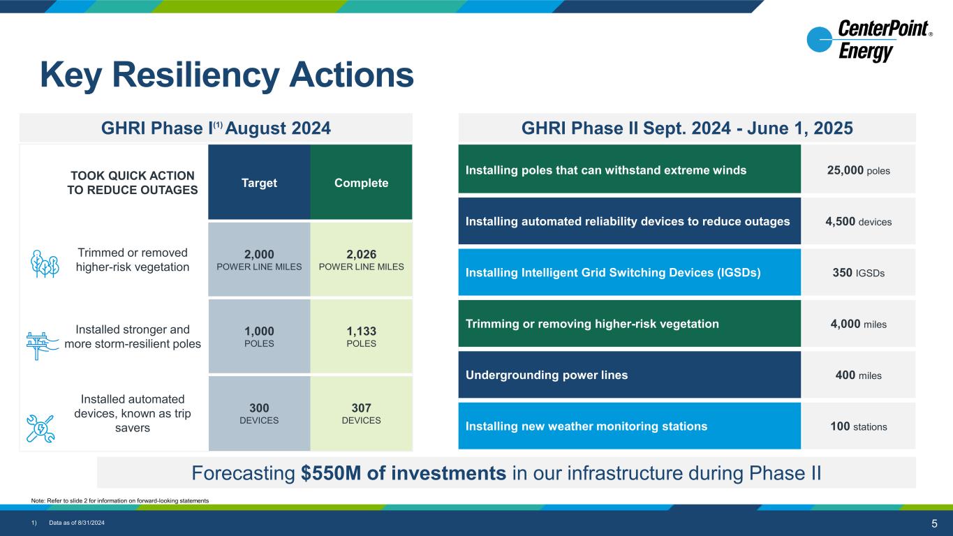 4 12% 36% 53% 61% 70% 80% 85% 90% 5% 22% 27% 35% 42% 45% 50% 53% 0% 25% 50% 75% 100% Day 0 Day 1 Day 2 Day 3 Day 4 Day 5 Day 6 Day 7 Hurricane Beryl (2024) Hurricane Ike (2008) Percentage of affected customers restored Deployed and managed 2,000 crew workers and 13,000 mutual aid workers from approximately 30 states to work around the clock to safely and quickly restore power to customers in the greater Houston area This coordination allowed us to restore power to 1 million customers within the first 48 hours Mutual Assistance Response - Beryl