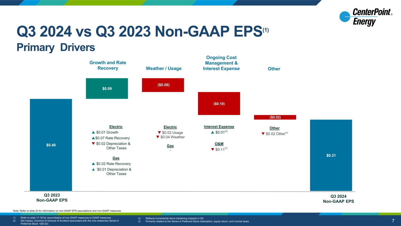 6 IN Electric (Docket 45990) MN Gas (Docket 23-173) Houston Electric (Docket 56211) OH Gas (Docket 24-0832-GA-AIR ) Date Filed Proposed Settlement Filed Key Details Below November 1, 2023 March 6, 2024 Yet to be Filed Test Year End Forward test year: 2024 & 2025 2023 Forward test year: 2024 Revenue Request $80MM (Proposed)(2) 2024: $84.6MM 2025: $51.8MM $56MM TBD Equity Layer / ROE(1) Settlement(2)(3): 48.3% / 9.8% Requested: 48.3% / 10.4% Authorized:43.5% / 10.4% Requested: 52.5% / 10.3% Authorized: 51.0% / 9.4% Requested: 44.9% / 10.4% Authorized: 42.5% / 9.4% Requested: TBD Authorized: 51.1% / Confidential Debt Layer / Cost of Debt Settlement(2): 39.5% / 5.1% Requested: 39.5% / 5.1% Authorized: 43.6% / 6.3% Requested: 47.5% / 4.5% Authorized: 49.0% / 4.1% Requested: 55.1% / 4.3% Authorized: 57.5% / 4.4% Requested: TBD Authorized: 48.9% / 5.1% Key Dates(5) Customer rates to be updated March ’25 and March ’26; Final Order on Feb 3, 2025(4) Interim Rates effective as of Jan 1, 2024(6); Settlement Conference on Dec 16, 2024 PUCT scheduled to hear withdrawal on Nov. 14, 2024 Expected to be filed on October 29, 2024  1) Authorized refers to current authorization prior to case outcome 2) Partial settlement filed on May 20, 2024 3) Equity % net of cost-free capital and other capital comprised of 11.90% and 0.33%, respectively 4) IURC can extend up to 60 days for “Good Cause” 5) Future dates are expected 6) Based on Revenue Requirement of $68.7MM Note: Refer to slide 2 for information on forward-looking statements  (Requested to withdraw Aug. 2024) Rate Case Snapshot