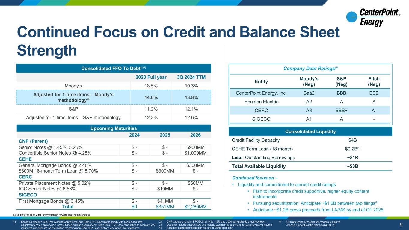 8 YTD FY FY ‘21 – ‘25 ’21 – ‘30 2024 2024E(3) 2025E(3) Plan Plan Electric(2) ~$1.5B ~$2.2B ~$3.6B ~$13.7B ~$31.5B Natural Gas ~$1.1B ~$1.5B ~$1.2B ~$7.5B ~$15.3B Corporate and Other ~$10MM ~$30MM ~$0.1B ~$0.1B ~$0.2B Total Capital(4) Expenditures ~$2.6B ~$3.7B ~$4.9B ~$21.3B ~$47.0B Current 5-Yr Plan(1) 10-YR Plan Continued Incremental Capital Opportunities • Electric Transmission Investments (Houston & Indiana Electric) • Resiliency and Grid Modernization Investments • Gas Transmission Investments 10-Year Plan Increased $2.5B for Incremental Houston Electric Resiliency Capital Investments 1) Refers to capital plan from 2021A to 2025E; exclusive of capital investments that are anticipated to be securitized in connection with storm restoration efforts 2) Includes investments in 2021 and 2022 related to capital leases for temporary emergency mobile generation units 3) Represents 2024 capital estimated as of 09/30/2024 4) The calculation may not add down due to rounding Note: Refer to slide 2 for information on forward-looking statements (was $44.5B) Capital Expenditures by Segment