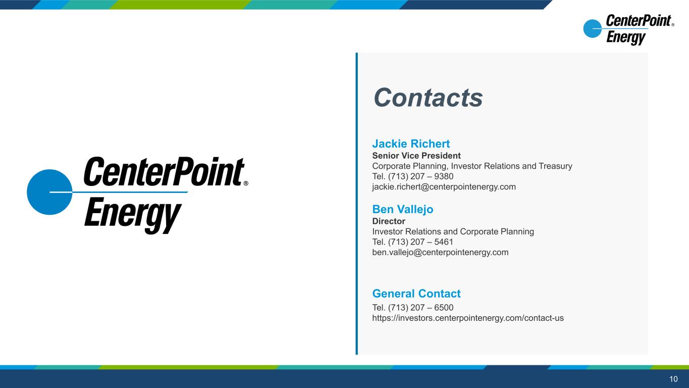 9 Entity Moody’s (Neg) S&P (Neg) Fitch (Neg) CenterPoint Energy, Inc. Baa2 BBB BBB Houston Electric A2 A A CERC A3 BBB+ A- SIGECO A1 A - Company Debt Ratings(3)Consolidated FFO To Debt(1)(2) 2023 Full year 3Q 2024 TTM Moody’s 18.5% 10.3% Adjusted for 1-time items – Moody’s methodology(2) 14.0% 13.8% S&P 11.2% 12.1% Adjusted for 1-time items – S&P methodology 12.3% 12.6% Continued focus on – • Liquidity and commitment to current credit ratings • Plan to incorporate credit supportive, higher equity content instruments • Pursuing securitization; Anticipate ~$1.6B between two filings(5) • Anticipate ~$1.2B gross proceeds from LA/MS by end of Q1 2025 Upcoming Maturities 2024 2025 2026 CNP (Parent) Senior Notes @ 1.45%, 5.25% $ - $ - $900MM Convertible Senior Notes @ 4.25% $ - $ - $1,000MM CEHE General Mortgage Bonds @ 2.40% $ - $ - $300MM $300M 18-month Term Loan @ 5.70% $ - $300MM $ - CERC Private Placement Notes @ 5.02% $ - $ - $60MM IGC Senior Notes @ 6.53% $ - $10MM $ - SIGECO First Mortgage Bonds @ 3.45% $ - $41MM $ - Total $0 $351MM $2,260MM Consolidated Liquidity Credit Facility Capacity $4B CEHE Term Loan (18 month) $0.2B(4) Less: Outstanding Borrowings ~$1B Total Available Liquidity ~$3B 1) Based on Moody’s CFO Pre-Working Capital/Debt and S&P’s FFO/Debt methodology with certain one-time adjustments noted on slide 22; targets based on plan assumptions; See slides 19-20 for reconciliation to nearest GAAP measures and slide 22 for information regarding non-GAAP EPS assumptions and non-GAAP measures 2) CNP targets long-term FFO/Debt of 14% - 15% thru 2030 using Moody’s methodology 3) Does not include Vectren LLC and Indiana Gas ratings as they’re not currently active issuers 4) Assumes exercise of accordion feature in CEHE term loan Note: Refer to slide 2 for information on forward-looking statements Continued Focus on Credit and Balance Sheet Strength 5) Ultimate timing of receipt of proceeds subject to change. Currently anticipating Q3 & Q4 ‘25