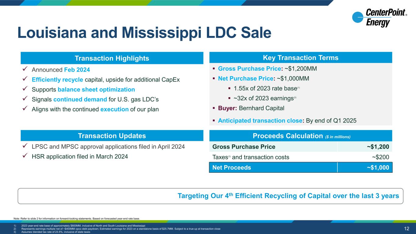12 Targeting Our 4th Efficient Recycling of Capital over the last 3 years Transaction Highlights  Announced Feb 2024  Efficiently recycle capital, upside for additional CapEx  Supports balance sheet optimization  Signals continued demand for U.S. gas LDC’s  Aligns with the continued execution of our plan Key Transaction Terms  Gross Purchase Price: ~$1,200MM  Net Purchase Price: ~$1,000MM  1.55x of 2023 rate base(1)  ~32x of 2023 earnings(2)  Buyer: Bernhard Capital  Anticipated transaction close: By end of Q1 2025 Proceeds Calculation ($ in millions) Gross Purchase Price ~$1,200 Taxes(3) and transaction costs ~$200 Net Proceeds ~$1,000 Transaction Updates  LPSC and MPSC approval applications filed in April 2024  HSR application filed in March 2024 1) 2023 year-end rate base of approximately $800MM, inclusive of North and South Louisiana and Mississippi 2) Represents earnings multiple net of ~$400MM opco debt paydown; Estimated earnings for 2023 on a standalone basis of $25.7MM. Subject to a true-up at transaction close 3) Assumes blended tax rate of 23.5%, inclusive of state taxes Note: Refer to slide 2 for information on forward-looking statements. Based on forecasted year-end rate base. Louisiana and Mississippi LDC Sale