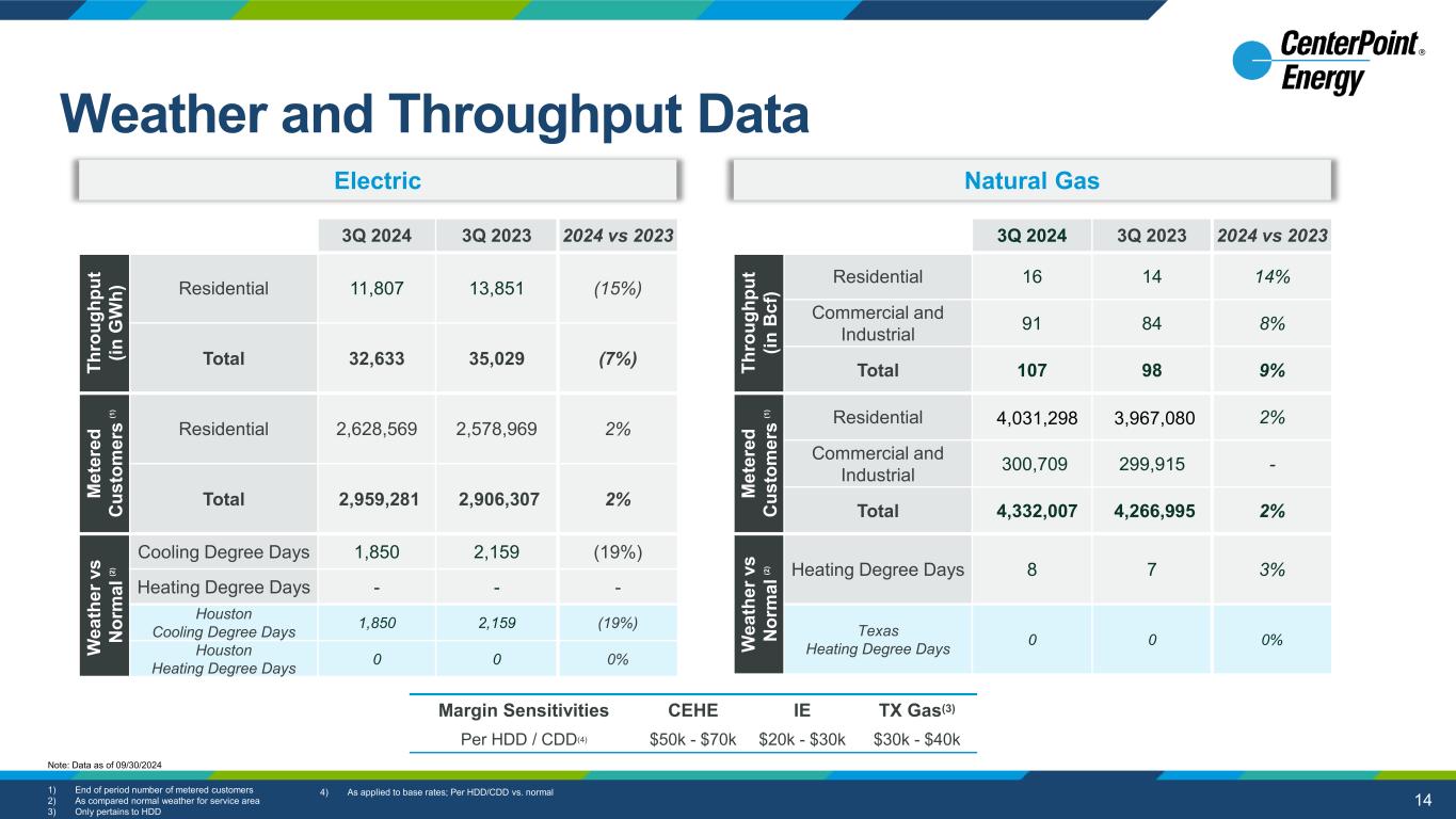13 Regulatory Highlights Stakeholder Benefits Existing Mechanisms for timely recovery of major storm costs Reasonable cost recovery minimizes customer impact and earnings volatility Winter storm gas cost almost fully recovered; MN only remaining state(3) Reasonable cost recovery minimizes customer impact and earnings volatility Generation transition proceedings in Indiana on plan Energy transition good for communities Over 80% of 10-year Capital Plan expected to be recoverable through interim mechanisms (2) (2) Interim Mechanisms ~80% Interim mechanisms with CPCN required ~5% Rate case with forward test year ~10% Traditional rate case ~5% (1) (2) 1) Includes capital expenditures that are expected to be recovered through interim mechanisms but requires approval of Certificate of Public Convenience and Necessity 2) Includes capital expenditures that are expected to be recovered through interim mechanisms and riders. Excludes capital expenditures included in footnote 1 3) Refers to CenterPoint’s recovery of extraordinary gas costs associated with Winter Storm Uri; ~$150M remaining to be collected Note: Refer to slide 2 for information on forward-looking statements. …. Recovery through established regulatory mechanisms Capital Plan & Regulatory Mechanisms