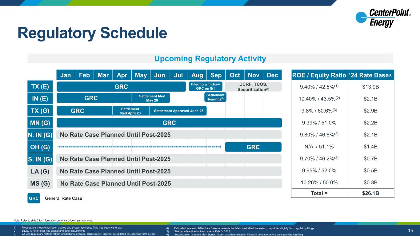 14 aaaaaaaaa Electric Natural Gas 3Q 2024 3Q 2023 2024 vs 2023 Th ro ug hp ut (in G W h) Residential 11,807 13,851 (15%) Total 32,633 35,029 (7%) M et er ed C us to m er s (1 ) Residential 2,628,569 2,578,969 2% Total 2,959,281 2,906,307 2% W ea th er v s N or m al (2 ) Cooling Degree Days 1,850 2,159 (19%) Heating Degree Days - - - Houston Cooling Degree Days 1,850 2,159 (19%) Houston Heating Degree Days 0 0 0% 3Q 2024 3Q 2023 2024 vs 2023 Th ro ug hp ut (in B cf ) Residential 16 14 14% Commercial and Industrial 91 84 8% Total 107 98 9% M et er ed C us to m er s (1 ) Residential 4,031,298 3,967,080 2% Commercial and Industrial 300,709 299,915 - Total 4,332,007 4,266,995 2% W ea th er v s N or m al (2 ) Heating Degree Days 8 7 3% Texas Heating Degree Days 0 0 0% Margin Sensitivities CEHE IE TX Gas(3) Per HDD / CDD(4) $50k - $70k $20k - $30k $30k - $40k 1) End of period number of metered customers 2) As compared normal weather for service area 3) Only pertains to HDD 4) As applied to base rates; Per HDD/CDD vs. normal Note: Data as of 09/30/2024 Weather and Throughput Data