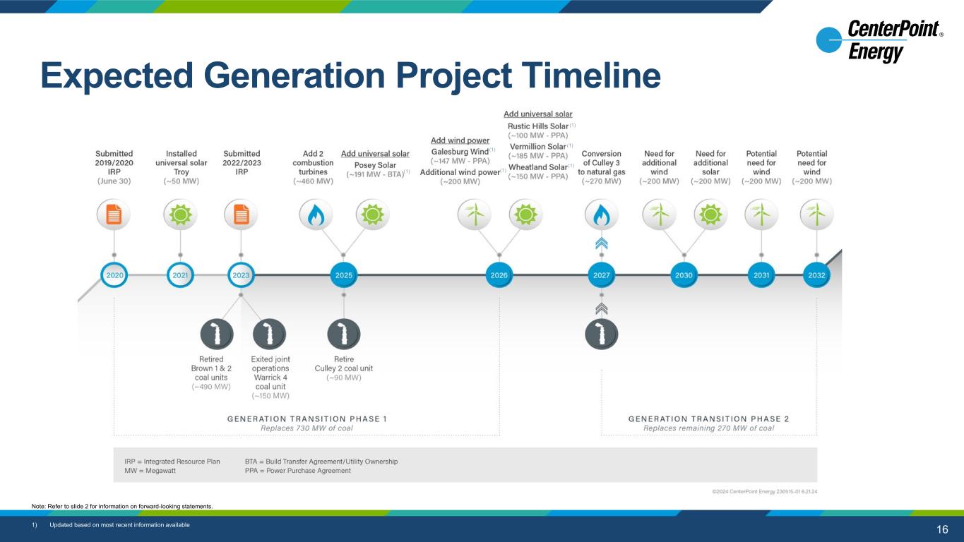 15 aaaaaaaaa Jan Feb Mar Apr May Jun Jul Aug Sep Oct Nov Dec TX (E) IN (E) TX (G) MN (G) N. IN (G) OH (G) S. IN (G) LA (G) MS (G) No Rate Case Planned Until Post-2025 No Rate Case Planned Until Post-2025 ROE / Equity Ratio ’24 Rate Base(4) 9.40% / 42.5%(1) $13.9B 10.40% / 43.5%(2) $2.1B 9.8% / 60.6%(3) $2.9B 9.39% / 51.0% $2.2B 9.80% / 46.8%(2) $2.1B N/A / 51.1% $1.4B 9.70% / 46.2%(2) $0.7B 9.95% / 52.0% $0.5B 10.26% / 50.0% $0.3B Total = $26.1B Upcoming Regulatory Activity No Rate Case Planned Until Post-2025 No Rate Case Planned Until Post-2025 GRC GRC GRC GRC General Rate Case GRC Settlement Hearings(5) GRC Settlement filed April 23 Settlement filed May 20 Settlement Approved June 25 Filed to withdraw GRC on 8/1 1) Procedural schedule has been abated and system resiliency filing has been withdrawn 2) Equity % net of cost-free capital and other adjustments 3) TX Gas regulatory metrics reflect jurisdictional average. ROE/Equity Ratio will be updated in December of this year 4) Estimated year-end 2024 Rate Base represents the latest available information; may differ slightly from regulatory filings 5) Statutory deadline for final order is Feb. 3, 2025 6) Securitization is for the May Storms; Storm cost determination filing will be made before the securitization filing Note: Refer to slide 2 for information on forward-looking statements. DCRF, TCOS, Securitization(6) Regulatory Schedule