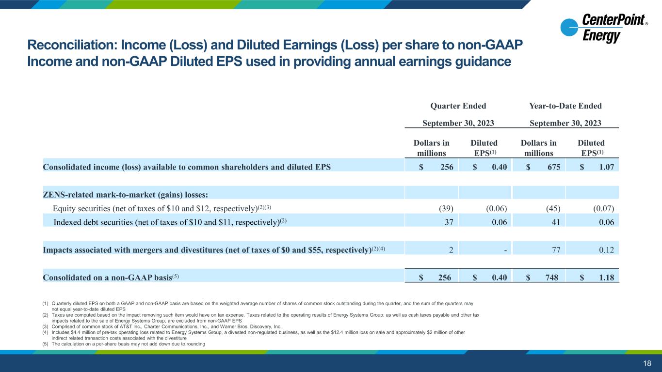17 aaaaaaaaa Quarter Ended Year-to-Date Ended September 30, 2024 September 30, 2024 Dollars in millions Diluted EPS(1) Dollars in millions Diluted EPS(1) Consolidated income (loss) available to common shareholders and diluted EPS $ 193 $ 0.30 $ 771 $ 1.20 ZENS-related mark-to-market (gains) losses: Equity securities (net of taxes of $12 and $1, respectively)(2)(3) (42) (0.07) 9 0.01 Indexed debt securities (net of taxes of $11 and $3, respectively)(2) 42 0.07 (11) (0.02) Impacts associated with mergers and divestitures (net of taxes of $1 and $5, respectively)(2) 5 0.01 13 0.02 Consolidated on a non-GAAP basis(4) $ 198 $ 0.31 $ 782 $ 1.22 (1) Quarterly diluted EPS on both a GAAP and non-GAAP basis are based on the weighted average number of shares of common stock outstanding during the quarter, and the sum of the quarters may not equal year-to-date diluted EPS (2) Taxes are computed based on the impact removing such item would have on tax expense. (3) Comprised of common stock of AT&T Inc., Charter Communications, Inc., and Warner Bros. Discovery, Inc. (4) The calculation on a per-share basis may not add down due to rounding Reconciliation: Income (Loss) and Diluted Earnings (Loss) per share to non-GAAP Income and non-GAAP Diluted EPS used in providing annual earnings guidance
